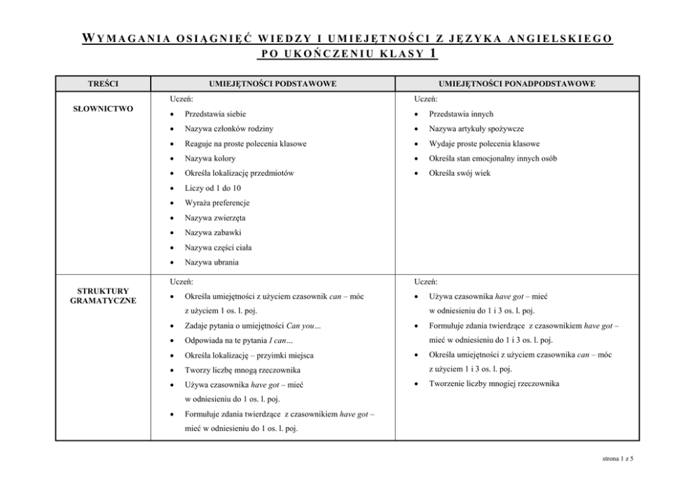 WYMAGANIA OSIĄGNIĘĆ WIEDZY I UMIEJĘTNOŚCI Z JĘZYKA ANGIELSKIEGO PO UKOŃCZENIU KLASY 1 TREŚCI SŁOWNICTWO STRUKTURY GRAMATYCZNE UMIEJĘTNOŚCI PODSTAWOWE UMIEJĘTNOŚCI PONADPODSTAWOWE Uczeń: Uczeń: Przedstawia siebie Przedstawia innych Nazywa członków rodziny Nazywa artykuły spożywcze Reaguje na proste polecenia klasowe Wydaje proste polecenia klasowe Nazywa kolory Określa stan emocjonalny innych osób Określa lokalizację przedmiotów Określa swój wiek Liczy od 1 do 10 Wyraża preferencje Nazywa zwierzęta Nazywa zabawki Nazywa części ciała Nazywa ubrania Uczeń: Uczeń: Określa umiejętności z użyciem czasownik can – móc z użyciem 1 os. l. poj. Zadaje pytania o umiejętności Can you… Odpowiada na te pytania I can… Określa lokalizację – przyimki miejsca Tworzy liczbę mnogą rzeczownika Używa czasownika have got – mieć Używa czasownika have got – mieć w odniesieniu do 1 i 3 os. l. poj. Formułuje zdania twierdzące z czasownikiem have got – mieć w odniesieniu do 1 i 3 os. l. poj. Określa umiejętności z użyciem czasownika can – móc z użyciem 1 i 3 os. l. poj. Tworzenie liczby mnogiej rzeczownika w odniesieniu do 1 os. l. poj. Formułuje zdania twierdzące z czasownikiem have got – mieć w odniesieniu do 1 os. l. poj. strona 1 z 5 WYMAGANIA OSIĄGNIĘĆ WIEDZY I UMIEJĘTNOŚCI Z JĘZYKA ANGIELSKIEGO PO UKOŃCZENIU KLASY 2 TREŚCI SŁOWNICTWO UMIEJĘTNOŚCI PODSTAWOWE Nazywanie przyborów szkolnych Liczebniki od 1 do 10 Wydawanie i reagowanie na proste polecenia klasowe Nazywanie członków rodziny Nazywanie kolorów Nazywanie zabawek Nazywanie pomieszczeń domowych Nazywanie mebli Tworzenie liczby mnogiej rzeczownika Opisywanie czynności wykonywanych przez zwierzęta Opisywanie ubrań przy użyciu kolorów Nazywanie artykułów spożywczych Wyrażanie preferencji dotyczących jedzenia Nazywanie ulubionych czynności Określanie położenia przedmiotu UMIEJĘTNOŚCI PONADPODSTAWOWE Opisywanie przyborów szkolnych Budowanie krótkiego opisu członków rodziny Opisywanie przedmiotów z użyciem kolorów Uzupełnianie tekstu brakującymi słówkami Czytanie tekstu ze zrozumieniem Porównywanie dwóch podobnych ilustracji Uzupełnianie tekstu brakującymi wyrazami strona 2 z 5 TREŚCI STRUKTURY GRAMATYCZNE UMIEJĘTNOŚCI PODSTAWOWE Budowanie pytań Who is this? i odpowiadanie na nie Budowanie pytania Whose doll is it? i odpowiadanie na nie odpowiedzi Tworzenie liczby mnogiej rzeczownika Budowanie pytań Where is he? i udzielanie na nie odpowiedzi Budowanie zdań z użyciem przymiotników opisujących wielkość Budowanie zdań twierdzących z użyciem konstrukcji I have got Budowanie pytań z czasownikiem can i udzielanie na nie odpowiedzi Budowanie zdań twierdzących z użyciem czasownika like Budowanie zdań twierdzących z użyciem czasu Present Simple UMIEJĘTNOŚCI PONADPODSTAWOWE Budowanie zdań z użyciem zaimków this/that Budowanie zdań z użyciem konstrukcji There is/There are Budowanie zdań przeczących i pytających z użyciem konstrukcji haven’t got, Have you got? Tworzenie nieregularnej liczby mnogiej rzeczownika Budowanie zdań przeczących pytających z użyciem czasownika like Budowanie zdań przeczących pytających z użyciem czasu Present Simple strona 3 z 5 WYMAGANIA OSIĄGNIĘĆ WIEDZY I UMIEJĘTNOŚCI Z JĘZYKA ANGIELSKIEGO PO UKOŃCZENIU KLASY 3 TREŚCI SŁOWNICTWO STRUKTURY GRAMATYCZNE UMIEJĘTNOŚCI PODSTAWOWE UMIEJĘTNOŚCI PONADPODSTAWOWE Uczeń: nazywa przymiotniki opisujące wygląd osoby liczy od 1 do 100 nazywa sporty nazywa sklepy i ich rodzaje nazywa codzienne czynności posługuje się godzinami i zegarem nazywa artykuły spożywcze podaje ceny do artykułów spożywczych nazywa dzikie zwierzęta opisuje spędzanie wolnego czasu nazywa hobby Uczeń: opisuje wygląd osoby opisuje własny pokoju opisuje ilustrację opisuje swój dzień Uczeń: odmienia czasownik “być” w czasie teraźniejszym buduje proste zdania z użyciem tego czasownika odmienia czasownika have got w czasie teraźniejszym buduje proste zdań z użyciem tego czasownika opisuje położenia przedmiotu odmienia czasownik can w czasie teraźniejszym buduje zdania z użyciem tego czasownika buduje zdania twierdzące z użyciem czasu Present Continuous buduje zdania z okolicznikami miejsca buduje zdania z użyciem czasu Present Simple w 3 os. lp umie użyć dopełniacz saksoński w zdaniu buduje zdania z okolicznikami czasu buduje zdania twierdzące z użyciem czasownika Uczeń: buduje zdania przeczące i pytające z użyciem czasu Present Continuous buduje zdania przeczące i pytające z użyciem czasu Present Simple w 3 os. lp. zadaje pytania do rzeczowników policzalnych i niepoliczalnych i udziela na nie odpowiedzi zna nieregularną liczbę mnogą rzeczownika strona 4 z 5 TREŚCI UMIEJĘTNOŚCI PODSTAWOWE UMIEJĘTNOŚCI PONADPODSTAWOWE have got buduje regularną liczbę mnogą rzeczownika buduje zdania twierdzące z użyciem czasu Present Simple i Present Continuous buduje pytania szczegółowe z użyciem słówek pytajnych strona 5 z 5