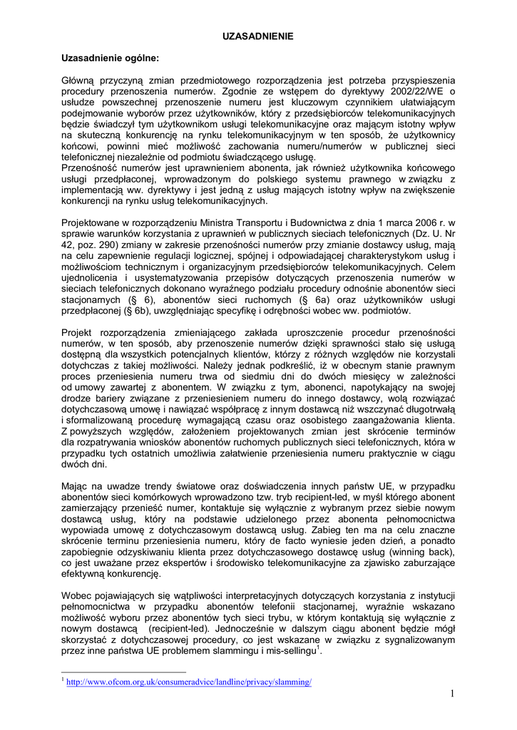UZASADNIENIE Uzasadnienie ogólne: Główną przyczyną zmian przedmiotowego rozporządzenia jest potrzeba przyspieszenia procedury przenoszenia numerów. Zgodnie ze wstępem do dyrektywy 2002/22/WE o usłudze powszechnej przenoszenie numeru jest kluczowym czynnikiem ułatwiającym podejmowanie wyborów przez użytkowników, który z przedsiębiorców telekomunikacyjnych będzie świadczył tym użytkownikom usługi telekomunikacyjne oraz mającym istotny wpływ na skuteczną konkurencję na rynku telekomunikacyjnym w ten sposób, że użytkownicy końcowi, powinni mieć możliwość zachowania numeru/numerów w publicznej sieci telefonicznej niezależnie od podmiotu świadczącego usługę. Przenośność numerów jest uprawnieniem abonenta, jak również użytkownika końcowego usługi przedpłaconej, wprowadzonym do polskiego systemu prawnego w związku z implementacją ww. dyrektywy i jest jedną z usług mających istotny wpływ na zwiększenie konkurencji na rynku usług telekomunikacyjnych. Projektowane w rozporządzeniu Ministra Transportu i Budownictwa z dnia 1 marca 2006 r. w sprawie warunków korzystania z uprawnień w publicznych sieciach telefonicznych (Dz. U. Nr 42, poz. 290) zmiany w zakresie przenośności numerów przy zmianie dostawcy usług, mają na celu zapewnienie regulacji logicznej, spójnej i odpowiadającej charakterystykom usług i możliwościom technicznym i organizacyjnym przedsiębiorców telekomunikacyjnych. Celem ujednolicenia i usystematyzowania przepisów dotyczących przenoszenia numerów w sieciach telefonicznych dokonano wyraźnego podziału procedury odnośnie abonentów sieci stacjonarnych (§ 6), abonentów sieci ruchomych (§ 6a) oraz użytkowników usługi przedpłaconej (§ 6b), uwzględniając specyfikę i odrębności wobec ww. podmiotów. Projekt rozporządzenia zmieniającego zakłada uproszczenie procedur przenośności numerów, w ten sposób, aby przenoszenie numerów dzięki sprawności stało się usługą dostępną dla wszystkich potencjalnych klientów, którzy z różnych względów nie korzystali dotychczas z takiej możliwości. Należy jednak podkreślić, iż w obecnym stanie prawnym proces przeniesienia numeru trwa od siedmiu dni do dwóch miesięcy w zależności od umowy zawartej z abonentem. W związku z tym, abonenci, napotykający na swojej drodze bariery związane z przeniesieniem numeru do innego dostawcy, wolą rozwiązać dotychczasową umowę i nawiązać współpracę z innym dostawcą niż wszczynać długotrwałą i sformalizowaną procedurę wymagającą czasu oraz osobistego zaangażowania klienta. Z powyższych względów, założeniem projektowanych zmian jest skrócenie terminów dla rozpatrywania wniosków abonentów ruchomych publicznych sieci telefonicznych, która w przypadku tych ostatnich umożliwia załatwienie przeniesienia numeru praktycznie w ciągu dwóch dni. Mając na uwadze trendy światowe oraz doświadczenia innych państw UE, w przypadku abonentów sieci komórkowych wprowadzono tzw. tryb recipient-led, w myśl którego abonent zamierzający przenieść numer, kontaktuje się wyłącznie z wybranym przez siebie nowym dostawcą usług, który na podstawie udzielonego przez abonenta pełnomocnictwa wypowiada umowę z dotychczasowym dostawcą usług. Zabieg ten ma na celu znaczne skrócenie terminu przeniesienia numeru, który de facto wyniesie jeden dzień, a ponadto zapobiegnie odzyskiwaniu klienta przez dotychczasowego dostawcę usług (winning back), co jest uważane przez ekspertów i środowisko telekomunikacyjne za zjawisko zaburzające efektywną konkurencję. Wobec pojawiających się wątpliwości interpretacyjnych dotyczących korzystania z instytucji pełnomocnictwa w przypadku abonentów telefonii stacjonarnej, wyraźnie wskazano możliwość wyboru przez abonentów tych sieci trybu, w którym kontaktują się wyłącznie z nowym dostawcą (recipient-led). Jednocześnie w dalszym ciągu abonent będzie mógł skorzystać z dotychczasowej procedury, co jest wskazane w związku z sygnalizowanym przez inne państwa UE problemem slammingu i mis-sellingu1. 1 http://www.ofcom.org.uk/consumeradvice/landline/privacy/slamming/ 1 Ponadto, w celu przyspieszenia procedury przenoszenia numeru wprowadzono możliwość rozwiązania umowy bez zachowania terminów wypowiedzenia z zastrzeżeniem, iż skorzystanie z tego uprawnienia wiąże się z obowiązkiem poniesienia przez abonenta stosownych kosztów (§6 ust. 11, §6a ust. 11). Uzasadnienie szczegółowe: 1. Przeniesienie więcej niż jednego numeru Projekt rozporządzenia wprowadza możliwość przeniesienia kilku numerów jednocześnie. W takim przypadku abonent lub użytkownik usługi przedpłaconej we wniosku wskazuje wnioskowane numery lub oznacza numer umowy o świadczenie usług telekomunikacyjnych z dotychczasowym dostawcą, jeżeli zamierza przenieść wszystkie numery objęte tą umową (§ 6 ust. 1, § 6a ust. 1 oraz § 6b ust. 1). 2. Terminy W projektowanym rozporządzeniu skróceniu ulegają terminy przewidziane: - - - - - na rozpatrzenie wniosku abonenta lub użytkownika usługi przedpłaconej (§ 6 ust. 3, § 6a ust. 3 oraz § 6b ust. 3), który w myśl projektu ma zostać rozpatrzony niezwłocznie; potwierdzenie możliwości przeniesienia numeru lub zawiadomienie o negatywnym rozpatrzeniu wniosku (§ 6 ust. 3 i 4 – niezwłocznie, § 6a ust. 3 – niezwłocznie w przypadku abonentów sieci stacjonarnych, nie później niż w dniu złożenia wniosku i §6a ust. 4 – niezwłocznie w przypadku abonentów sieci ruchomych oraz § 6b ust. 3 – niezwłocznie, nie później niż w dniu złożenia wniosku w przypadku użytkowników usługi przepłaconej); zawiadomienie o toczącym się postępowaniu w zakresie zawieszenia uprawnienia, o którym mowa w art. 71 ustawy Prawo telekomunikacyjne (§ 6 ust. 7 – 3 dni w przypadku abonentów sieci stacjonarnych, § 6a ust. 7 i § 6b ust. 7 – 3 dzień w przypadku abonentów i użytkowników