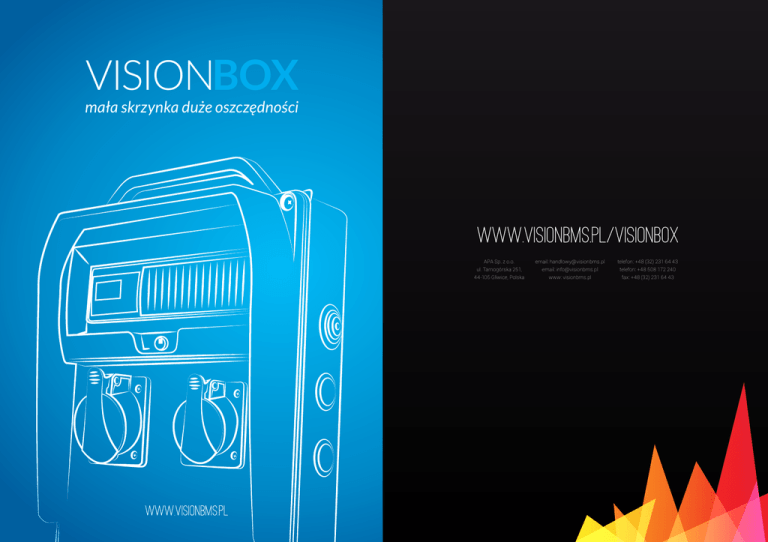 VISIONBOX mała skrzynka duże oszczędności www.visionbms.pl/visionbox APA Sp. z o.o. ul. Tarnogórska 251, email: [email protected] email: [email protected] telefon: +48 (32) 231 64 43 telefon: +48 508 172 240 44-105 Gliwice, Polska www: visionbms.pl fax: +48 (32) 231 64 43 CO TO JEST? VISIONBOX to kompaktowe urządzenie oparte o system VISIONBMS, dzięki któremu jeszcze łatwiej uzyskasz oszczędności związane z kosztami zużycia mediów. Łatwe w obsłudze, jeszcze prostsze w instalacji. Zamów VISIONBOX i przekonaj się jak działa cały system VISIONBMS DOSTEP ONLINE Dostęp przez internet (www) Dostęp przez Tablet (Android / iOS) Dostęp przez smartfon (Android / iOS) Powiadomienia SMS Powiadomienia przez mail Głosowe powiadomienia o stanie sytemu i pomiarach VISIONBOX to ciągły dostęp do aktualnych danych on-line, powiadomienia alarmowe, kluczowe analizy, wykresy i dane bez względu na to gdzie się znajdujesz. Kontroluj zużycie mediów, światło lub obraz z kamer, bezpośrednio na swoim smartfonie, tablecie lub komputerze. Pomiar zużycia prądu lub innych mediów Archiwizacja danych pomiarowych Statystyki i wykresy Analiza porównawcza różnych okresów archiwalnych i bieżącego przewidywania kosztów Powiadomienia i alarmy przekroczenia stanu dopuszczalnego Eksport danych do zewnętrznych programów opomiarowanie mediow VISIONBOX umożliwia rejestrowanie bieżącego zużycia energii i innych mediów oraz porównanie ich z historycznymi danymi pomiarowymi, przechowywanymi w systemie. Analiza porównawcza różnych okresów archiwalnych z bieżącym pozwala oszacować prognozę przyszłych kosztów, wykryć awarię instalacji oraz zminimalizować ryzyko przekroczenia zamówionej mocy biernej. VISIONBOX mała skrzynka duże oszczędności VISIONBOX - E VISIONBOX - W VISIONBOX - G monitoring zużycia energii elektrycznej monitoring zużycia gazu ziemnego [103 zł] tydzień bieżący - KW 19 VISIONBOX - H VISIONBOX - S monitoring wilgotności monitoring ścieków VISIONBOX - C monitoring zużycia wody monitoring strat ciśnienia [dzień] tydzień archiwalny - KW 12 MOZLIWOSC ROZBUDOWY kWh VISIONBOX daje możliwości, które zaspokoją nawet najbardziej wymagających. Wszystko dzięki łatwej możliwości rozbudowy nawet do 100 liczników i analizatorów, różnego typu. W ten sposób mała i łatwa w obsłudze skrzynka może stać się potężnym narzędziem. Monitorując zużycie mediów pracować będzie na obniżenie kosztów w przedsiębiorstwie. czas