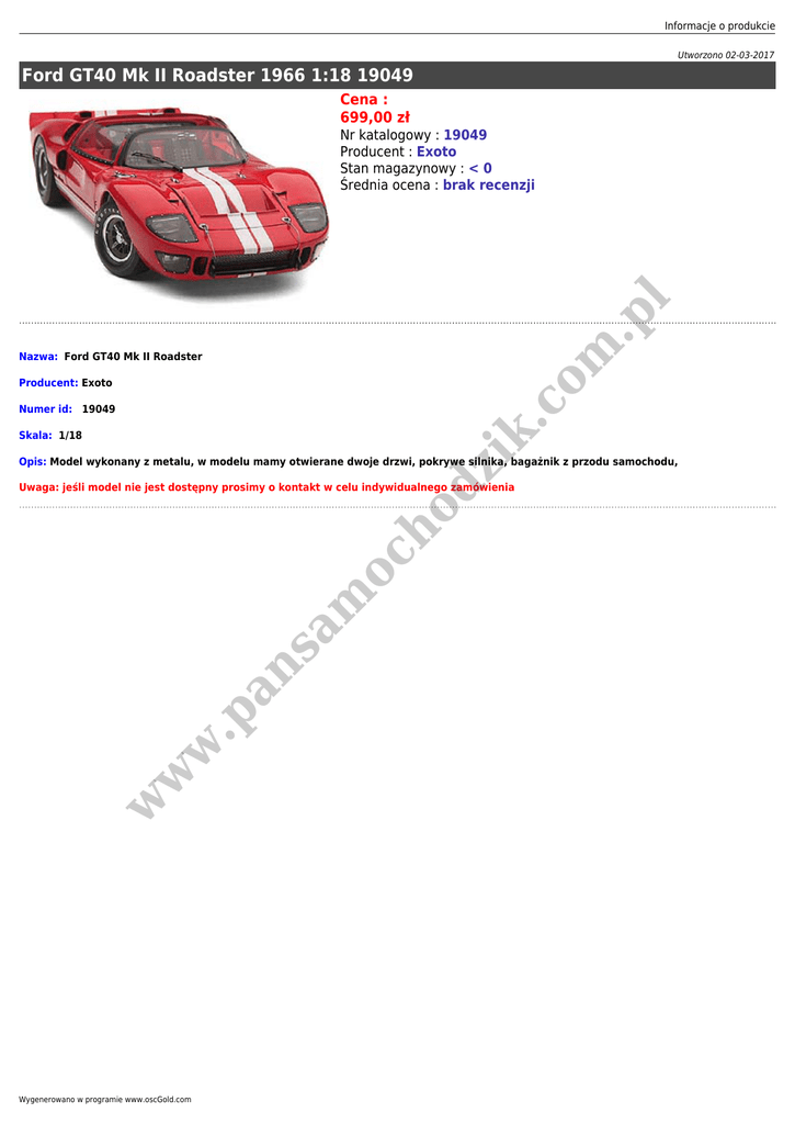 Informacje o produkcie Utworzono 02-03-2017 Ford GT40 Mk II Roadster 1966 1:18 19049 Cena : 699,00 zł om .p l Nr katalogowy : 19049 Producent : Exoto Stan magazynowy : < 0 Średnia ocena : brak recenzji Nazwa: Ford GT40 Mk II Roadster .c Producent: Exoto Numer id: 19049 dz ik Skala: 1/18 Opis: Model wykonany z metalu, w modelu mamy otwierane dwoje drzwi, pokrywe silnika, bagażnik z przodu samochodu, w w w .p an sa m oc ho Uwaga: jeśli model nie jest dostępny prosimy o kontakt w celu indywidualnego zamówienia Wygenerowano w programie www.oscGold.com