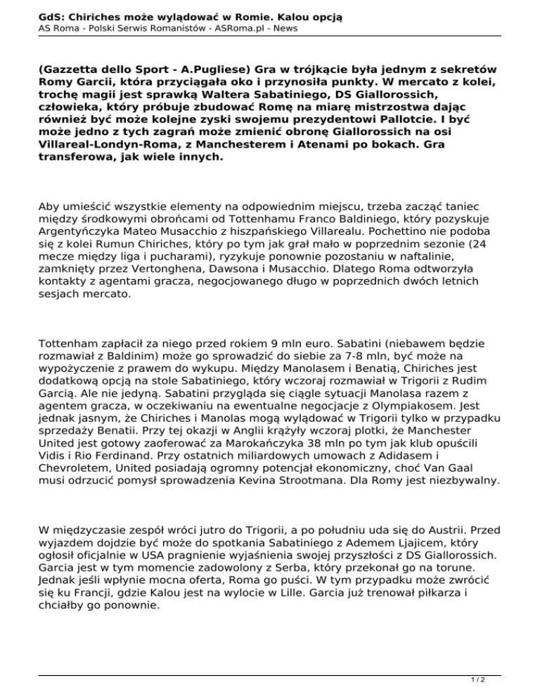 GdS: Chiriches może wylądować w Romie. Kalou opcją AS Roma - Polski Serwis Romanistów - ASRoma.pl - News (Gazzetta dello Sport - A.Pugliese) Gra w trójkącie była jednym z sekretów Romy Garcii, która przyciągała oko i przynosiła punkty. W mercato z kolei, trochę magii jest sprawką Waltera Sabatiniego, DS Giallorossich, człowieka, który próbuje zbudować Romę na miarę mistrzostwa dając również być może kolejne zyski swojemu prezydentowi Pallotcie. I być może jedno z tych zagrań może zmienić obronę Giallorossich na osi Villareal-Londyn-Roma, z Manchesterem i Atenami po bokach. Gra transferowa, jak wiele innych. Aby umieścić wszystkie elementy na odpowiednim miejscu, trzeba zacząć taniec między środkowymi obrońcami od Tottenhamu Franco Baldiniego, który pozyskuje Argentyńczyka Mateo Musacchio z hiszpańskiego Villarealu. Pochettino nie podoba się z kolei Rumun Chiriches, który po tym jak grał mało w poprzednim sezonie (24 mecze między liga i pucharami), ryzykuje ponownie pozostaniu w naftalinie, zamknięty przez Vertonghena, Dawsona i Musacchio. Dlatego Roma odtworzyła kontakty z agentami gracza, negocjowanego długo w poprzednich dwóch letnich sesjach mercato. Tottenham zapłacił za niego przed rokiem 9 mln euro. Sabatini (niebawem będzie rozmawiał z Baldinim) może go sprowadzić do siebie za 7-8 mln, być może na wypożyczenie z prawem do wykupu. Między Manolasem i Benatią, Chiriches jest dodatkową opcją na stole Sabatiniego, który wczoraj rozmawiał w Trigorii z Rudim Garcią. Ale nie jedyną. Sabatini przygląda się ciągle sytuacji Manolasa razem z agentem gracza, w oczekiwaniu na ewentualne negocjacje z Olympiakosem. Jest jednak jasnym, że Chiriches i Manolas mogą wylądować w Trigorii tylko w przypadku sprzedaży Benatii. Przy tej okazji w Anglii krążyły wczoraj plotki, że Manchester United jest gotowy zaoferować za Marokańczyka 38 mln po tym jak klub opuścili Vidis i Rio Ferdinand. Przy ostatnich miliardowych umowach z Adidasem i Chevroletem, United posiadają ogromny potencjał ekonomiczny, choć Van Gaal musi odrzucić pomysł sprowadzenia Kevina Strootmana. Dla Romy jest niezbywalny. W międzyczasie zespół wróci jutro do Trigorii, a po południu uda się do Austrii. Przed wyjazdem dojdzie być może do spotkania Sabatiniego z Ademem Ljajicem, który ogłosił oficjalnie w USA pragnienie wyjaśnienia swojej przyszłości z DS Giallorossich. Garcia jest w tym momencie zadowolony z Serba, który przekonał go na torune. Jednak jeśli wpłynie mocna oferta, Roma go puści. W tym przypadku może zwrócić się ku Francji, gdzie Kalou jest na wylocie w Lille. Garcia już trenował piłkarza i chciałby go ponownie. 1/2 GdS: Chiriches może wylądować w Romie. Kalou opcją AS Roma - Polski Serwis Romanistów - ASRoma.pl - News Autor: abruzzi 2/2 Powered by TCPDF (www.tcpdf.org)