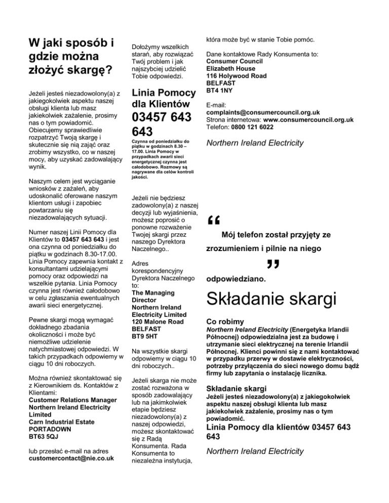 W jaki sposób i gdzie można złożyć skargę? Jeżeli jesteś niezadowolony(a) z jakiegokolwiek aspektu naszej obsługi klienta lub masz jakiekolwiek zażalenie, prosimy nas o tym powiadomić. Obiecujemy sprawiedliwie rozpatrzyć Twoją skargę i skutecznie się nią zająć oraz zrobimy wszystko, co w naszej mocy, aby uzyskać zadowalający wynik. Naszym celem jest wyciąganie wniosków z zażaleń, aby udoskonalić oferowane naszym klientom usługi i zapobiec powtarzaniu się niezadowalających sytuacji. Numer naszej Linii Pomocy dla Klientów to 03457 643 643 i jest ona czynna od poniedziałku do piątku w godzinach 8.30-17.00. Linia Pomocy zapewnia kontakt z konsultantami udzielającymi pomocy oraz odpowiedzi na wszelkie pytania. Linia Pomocy czynna jest również całodobowo w celu zgłaszania ewentualnych awarii sieci energetycznej. Pewne skargi mogą wymagać dokładnego zbadania okoliczności i może być niemożliwe udzielenie natychmiastowej odpowiedzi. W takich przypadkach odpowiemy w ciągu 10 dni roboczych. Można również skontaktować się z Kierownikiem ds. Kontaktów z Klientami: Customer Relations Manager Northern Ireland Electricity Limited Carn Industrial Estate PORTADOWN BT63 5QJ lub przesłać e-mail na adres [email protected] która może być w stanie Tobie pomóc. Dołożymy wszelkich starań, aby rozwiązać Twój problem i jak najszybciej udzielić Tobie odpowiedzi. Linia Pomocy dla Klientów 03457 643 643 Czynna od poniedziałku do piątku w godzinach 8.30 – 17.00. Linia Pomocy w przypadkach awarii sieci energetycznej czynna jest całodobowo. Rozmowy są nagrywane dla celów kontroli jakości. Jeżeli nie będziesz zadowolony(a) z naszej decyzji lub wyjaśnienia, możesz poprosić o ponowne rozważenie Twojej skargi przez naszego Dyrektora Naczelnego.. Adres korespondencyjny Dyrektora Naczelnego to: The Managing Director Northern Ireland Electricity Limited 120 Malone Road BELFAST BT9 5HT Na wszystkie skargi odpowiemy w ciągu 10 dni roboczych.. Jeżeli skarga nie może zostać rozważona w sposób zadowalający lub na jakimkolwiek etapie będziesz niezadowolony(a) z naszej odpowiedzi, możesz skontaktować się z Radą Konsumenta. Rada Konsumenta to niezależna instytucja, Dane kontaktowe Rady Konsumenta to: Consumer Council Elizabeth House 116 Holywood Road BELFAST BT4 1NY E-mail: [email protected] Strona internetowa: www.consumercouncil.org.uk Telefon: 0800 121 6022 Northern Ireland Electricity “ Mój telefon został przyjęty ze zrozumieniem i pilnie na niego odpowiedziano. ” Składanie skargi Co robimy Northern Ireland Electricity (Energetyka Irlandii Północnej) odpowiedzialna jest za budowę i utrzymanie sieci elektrycznej na terenie Irlandii Północnej. Klienci powinni się z nami kontaktować w przypadku przerwy w dostawie elektryczności, potrzeby przyłączenia do sieci nowego domu bądź firmy lub zapytania o instalację licznika. Składanie skargi Jeżeli jesteś niezadowolony(a) z jakiegokolwiek aspektu naszej obsługi klienta lub masz jakiekolwiek zażalenie, prosimy nas o tym powiadomić. Linia Pomocy dla klientów 03457 643 643 Northern Ireland Electricity