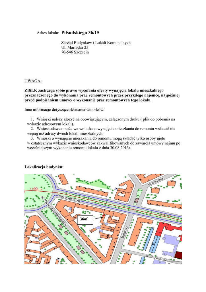 Adres lokalu: Piłsudskiego 36/15 Zarząd Budynków i Lokali Komunalnych Ul. Mariacka 25 70-546 Szczecin UWAGA: ZBiLK zastrzega sobie prawo wycofania oferty wynajęcia lokalu mieszkalnego przeznaczonego do wykonania prac remontowych przez przyszłego najemcę, najpóźniej przed podpisaniem umowy o wykonanie prac remontowych tego lokalu. Inne informacje dotyczące składania wniosków: 1. Wnioski należy złożyć na obowiązującym, załączonym druku ( plik do pobrania na wykazie adresowym lokali). 2. Wnioskodawca może we wniosku o wynajęcie mieszkania do remontu wskazać nie więcej niż adresy dwóch lokali mieszkalnych. 3. Wnioski o wynajęcie mieszkania do remontu mogą składać tylko osoby ujęte w ostatecznym wykazie wnioskodawców zakwalifikowanych do zawarcia umowy najmu po wcześniejszym wykonaniu remontu lokalu z dnia 30.08.2013r. Lokalizacja budynku: 36of Opis lokalu: Powierzchnia użytkowa – 74,54 m² Powierzchnia mieszkalna - 35,01 m² (pok. I – 13,49 m², pok.II- 13,49 m², pok.III- 8,03 m² ) Wyposażenie lokalu: instalacja wod-kan, gazowa, elektryczna i łazienka z w.c.