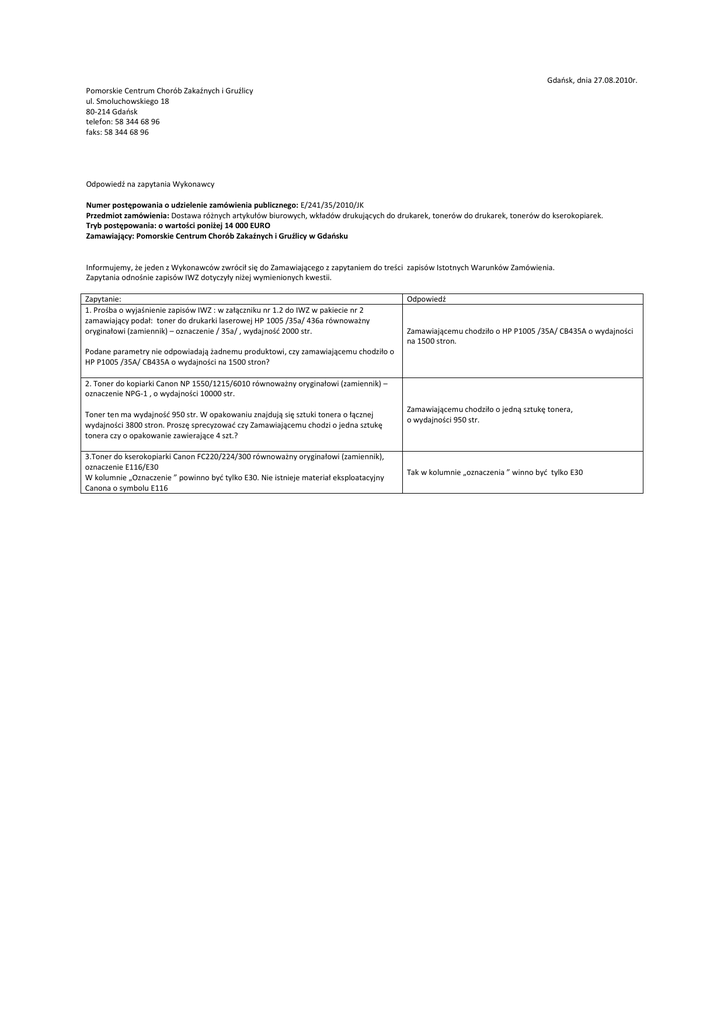 Gdańsk, dnia 27.08.2010r. Pomorskie Centrum Chorób Zakaźnych i Gruźlicy ul. Smoluchowskiego 18 80-214 Gdańsk telefon: 58 344 68 96 faks: 58 344 68 96 Odpowiedź na zapytania Wykonawcy Numer postępowania o udzielenie zamówienia publicznego: E/241/35/2010/JK Przedmiot zamówienia: Dostawa różnych artykułów biurowych, wkładów drukujących do drukarek, tonerów do drukarek, tonerów do kserokopiarek. Tryb postępowania: o wartości poniżej 14 000 EURO Zamawiający: Pomorskie Centrum Chorób Zakaźnych i Gruźlicy w Gdańsku Informujemy, że jeden z Wykonawców zwrócił się do Zamawiającego z zapytaniem do treści zapisów Istotnych Warunków Zamówienia. Zapytania odnośnie zapisów IWZ dotyczyły niżej wymienionych kwestii. Zapytanie: 1. Prośba o wyjaśnienie zapisów IWZ : w załączniku nr 1.2 do IWZ w pakiecie nr 2 zamawiający podał: toner do drukarki laserowej HP 1005 /35a/ 436a równoważny oryginałowi (zamiennik) – oznaczenie / 35a/ , wydajność 2000 str. Odpowiedź Zamawiającemu chodziło o HP P1005 /35A/ CB435A o wydajności na 1500 stron. Podane parametry nie odpowiadają żadnemu produktowi, czy zamawiającemu chodziło o HP P1005 /35A/ CB435A o wydajności na 1500 stron? 2. Toner do kopiarki Canon NP 1550/1215/6010 równoważny oryginałowi (zamiennik) – oznaczenie NPG-1 , o wydajności 10000 str. Toner ten ma wydajność 950 str. W opakowaniu znajdują się sztuki tonera o łącznej wydajności 3800 stron. Proszę sprecyzować czy Zamawiającemu chodzi o jedna sztukę tonera czy o opakowanie zawierające 4 szt.? 3.Toner do kserokopiarki Canon FC220/224/300 równoważny oryginałowi (zamiennik), oznaczenie E116/E30 W kolumnie „Oznaczenie ” powinno być tylko E30. Nie istnieje materiał eksploatacyjny Canona o symbolu E116 Zamawiającemu chodziło o jedną sztukę tonera, o wydajności 950 str. Tak w kolumnie „oznaczenia ” winno być tylko E30