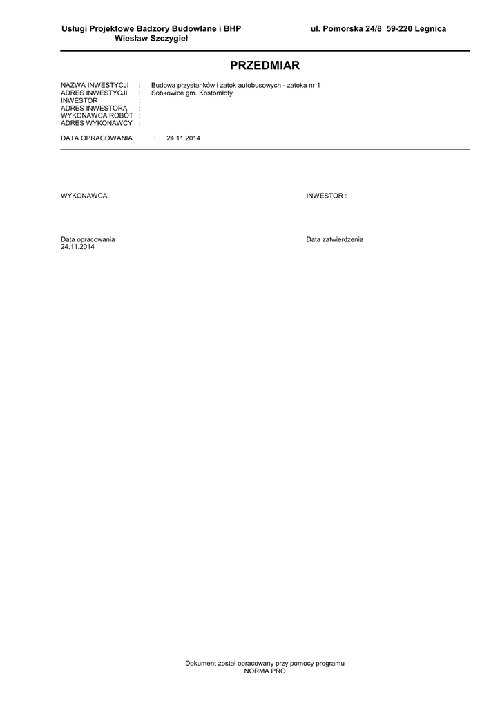 Usługi Projektowe Badzory Budowlane i BHP Wiesław Szczygieł ul. Pomorska 24/8 59-220 Legnica PRZEDMIAR NAZWA INWESTYCJI ADRES INWESTYCJI INWESTOR ADRES INWESTORA WYKONAWCA ROBÓT ADRES WYKONAWCY DATA OPRACOWANIA : : : : : : Budowa przystanków i zatok autobusowych - zatoka nr 1 Sobkowice gm. Kostomłoty : 24.11.2014 WYKONAWCA : INWESTOR : Data opracowania 24.11.2014 Data zatwierdzenia Dokument został opracowany przy pomocy programu NORMA PRO OGÓLNA CHARAKTERYSTYKA OBIEKTU OPIS TECHNICZNY 1. Temat. Przedmiotem opracowania jest budowa przystanków i zatok autobusowych w miejscowości Sobkowice gm. Kostomłoty w ciągu drogi wojewódzkiej nr346. 2. Podstawa opracowania. Podstawą opracowania dokumentacji technicznej jest umowa nr 53/UG/2013U zawarta w dniu 09.07.2013 pomiędzy Gminą Kostomłoty, a projektantem reprezentującym Usługi Projektowe Nadzory Budowlane i BHP Wiesław Szczygieł, ul> pomorska 24/8 59-220 Legnica. Dokumentację opracowano w oparciu o pozytywnie zaopiniowane koncepcje DSDiK dnia 13.01.2012 i 05.04.2012. 3. Normy i przepisy. - Ustawa z dnia 21 marca 1985r O drogach publicznych - Dz. U. 2000 Nr 71 póz. 838 /z późniejszymi zmianami/, - Rozporządzenie Ministra Transportu i Gospodarki Morskiej z dnia 2 marca 1999r w sprawie warunków technicznych, jakim powinny odpowiadać drogi publiczne i ich usytuowanie - Dz. U. 1999 Nr 43 póz. 430, - Rozporządzenie Ministra Infrastruktury z dnia 23.09.2003r. w sprawie szczegółowych warunków zarządzania ruchem na drogach oraz wykonywania nadzoru nad tym zarządzaniem Dz. U. Nr 177 póz. 1729, - Rozporządzenie Ministra Infrastruktury z dnia 03.07.2003r. w sprawie szczegółowych warunków technicznych dla znaków i sygnałów drogowych oraz urządzeń bezpieczeństwa ruchu drogowego i warunki ich umieszczania na drogach wraz z załącznikami 1-4 Dz. U. Nr 220, póz. 2181 z dnia 23.12.2003r., 4. Cel i zakres opracowania. Celem opracowania jest budowa 2-ch przystanków i zatok autobusowych. Niniejszy projekt swoim zakresem obejmuje: o Wykonanie nowych zatok autobusowych o nawierzchni betonowej o Wykonanie peronów i chodników z kostki betonowej wzór Holland o Rozwiązanie problemu odwodnienia drogi po wybudowaniu zatok o Docelowa organizacja ruchu o Zastępcza organizacja ruchu 5. Materiały wyjściowe. Aktualna mapy zasadnicza w skali 1:500 Wizja w terenie Uzgodnienia z zamawiającym Akty prawne obejmujące zakres opracowania 6. Stan istniejący. Istniejące odcinki objęte opracowaniem: o Obecnie w miejscu projektowanych zatok jest pobocze drogowe o szerokości 2÷2,30 m częściowo porośnięte trawą i częściowo gruntowe z domieszkami żwiru i drobnych materiałów kamiennych. o Krawędź nawierzchni jest w znacznym stopniu zdeformowana z przełomami Brak uporządkowanego sposobu odwodnienia. Woda z poboczy spływa na przyległy teren tworząc odparowujące zastoiny wodne. o Z dokonanych odkrywek gruntu pod budowę zatoki warstwy gruntowe przedstawiają się następująco: - darnina gr. 15 cm - grunt mieszany żwirowy z domieszkami materiału kamiennego gr. 15 cm - grunt gliniasto żwirowy gr.40 cm 7. Opis przyjętych rozwiązań projektowych. UWAGA ! Ze względu na duże natężenie ruchu na tym odcinku drogi, a zwłaszcza transportu ciężarowego nie należy prowadzić robót na obu zatokach jednocześnie. Zaleca się całkowite wykonanie robót najpierw na jednej zatoce i po zakończeniu robót na tym obiekcie przystąpienie do robót na drugiej zatoce. W związku z taką sytuacją opracowane zostały również organizacje ruchu zastępczego dla każdej zatoki oddzielnie. Parametry techniczne zatoki nr 1 - skos najazdowy długości 20 m - zatoka postojowa długości 20 m i szerokości 3,00 m - skos wyjazdowy długości 12 m - peron przy placu wiaty szerokości 1,50 m - chodnik szerokości 2,00 m Parametry techniczne zatoki nr 2 - skos najazdowy długości 20 m - zatoka postojowa długości 20 m i szerokości 3,00 m - skos wyjazdowy długości 15 m - peron przy placu wiaty szerokości 1,50 m - chodnik szerokości 2,00 m Konstrukcja nawierzchni jak dla KR-4: 22 cm - warstwa ścieralna z betonu B40 20 cm - podbudowa zasadnicza z betonu B10 10 cm - warstwa odsączająca z piasku Krawężniki betonowe 20*30 cm wystające + 16 cm na ławie betonowej z oporem z betonu B15. Na połączeniu z nawierzchnią jezdni krawężnik betonowy 20*30 cm ułożony na płask na ławie betonowej z betonu B15. Na przejściach dla pieszych krawężniki należy obniżyć do 2 cm ponad powierzchnię jezdni. Pas istniejącej zdeformowanej nawierzchni przy krawędzi na długości projektowanych zatok i chodników o szerokości 70 cm należy naciąć na całą grubość nawierzchni i po wykonaniu zatoki i chodników odtworzyć z betonu asfaltowego 8 cm - warstwa ścieralna. Konstrukcja placu pod wiatę, chodnika i peronów. -2- Norma PRO Wersja 4.47 Nr seryjny: 5383 Użytkownik: Wiesław Szczygieł OGÓLNA CHARAKTERYSTYKA OBIEKTU 8 cm - kostka betonowa wzór Holland ułożona w rzędy proste 5 cm - podsypka cementowo piaskowa 15 cm - podbudowa z mieszanki kamiennej 0/31,5 mm Obrzeże betonowe 8*30 cm wystające należy ustawić na ławie betonowej 10*20 cm z oporem z betonu B-10, a na połączeniu peronu z placem pod wiatę wtopione. Dla każdej zatoki projektuje się oświetlenie hybrydowe Technologia wykonania i posadowienia przedstawiona jest w specyfikacji technicznej. Wzdłuż peronu projektuje się po 10 m w prawo i w lewo od boków brzegów wiaty ogrodzenie panelowe ocynkowane wysokości 1,56 m. Technologia wykonania i posadowienia przedstawiona jest w specyfikacji technicznej. 9. Odwodnienie (kanalizacja deszczowa) Na przyległym terenie nie występują żadne urządzenia mogące spełniać rolę urządzeń odwadniających. Dotychczas wody opadowe rozlewały się poza koronę drogi i odparowywały. Rów po przeciwnej stronie zatoki nr 1 nie ma żadnego odpływu i jest rowem odparowującym. Jedynym możliwym sposobem odwodnienia jes