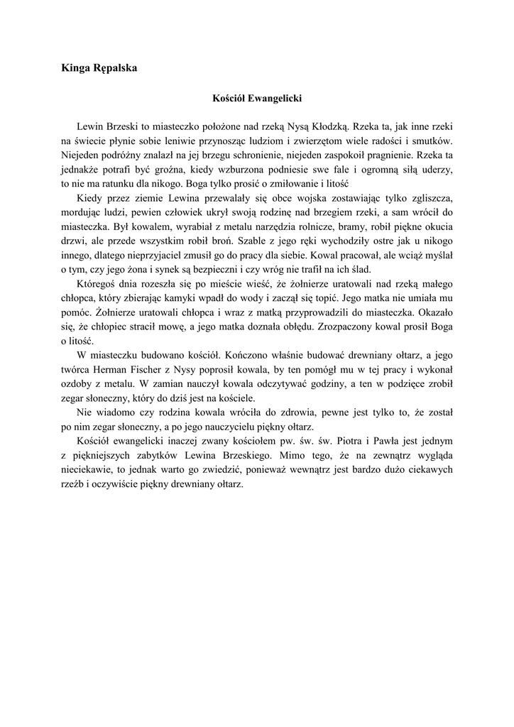 Kinga Rępalska Kościół Ewangelicki Lewin Brzeski to miasteczko połoŜone nad rzeką Nysą Kłodzką. Rzeka ta, jak inne rzeki na świecie płynie sobie leniwie przynosząc ludziom i zwierzętom wiele radości i smutków. Niejeden podróŜny znalazł na jej brzegu schronienie, niejeden zaspokoił pragnienie. Rzeka ta jednakŜe potrafi być groźna, kiedy wzburzona podniesie swe fale i ogromną siłą uderzy, to nie ma ratunku dla nikogo. Boga tylko prosić o zmiłowanie i litość Kiedy przez ziemie Lewina przewalały się obce wojska zostawiając tylko zgliszcza, mordując ludzi, pewien człowiek ukrył swoją rodzinę nad brzegiem rzeki, a sam wrócił do miasteczka. Był kowalem, wyrabiał z metalu narzędzia rolnicze, bramy, robił piękne okucia drzwi, ale przede wszystkim robił broń. Szable z jego ręki wychodziły ostre jak u nikogo innego, dlatego nieprzyjaciel zmusił go do pracy dla siebie. Kowal pracował, ale wciąŜ myślał o tym, czy jego Ŝona i synek są bezpieczni i czy wróg nie trafił na ich ślad. Któregoś dnia rozeszła się po mieście wieść, Ŝe Ŝołnierze uratowali nad rzeką małego chłopca, który zbierając kamyki wpadł do wody i zaczął się topić. Jego matka nie umiała mu pomóc. śołnierze uratowali chłopca i wraz z matką przyprowadzili do miasteczka. Okazało się, Ŝe chłopiec stracił mowę, a jego matka doznała obłędu. Zrozpaczony kowal prosił Boga o litość. W miasteczku budowano kościół. Kończono właśnie budować drewniany ołtarz, a jego twórca Herman Fischer z Nysy poprosił kowala, by ten pomógł mu w tej pracy i wykonał ozdoby z metalu. W zamian nauczył kowala odczytywać godziny, a ten w podzięce zrobił zegar słoneczny, który do dziś jest na kościele. Nie wiadomo czy rodzina kowala wróciła do zdrowia, pewne jest tylko to, Ŝe został po nim zegar słoneczny, a po jego nauczycielu piękny ołtarz. Kościół ewangelicki inaczej zwany kościołem pw. św. św. Piotra i Pawła jest jednym z piękniejszych zabytków Lewina Brzeskiego. Mimo tego, Ŝe na zewnątrz wygląda nieciekawie, to jednak warto go zwiedzić, poniewaŜ wewnątrz jest bardzo duŜo ciekawych rzeźb i oczywiście piękny drewniany ołtarz.
