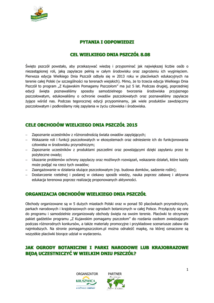 PYTANIA I ODPOWIEDZI CEL WIELKIEGO DNIA PSZCZÓŁ 8.08 Święto pszczół powstało, aby przekazywać wiedzę i przypominać jak największej liczbie osób o niezastąpionej roli, jaką zapylacze pełnią w całym środowisku oraz zagrożeniu ich wyginięciem. Pierwsza edycja Wielkiego Dnia Pszczół odbyła się w 2013 roku w placówkach edukacyjnych na terenie całej Polski (w szczególności na terenach wiejskich). Mimo, że to trzecia edycja Wielkiego Dnia Pszczół to program „Z Kujawskim Pomagamy Pszczołom” ma już 5 lat. Podczas drugiej, poprzedniej edycji święta poznawaliśmy sposoby samodzielnego tworzenia środowiska przyjaznego pszczołowatym, edukowaliśmy o ochronie owadów pszczołowatych oraz poznawaliśmy zapylacze żyjące wśród nas. Podczas tegorocznej edycji przypominamy, jak wiele produktów zawdzięczmy pszczołowatym i podkreślamy rolę zapylania w życiu człowieka i środowiska. CELE OBCHODÓW WIELKIEGO DNIA PSZCZÓŁ 2015 Zapoznanie uczestników z różnorodnością świata owadów zapylających; Wskazanie roli i funkcji pszczołowatych w ekosystemach oraz odniesienie ich do funkcjonowania człowieka w środowisku przyrodniczym; Zapoznanie uczestników z produktami pszczelimi oraz powstającymi dzięki zapylaniu przez te pożyteczne owady; Ukazanie problemów ochrony zapylaczy oraz możliwych rozwiązań, wskazanie działań, które każdy może podjąć na rzecz tych owadów; Zaangażowanie w działania służące pszczołowatym (np. budowa domków, sadzenie roślin); Dostarczenie rzetelnej i podanej w ciekawy sposób wiedzy, nauka poprzez zabawę i aktywna edukacja terenowa poprzez realizację proponowanych aktywności. ORGANIZACJA OBCHODÓW WIELKIEGO DNIA PSZCZÓŁ Obchody organizowane są w 5 dużych miastach Polski oraz w ponad 50 placówkach przyrodniczych, parkach narodowych i krajobrazowych oraz ogrodach botanicznych w całej Polsce. Przyłączyły się one do programu i samodzielnie zorganizowały obchody święta na swoim terenie. Placówki te otrzymały pakiet gadżetów programu „Z Kujawskim pomagamy pszczołom” do rozdania osobom zwiedzającym podczas różnorodnych konkursów, a także materiały promocyjne i przykładowe scenariusze zabaw dla najmłodszych. Na stronie pomagamypszczolom.pl można odnaleźć mapkę, na której oznaczone są wszystkie placówki biorące udział w wydarzeniu. JAK OGRODY BOTANICZNE I PARKI NARODOWE LUB KRAJOBRAZOWE BĘDĄ UCZESTNICZYĆ W WIELKIM DNIU PSZCZÓŁ? 1 ORGANIZATOR PARTNER Podczas trzeciej odsłony Wielkiego Dnia Pszczół zaangażowane do współpracy zostały ogrody botaniczne, parki narodowe i krajobrazowe z całej Polski. Organizatorzy chcą zachęcić te instytucje by tego dnia otworzyły się na odwiedzających, oferując im różne atrakcje i edukacyjny aktywności oraz możliwość wejścia za darmo (wejście do ogrodów botanicznych jest najczęściej biletowane). Poza tym do obchodów zostały także zaproszone mniejsze samodzielnie placówki, które otrzymają atrakcyjne gadżety do rozdysponowania podczas własnych eventów. Każda placówka samodzielne wybiera aktywności, które zaproponuje 8 sierpnia odwiedzającym. Są to najczęściej: warsztaty z budowania prostych domków dla pszczół dziko żyjących, przejście edukacyjną „pszczelą” ścieżką, spotkanie z pszczelarzem, możliwość poznania roślin przyjaznych pszczołom, zapoznanie z produktami, które otrzymujemy dzięki pracy pszczołowatych, możliwość zapoznania się z Zasadami Przyjaciół Pszczół, gry i zabawy edukacyjne na temat pszczołowatych. DLACZEGO PSZCZOŁY GINĄ? Nikt jak dotąd nie potrafił wskazać jednej przyczyny, choć problem wymierających pszczół badają naukowcy z całego świata. Powodów może być bardzo wiele: skażenie środowiska prowadzące do obniżenia odporności pszczół, stosowanie chemii w rolnictwie, choroby pszczół – zarówno grzybicze, jak i wirusowe, zmiany klimatyczne, transport pszczół na odległość tysięcy kilometrów w celu zapylania, a nawet promieniowanie emitowane przez telefonię komórkową, które zakłóca system nawigacyjny pszczół, sprawiając, że nie mogą trafić z powrotem do ula. Zdaniem specjalistów mechanizm wywołujący ginięcie pszczół jest bardzo złożony i wynika z namnożenia się różnych czynników. Nie udaje się wciąż stwierdzić, który z nich jest dominujący. CO KAŻDY Z NAS MOŻE ZROBIĆ, ABY POMÓC PSZCZOŁOM? Pomaganie pszczołom jest bardzo proste! Wystarczy włączyć się do naszej akcji, by dowiedzieć się, jak można uczynić swoje otocznie przyjaznym pszczołom. Każdy z nas, zwłaszcza jeśli posiada balkon lub przydomowy ogródek, może sprawić, że pszczoły będą chętnie odwiedzać te miejsca i dobrze się w nich czuć! Na stronie internetowej akcji można znaleźć wiele praktycznych wskazówek dotyczących pielęgnowania kwiatów i ogrodu przyjaznego pszczołom i wykorzystać je w praktyce lub założyć na stronie akcji wirtualny ogródek przyjazny pszczołom i pielęgnować go. Wystarczy stosować Zasady Przyjaciół Pszczół dostępne na stronie www.pomagamypszczolom.pl CO TO SĄ ZASADY PRZYJACIÓŁ PSZCZÓŁ I NA CZYM POLEGAJĄ? W ramach programu „Z Kujawskim pomagamy pszczołom” powstało 5 Zasad Przyjaciół Pszczół opisujących samodzielnie działania, które każdy może stosować. 1. 2. 3. 4. 5. Wiosną nie wypalam traw i nie spalam suchych łodyg i kwiatów zeszłorocznych roślin. Hoduję tylko takie rośliny, które nie znajdują się na liście gatunków inwazyjnych. Pozostawiam w ogrodzie „półdziki” zakątek. Stosuję naturalne nawozy i środki ochrony roślin. Zwiększam szanse pszczołowatych na wychowanie potomstwa poprzez budowę sztucznych gniazd. 2 ORGANIZATOR PARTNER 1. Wypalanie traw na wiosnę jest jednym z głównych zagrożeń dla wielu gatunków owadów, w tym i pszczół dziko żyjących. W wyniku takich nieprzemyślanych akcji giną nie tylko owady, które prz