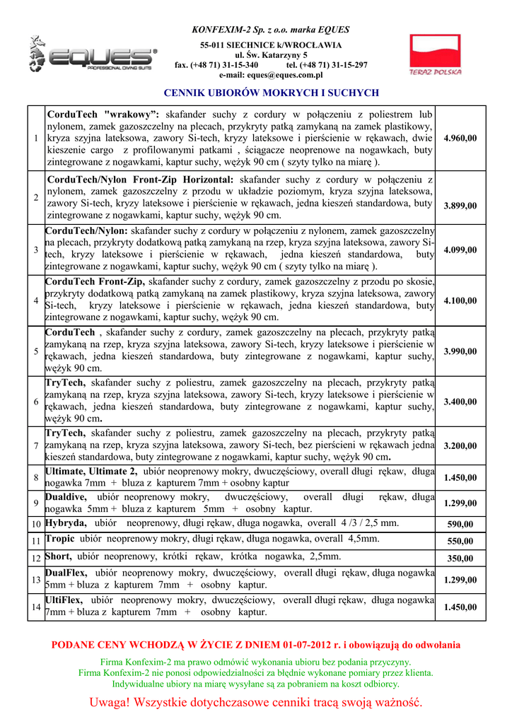 KONFEXIM-2 Sp. z o.o. marka EQUES 55-011 SIECHNICE k/WROCŁAWIA ul. Św. Katarzyny 5 fax. (+48 71) 31-15-340 tel. (+48 71) 31-15-297 e-mail: [email protected] CENNIK UBIORÓW MOKRYCH I SUCHYCH CorduTech "wrakowy”: skafander suchy z cordury w połączeniu z poliestrem lub nylonem, zamek gazoszczelny na plecach, przykryty patką zamykaną na zamek plastikowy, 1 kryza szyjna lateksowa, zawory Si-tech, kryzy lateksowe i pierścienie w rękawach, dwie kieszenie cargo z profilowanymi patkami , ściągacze neoprenowe na nogawkach, buty zintegrowane z nogawkami, kaptur suchy, wężyk 90 cm ( szyty tylko na miarę ). CorduTech/Nylon Front-Zip Horizontal: skafander suchy z cordury w połączeniu z nylonem, zamek gazoszczelny z przodu w układzie poziomym, kryza szyjna lateksowa, 2 zawory Si-tech, kryzy lateksowe i pierścienie w rękawach, jedna kieszeń standardowa, buty zintegrowane z nogawkami, kaptur suchy, wężyk 90 cm. 3 4 5 6 7 8 9 10 CorduTech/Nylon: skafander suchy z cordury w połączeniu z nylonem, zamek gazoszczelny na plecach, przykryty dodatkową patką zamykaną na rzep, kryza szyjna lateksowa, zawory Sitech, kryzy lateksowe i pierścienie w rękawach, jedna kieszeń standardowa, buty zintegrowane z nogawkami, kaptur suchy, wężyk 90 cm ( szyty tylko na miarę ). CorduTech Front-Zip, skafander suchy z cordury, zamek gazoszczelny z przodu po skosie, przykryty dodatkową patką zamykaną na zamek plastikowy, kryza szyjna lateksowa, zawory Si-tech, kryzy lateksowe i pierścienie w rękawach, jedna kieszeń standardowa, buty zintegrowane z nogawkami, kaptur suchy, wężyk 90 cm. CorduTech , skafander suchy z cordury, zamek gazoszczelny na plecach, przykryty patką zamykaną na rzep, kryza szyjna lateksowa, zawory Si-tech, kryzy lateksowe i pierścienie w rękawach, jedna kieszeń standardowa, buty zintegrowane z nogawkami, kaptur suchy, wężyk 90 cm. TryTech, skafander suchy z poliestru, zamek gazoszczelny na plecach, przykryty patką zamykaną na rzep, kryza szyjna lateksowa, zawory Si-tech, kryzy lateksowe i pierścienie w rękawach, jedna kieszeń standardowa, buty zintegrowane z nogawkami, kaptur suchy, wężyk 90 cm. TryTech, skafander suchy z poliestru, zamek gazoszczelny na plecach, przykryty patką zamykaną na rzep, kryza szyjna lateksowa, zawory Si-tech, bez pierścieni w rękawach jedna kieszeń standardowa, buty zintegrowane z nogawkami, kaptur suchy, wężyk 90 cm. Ultimate, Ultimate 2, ubiór neoprenowy mokry, dwuczęściowy, overall długi rękaw, długa nogawka 7mm + bluza z kapturem 7mm + osobny kaptur Dualdive, ubiór neoprenowy mokry, dwuczęściowy, overall długi rękaw, długa nogawka 5mm + bluza z kapturem 5mm + osobny kaptur. Hybryda, ubiór neoprenowy, długi rękaw, długa nogawka, overall 4 /3 / 2,5 mm. 4.960,00 3.899,00 4.099,00 4.100,00 3.990,00 3.400,00 3.200,00 1.450,00 1.299,00 590,00 11 Tropic ubiór neoprenowy mokry, długi rękaw, długa nogawka, overall 4,5mm. 550,00 12 Short, ubiór neoprenowy, krótki rękaw, krótka nogawka, 2,5mm. 350,00 DualFlex, ubiór neoprenowy mokry, dwuczęściowy, overall długi rękaw, długa nogawka 1.299,00 5mm + bluza z kapturem 7mm + osobny kaptur. UltiFlex, ubiór neoprenowy mokry, dwuczęściowy, overall długi rękaw, długa nogawka 14 7mm + bluza z kapturem 7mm + osobny kaptur. 1.450,00 13 PODANE CENY WCHODZĄ W ŻYCIE Z DNIEM 01-07-2012 r. i obowiązują do odwołania Firma Konfexim-2 ma prawo odmówić wykonania ubioru bez podania przyczyny. Firma Konfexim-2 nie ponosi odpowiedzialności za błędnie wykonane pomiary przez klienta. Indywidualne ubiory na miarę wysyłane są za pobraniem na koszt odbiorcy. Uwaga! Wszystkie dotychczasowe cenniki tracą swoją ważność.