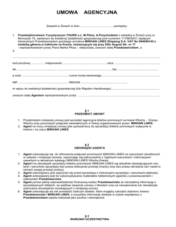 UMOWA AGENCYJNA Zawarta w Żorach w dniu ........................................ pomiędzy: 1. Przedsiębiorstwem Turystycznym TOURS s.c. M.Piksa, A.Przychodzień z siedzibą w Żorach przy ul. Moniuszki 15, wpisanym do ewidencji działalności gospodarczej pod numerem 11768/2001; będącym Generalnym Przedstawicielem greckiego armatora MINOAN LINES Shipping S.A. VAT No 094049145 z siedzibą główną w Iraklionie na Krecie, mieszczącym się przy 25th August Str. nr 17 - reprezentowanym przez Pana Marka Piksa – właściciela; zwanym dalej Przedstawicielem, a 2. .................................................................................................................................................................................... kod pocztowy ................ miejscowość ..................................................... ulica ........................................................ tel......................................................................................................................fax................................................... e-mail: ......................................................., numer konta bankowego ...................................................................... NIP ............................................................, REGON ......................................................., nr wpisu do ewidencji działalności gospodarczej (lub Rejestru Handlowego) .......................................................... zwanym dalej Agentem reprezentowanym przez .................................................................................................... §1 PRZEDMIOT UMOWY 1. Przedmiotem niniejszej umowy jest sprzedaż agencyjna biletów promowych na trasie Włochy - Grecja Włochy oraz promowych połączeń wewnętrznych w Grecji organizowanych przez MINOAN LINES. 2. Agent na mocy niniejszej umowy jest upoważniony do sprzedaży biletów promowych wyłącznie w imieniu i na rzecz MINOAN LINES. §2 OBOWIĄZKI AGENTA 1. Agent zobowiązuje się do oferowania połączeń promowych MINOAN LINES na warunkach określonych w ustawie i niniejszej umowie, zapoznając się jednocześnie z Ogólnymi warunkami i informacjami zawartymi w aktualnym katalogu MINOAN LINES Włochy-Grecja. 2. Agent ma obowiązek sprzedaży biletów promowych MINOAN LINES wg aktualnie obowiązujących cen, taryf i warunków sprzedaży bez prawa doliczania prowizji (marży) oraz bez prawa obniżania cen nawet w ramach swojej prowizji (marży). 3. Agent zobowiązany jest zapoznać się przed sprzedażą z instrukcjami sprzedaży i warunkami płatności. 4. Agent zobowiązany jest do wykorzystywania materiałów reklamowych zgodnie z przeznaczeniem i zaleceniem Przedstawiciela. 5. Agent ponosi pełną odpowiedzialność finansową wobec Przedstawiciela za nierzetelną informację o sprzedawanych biletach, za wadliwe zawarcie umowy z klientem oraz za niewykonanie lub nienależyte wykonanie obowiązków wynikających z niniejszej umowy. 6. Agent zobowiązuje się nie prowadzić żadnych działań, które mogłyby szkodzić dobremu imieniu Przedstawiciela i MINOAN LINES, a wszystkie informacje zdobyte w czasie współpracy z Przedstawicielem będzie traktował jako poufne i wewnętrzne. §3 WARUNKI UCZESTNICTWA Określone przez MINOAN LINES Ogólne warunki i informacje zawarte w aktualnym katalogu MINOAN LINES Włochy-Grecja stanowią integralną część umowy i są ujęte w załączniku do niniejszej umowy. §4 ZAWIERANIE UMÓW O SPRZEDAŻY BILETÓW PROMOWYCH 1. Przed zawarciem umowy z klientem Agent zobowiązany jest: - upewnić się telefonicznie (lub przez internet) czy są wolne miejsca na wybraną przez klienta trasę - zapoznać klienta z Ogólnymi warunkami i informacjami zawartymi w aktualnym katalogu MINOAN LINES Włochy-Grecja. 2. Rezerwacja miejsc przez Agenta musi mieć formę zgłoszenia pisemnego (fax, e-mail), zawierającego kompletne dane dotyczące klienta oraz trasy i rodzaju zakwaterowania, na które klient się zdecydował. 3. Umowa powinna być podpisana przez klienta we wskazanym miejscu. 4. Warunkiem rezerwacji jest przesłanie rezerwacji i potwierdzenia wpłaty zaliczki (bądź całości jeśli tego wymaga termin płatności). Brak wpłaty bądź jej potwierdzenia będzie zrozumiany jako rezygnacja, do czego zastosowanie będą miały odpowiednie punkty Ogólnych warunków i informacji zawartych w aktualnym katalogu MINOAN LINES Włochy-Grecja. 5. Agent zobowiązuje się do przestrzegania wszelkich zasad dotyczących rezerwacji narzuconych przez Przedstawiciela. 6. Przedstawiciel potwierdza wstępną rezerwację poprzez e-mail lub faxem, nadając rezerwacji numer oraz termin, do którego na konto Przedstawiciela powinna wpłynąć cała płatność. Po otrzymaniu należności Przedstawiciel wysyła Agentowi voucher, spełniający rolę biletu promowego, na jego podstawie klient zgłasza się w punkcie odprawy MINOAN LINES w porcie wypłynięcia , gdzie otrzymuje karty pokładowe. W przypadku, gdy czas pomiędzy rezerwacją a wypłynięciem nie pozwala na przesłanie vouchera, klient stawia się w porcie na podstawie pisemnego potwierdzenia z numerem rezerwacji. §5 REZYGNACJA 1. W przypadku rezygnacji klienta Agent ma obowiązek przyjąć pisemną rezygnację oraz niezwłocznie powiadomić Przedstawiciela – jednocześnie obciążając klienta kwotą zgodną z Ogólnymi warunkami i informacjami zawartymi w aktualnym katalogu MINOAN LINES Włochy-Grecja. Jako datę rezygnacji przyjmuje się datę otrzymania wiadomości pisemnej od Agenta, zawierającej wszystkie dane dotyczące rezerwacji. 2. W przypadku odwołania przeprawy promowej, po otrzymaniu odpowiedniej informacji od Przedstawiciela, Agent zobowiązany jest niezwłocznie poinformować klienta o zaistniałej sytuacji, postąpić zgodnie z Ogólnymi warunkami i informacjami zawartymi w aktualnym katalogu MINOAN LINES Włochy-Grecja oraz pisemnie powiadomić Przedstawiciela
