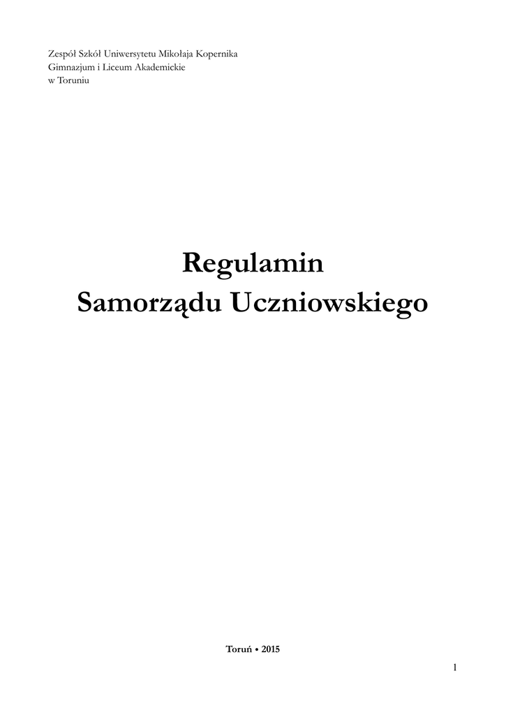 Zespół Szkół Uniwersytetu Mikołaja Kopernika Gimnazjum i Liceum Akademickie w Toruniu Regulamin Samorządu Uczniowskiego Toruń • 2015 1 I Postanowienia ogólne §1 1. Samorząd Uczniowski tworzą wszyscy uczniowie ZS UMK Gimnazjum i Liceum Akademickie w Toruniu. 2. Samorząd Uczniowski, działający w szkole ZS UMK Gimnazjum i Liceum Akademickie, zwany dalej SU, działa na podstawie Ustawy o systemie oświaty z dn. 7 IX 1991 r. (Dz.U. z 1991 r., nr 95, poz. 425), Statutu Zespołu Szkół Uniwersytetu Mikołaja Kopernika Gimnazjum i Liceum Akademickie w Toruniu oraz niniejszego Regulaminu. II Cele działalności SU §2 1. Do głównych celów działalności SU należą: 1) promowanie i rozwijanie wśród uczniów samorządności na rzecz podejmowania wspólnych decyzji w sprawach Szkoły, 2) przedstawienie Dyrektorowi Szkoły, Radzie Pedagogicznej oraz Radzie Rodziców wniosków, opinii i potrzeb uczniów we wszystkich sprawach Szkoły, 3) zwiększanie aktywności uczniowskiej, rozwijanie zainteresowań uczniów i realizowanie własnych pomysłów dla wspólnego dobra, 4) promowanie wiedzy na temat praw uczniów i czuwanie nad ich przestrzeganiem, 5) organizowanie i zachęcanie uczniów do działalność kulturalnej, oświatowej, sportowej, rozrywkowej, naukowej w szkole, 6) reprezentowanie działalności SU przed Dyrektorem Szkoły, Radą Pedagogiczną, Radą Rodziców i innymi organami. III Opiekun SU §3 1. Opiekę nad pracą SU sprawuje Opiekun SU. 2. Nowo wybrany Samorząd Uczniowski proponuje kandydatury na opiekuna SU. Jeżeli wybrani nauczyciele wyrażą zgodę, a zaproponowanych lub chętnych opiekunów jest więcej niż jeden następuje głosowanie wewnątrz SU i opiekunem zostaje nauczyciel, który uzyskał większość głosów. 3. Opiekun SU wspomaga jego działalność poprzez: 1) pośredniczenie w relacjach SU z Dyrektorem Szkoły oraz Radą Pedagogiczną, 2) wsparcie SU w sprawach merytorycznych i organizacyjnych, 3) inspirowanie uczniów do działania. 2 IV Organy SU – kompetencja, zadania, struktura §4 1. Do organów SU należą: 1) Rada Samorządu Uczniowskiego złożona z przedstawicieli Samorządów Klasowych; 2) Zarząd Samorządu Uczniowskiego. 2. Kadencja organów SU trwa przez okres jednego roku szkolnego. §5 1. Przedstawiciele Samorządów Klasowych: 1) identyfikują potrzeby uczniów, 2) inspirują i zachęcają uczniów do działalności kulturalnej, oświatowej, sportowej, rozrywkowej, naukowej w szkole, 3) informują uczniów o działalności Zarządu SU. 2. Zebrania ogólne przedstawicieli Samorządów Klasowych wszystkich klas w Szkole nazywane jest Radą Samorządu Uczniowskiego. 3. Do obowiązków członków Rady SU należy: 1) uczestnictwo w pracach Rady SU i realizacja celów SU, 2) stosowanie się w swojej działalności do wytycznych Zarządu SU lub Dyrektora Szkoły, 3) włączanie uczniów w ogólnoszkolne działania Zarządu SU. 4. Do kompetencji Rady SU należy: 1) współpraca z Zarządem SU i Opiekunem SU, 2) opiniowanie planu działań i konkretnych inicjatyw Zarządu SU, 3) zgłaszanie propozycji działań dla Zarządu SU, 4) kontrolowanie zgodności działań Zarządu SU z niniejszym Regulaminem oraz Statutem Szkoły, 5) rozpatrywanie i opiniowanie semestralnych oraz rocznych sprawozdań Przewodniczącego SU z działalności SU i innych spraw wniesionych przez członków Zarządu SU pod obrady. 5. Obrady Rady SU zwoływane są przez Przewodniczącego Zarządu SU przynajmniej raz w semestrze. Członkowie Rady SU mogą wystąpić do Przewodniczącego Zarządu SU o zwołanie specjalnego zebrania Rady SU. §6 1. Do kompetencji Zarządu SU należy: 1) koordynowanie, inicjowanie i organizowanie działań uczniowskich, 2) opracowanie rocznego planu działania SU, 3) identyfikacja potrzeb uczniów i odpowiadanie na te potrzeby, 4) przedstawianie Dyrektorowi Szkoły, Radzie Pedagogicznej i Radzie Rodziców wniosków, opinii, sugestii członków SU, 5) zbieranie i archiwizowanie (w segregatorze) bieżącej dokumentacji SU. 2. Obrady Zarządu SU zwoływane są przez Przewodniczącego Zarządu SU lub Opiekuna SU w zależności od bieżących potrzeb. 3. Do obowiązków członków Zarządu SU należy: 1) uczestnictwo w pracach Zarządu SU i realizacja celów SU, 3 2) stosowanie się w swojej działalności do wytycznych Dyrektora Szkoły, 3) uwzględnianie w swojej działalności potrzeb uczniów, 4) włączanie uczniów w ogólnoszkolne działania Zarządu SU, 5) reprezentowanie SU wobec organów szkolnych. 4. Zarząd SU składa się z: 1) Przewodniczącego SU, 2) Wiceprzewodniczącego SU, 3) Skarbnika, 4) Sekretarza, 5) Przedstawiciela Młodzieżowej Rady Internatu. 5. Przewodniczący Zarządu SU: 1) kieruje pracą Zarządu SU, 2) reprezentuje SU wobec Dyrektora Szkoły, Rady Pedagogicznej, Rady Rodziców oraz innych organizacji, 3) przedstawia uczniom, Dyrektorowi Szkoły, Radzie Pedagogicznej, Radzie Rodziców plan pracy Zarządu SU oraz sprawozdanie końcowe z działalności SU, 4) zwołuje i przewodniczy zebraniom Zarządu SU oraz Rady SU. 6. Wiceprzewodniczący SU pełni obowiązki Przewodniczącego SU w razie jego nieobecności lub z jego upoważnienia. 7. Skarbnik Zarządu SU: 1) gromadzi środki finansowe, 2) corocznie przedstawia sprawozdanie finansowe Dyrektorowi Szkoły, Zarządowi SU oraz Radzie SU. 8. Sekretarz Zarządu SU sporządza notatki z zebrań Zarządu SU oraz Rady SU, które zostają dodane do archiwum dokumentacji SU. §7 1. Podział obowiązków i zadań w poszczególnych obszarach (sekcjach) działań stałych członków Zarządu SU zostaje ustalony na pierwszym posiedzeniu Zarządu. 2. Podejmowanie decyzji. 1) Wybieralne organy SU podejmują decyzje większością głosów w obecności co najmniej połowy członków. 2) Decyzje Rady SU oraz Zarządu SU mogą być uchylone przez Dyrektora Szkoły, jeśli są sprzeczne z prawem lub Statutem Szkoły. V Ordynacja Wyborcza §8 1. Organy wybieralne SU: Zarząd SU, Rada SU