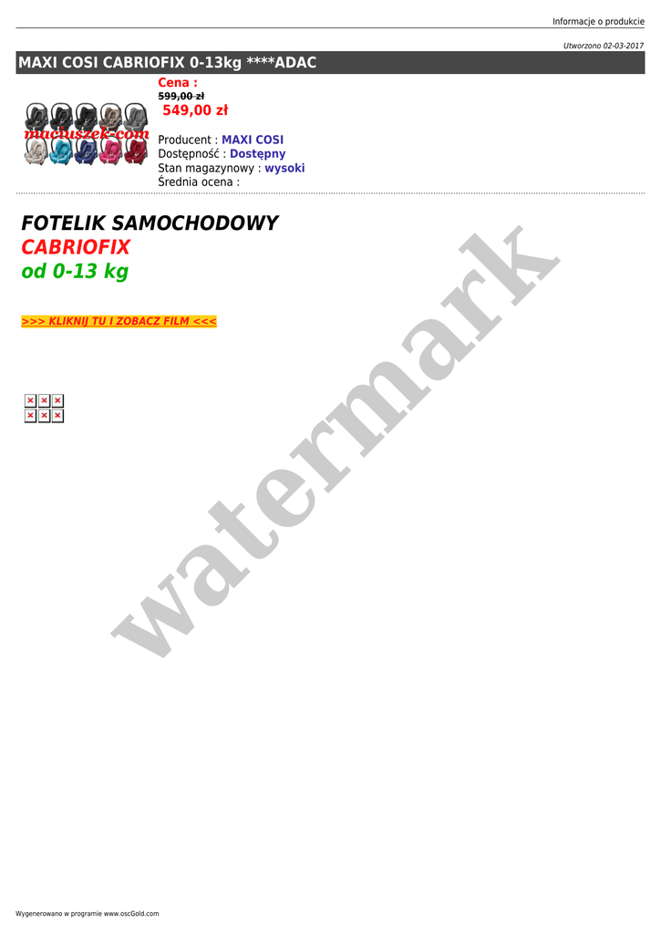Informacje o produkcie Utworzono 02-03-2017 MAXI COSI CABRIOFIX 0-13kg ****ADAC Cena : 599,00 zł 549,00 zł Producent : MAXI COSI Dostępność : Dostępny Stan magazynowy : wysoki Średnia ocena : er m ar k FOTELIK SAMOCHODOWY CABRIOFIX od 0-13 kg w at >>> KLIKNIJ TU I ZOBACZ FILM <<< Wygenerowano w programie www.oscGold.com KLIKNIJ TU I ZOBACZ TESTY ZDERZENIOWE ****ADAC er m ar k Fotelik CabrioFix stosowany moze być z dwoma podstawami. EasyFix do mocowania w samochodach z systemem ISOFIX. EasyBase do mocowania w samochodach bez systemu ISOFIX, za pomocą trzypunktowych pasów bezpieczeństwa. To doskonały przenośny, wielofunkcyjny fotelik samochodowy dla najmłodszych dzieci, od pierwszych dni życia do chwili gdy osiągną wagę 13 kg. Montowany 3-pnunktowym samochodowym pasem bezpieczeństwa, tyłem do kierunku jazdy, na przednim lub tylnym siedzeniu ale tylko na takim ,do którego nie przynależy poduszka powietrzna. Model ten został wyposażony w najnowsze rozwiązania z dziedziny zabezpieczeń dzieci podczas jazdy samochodem oraz akcesoria niezbędne dla bezpieczeństwa i komfortu niemowlęcia. Niestabilną, dużą i ciężką główkę dziecka w pierwszych miesiącach jego życia chroni solidny wałeczek ochronny. SPS - boczny system ochrony , dodatkowo chroni głowę dziecka podczas bocznych uderzeń. at Bardzo praktyczny daszek naciągany na pałąk ochroni dziecko przed słońcem , wiatrem lub opadami - przydatny zarówno w czasie jazdy samochodem , a niezbędny wtedy gdy dziecko korzysta z fotelika poza autem. Zawsze "pod ręką", bo chowany w listwie skorupy fotelika. Szybki i wygodny system regulacji szelek ułatwia rodzicom sprawne oraz prawidłowe zabezpieczenie dziecka w foteliku. By szelki barkowe przebiegały prawidłowo nad ramionami dziecka w oparciu fotelika przewidziano szczelinki umożliwiające przełożenie szelek na odpowiednia wysokość. w Szelki spina centralny zamek. Zaczepy z obu boków fotelika pomogą przygotować pasy , tak by nie były przekręcone podczas wpinania malucha do fotelika. Otulinki na szelki, niezbędne na lato, ochronią dziecko przed bezpośrednim kontaktem z pasami - podrażnieniami lub otarciami. Z tyłu skorupy znajduje się praktyczny pojemnik na drobiazgi. Możliwość wypięcia tapicerki. Cały fotelik łatwy w utrzymaniu w czystości. Ten model jak wszystkie inne foteliki Maxi-Cosi dla dzieci do 13 kg. można wpinać do stelaży wózków Maxi-Cosi i Quinny Wymiary Dostępne opcje MAXI COSI CABRIOFIX 0-13kg ****ADAC » MAXI COSI: BLACK RAVEN CF, ROBIN RED CF, BLACK CRYSTAL CF, CONCRETE GREY CF, RIVER BLUE CF, BROWN EARTH CF, ORIGAMI BLACK CF, ORIGAMI RED CF, WATERCOLOR BLUE CF, SPARKLING GREY CF, STAR CF.