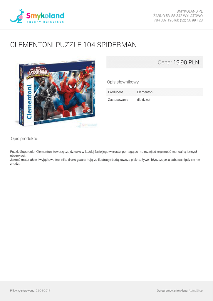 SMYKOLAND.PL ŻABNO 53, 88-342 WYLATOWO 784 387 126 lub (52) 56 99 128 CLEMENTONI PUZZLE 104 SPIDERMAN Cena: 19,90 PLN Opis słownikowy Producent Clementoni Zastosowanie dla dzieci Opis produktu Puzzle Supercolor Clementoni towarzyszą dziecku w każdej fazie jego wzrostu, pomagając mu rozwijać zręczność manualną i zmysł obserwacji. Jakość materiałów i wyjątkowa technika druku gwarantują, że ilustracje bedą zawsze piękne, żywe i błyszczące, a zabawa nigdy się nie znudzi. Plik wygenerowano: 02-03-2017 Powered by TCPDF (www.tcpdf.org) Oprogramowanie sklepu: AptusShop