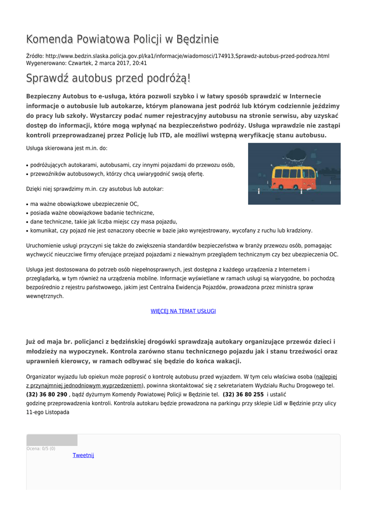 Komenda Powiatowa Policji w Będzinie Źródło: http://www.bedzin.slaska.policja.gov.pl/ka1/informacje/wiadomosci/174913,Sprawdz-autobus-przed-podroza.html Wygenerowano: Czwartek, 2 marca 2017, 20:41 Sprawdź autobus przed podróżą! Bezpieczny Autobus to e-usługa, która pozwoli szybko i w łatwy sposób sprawdzić w Internecie informacje o autobusie lub autokarze, którym planowana jest podróż lub którym codziennie jeździmy do pracy lub szkoły. Wystarczy podać numer rejestracyjny autobusu na stronie serwisu, aby uzyskać dostęp do informacji, które mogą wpłynąć na bezpieczeństwo podróży. Usługa wprawdzie nie zastąpi kontroli przeprowadzanej przez Policję lub ITD, ale możliwi wstępną weryfikację stanu autobusu. Usługa skierowana jest m.in. do: ● podróżujących autokarami, autobusami, czy innymi pojazdami do przewozu osób, ● przewoźników autobusowych, którzy chcą uwiarygodnić swoją ofertę. Dzięki niej sprawdzimy m.in. czy asutobus lub autokar: ● ma ważne obowiązkowe ubezpieczenie OC, ● posiada ważne obowiązkowe badanie techniczne, ● dane techniczne, takie jak liczba miejsc czy masa pojazdu, ● komunikat, czy pojazd nie jest oznaczony obecnie w bazie jako wyrejestrowany, wycofany z ruchu lub kradziony. Uruchomienie usługi przyczyni się także do zwiększenia standardów bezpieczeństwa w branży przewozu osób, pomagając wychwycić nieuczciwe firmy oferujące przejazd pojazdami z nieważnym przeglądem technicznym czy bez ubezpieczenia OC. Usługa jest dostosowana do potrzeb osób niepełnosprawnych, jest dostępna z każdego urządzenia z Internetem i przeglądarką, w tym również na urządzenia mobilne. Informacje wyświetlane w ramach usługi są wiarygodne, bo pochodzą bezpośrednio z rejestru państwowego, jakim jest Centralna Ewidencja Pojazdów, prowadzona przez ministra spraw wewnętrznych. WIĘCEJ NA TEMAT USŁUGI Już od maja br. policjanci z będzińskiej drogówki sprawdzają autokary organizujące przewóz dzieci i młodzieży na wypoczynek. Kontrola zarówno stanu technicznego pojazdu jak i stanu trzeźwości oraz uprawnień kierowcy, w ramach odbywać się będzie do końca wakacji. Organizator wyjazdu lub opiekun może poprosić o kontrolę autobusu przed wyjazdem. W tym celu właściwa osoba (najlepiej z przynajmniej jednodniowym wyprzedzeniem), powinna skontaktować się z sekretariatem Wydziału Ruchu Drogowego tel. (32) 36 80 290 , bądź dyżurnym Komendy Powiatowej Policji w Będzinie tel. (32) 36 80 255 i ustalić godzinę przeprowadzenia kontroli. Kontrola autokaru będzie prowadzona na parkingu przy sklepie Lidl w Będzinie przy ulicy 11-ego Listopada Ocena: 0/5 (0) Tweetnij