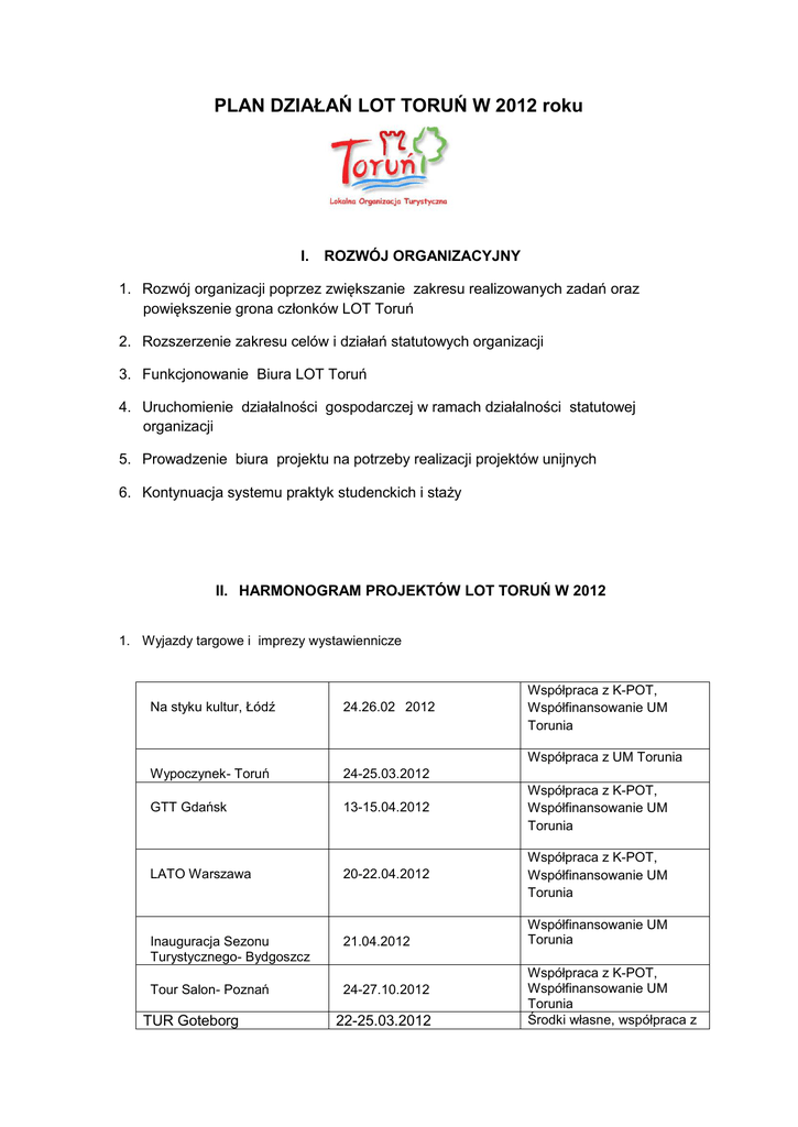 PLAN DZIAŁAŃ LOT TORUŃ W 2012 roku