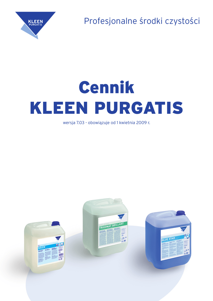 Profesjonalne środki czystości Cennik KLEEN PURGATIS wersja 7.03 - obowi¹zuje od 1 kwietnia 2009 r. ŚRODKI DO GRUNTOWNEGO CZYSZCZENIA Nazwa produktu Nr produktu TERRANO Środek do usuwania powłok polimerowych i gruntownego czyszczenia TERRADUR Alkaliczny środek do usuwania pow³ok polimerowych i gruntownego czyszczenia SOLEX Środek do usuwania powłok polimerowych i gruntownego czyszczenia metodą „na sucho” FOSGALIT Środek do rozpuszczania powłok polimerowych HURRICAN Alkaliczny środek usuwający silne zabrudzenia INDUSTRIAL FORTE Środek do gruntownego czyszczenia przemysłowego NITOR Środek do gruntownego czyszczenia podłóg mikroporowatych PICCOMAT FS Środek do gruntownego czyszczenia podłóg Opakowanie Cena 800.463 800.040 butelka 1 litr [6 szt. w kart.] kanister 10 litrów 16,39 z³ 133,10 z³ 800.041 kanister 10 litrów 170,50 z³ 121.831 kanister 5 litrów 156,20 z³ 121.842 kanister 10 litrów 306,90 z³ 800.042 kanister 10 litrów 170,50 zł 801.592 801.595 kanister 10 litrów beczka 200 litrów 104,50 z³ 2090,00 z³ 121.823 121.822 butelka 1 litr [6 szt. w kart.] kanister 10 litrów 21,89 z³ 181,50 z³ 121.932 kanister 10 litrów 174,90 zł ŚRODKI DO KONSERWACJI Nazwa produktu Nr produktu MAMMUT Dyspersja polimerowo-metaliczna do powlekania pod³óg MONOMAT BRILLANT Dyspersja polimerowa do powlekania pod³óg BIGOMAT BRILLANT Wysoko po³yskowa dyspersja polimerowa do powlekania pod³óg BIGOMAT MATT Matowa dyspersja polimerowa do powlekania pod³óg TRIGOMAT BRILLANT Dyspersja polimerowa do powlekania pod³óg, odporna na środki dezynfekuj¹ce KLEEN CLEANER Środek do pielêgnacji oraz polerowania pod³óg i odnawiania pow³ok zabezpieczaj¹cych SLIDE STOP Antypoślizgowa dyspersja polimerowa do powlekania pod³óg POLYMER GRUNT Dyspersja pod³ogowa do powierzchni porowatych i absorbuj¹cych wodê SELF SHINE Emulsja samopołyskowa do podłóg PROFESSIONAL WAX Płynny wosk do impregnacji podłóg drewnianych MEGA KLEEN Środek do impregnacji pod³óg kamiennych i betonowych Opakowanie Cena 800.021 kanister 10 litrów 273,90 z³ 162.972 kanister 10 litrów 214,50 z³ 162.952 kanister 10 litrów 295,50 z³ 162.962 kanister 10 litrów 295,50 z³ 162.882 kanister 10 litrów 405,90 z³ 162.991 kanister 5 litrów 614,90 z³ 162.812 kanister 10 litrów 258,50 z³ 162.902 kanister 10 litrów 317,90 z³ 162.802 kanister 10 litrów 181,50 zł 162.862 kanister 10 litrów 295,90 z³ 162.931 kanister 5 litrów 654,50 zł ŚRODKI DO MYCIA I PIELÊGNACJI Nazwa produktu SAPOFIX Środek myj¹co-pielêgnuj¹cy na bazie myd³a z dodatkiem gliceryny SOMALIN Środek myj¹co-pielêgnuj¹cy na bazie myd³a KLAR CITRO Antypoślizgowy środek myj¹co-pielêgnuj¹cy POLYDET Środek myj¹co-pielêgnuj¹cy do pod³óg powlekanych PREMIUM nr 3 Środek czyszcz¹cy do pod³óg drewnianych i laminowanych PREMIUM nr 4 Środek myj¹co-pielêgnuj¹cy Nr produktu Opakowanie Cena 800.012 kanister 10 litrów 119,90 z³ 800.013 kanister 10 litrów 95,70 z³ 111.023 111.022 butelka 1 litr [6 szt. w kart + 1 doz.] kanister 10 litrów 19,25 zł 141,90 z³ 800.173 800.017 butelka 1 litr [6 szt. w kart.] kanister 10 litrów 13,75 zł 115,50 z³ 121.713 121.712 butelka 1 litr [6 szt. w kart.] kanister 10 litrów 15,95 zł 130,90 z³ 121.723 121.722 butelka 1 litr [6 szt. w kart.] kanister 10 litrów 19,25 zł 141,90 z³ ŚRODKI DO SANITARIATÓW Nazwa produktu Nr produktu SANIVEX Środek do gruntownego czyszczenia sanitariatów PRESTICID Środek do gruntownego czyszczenia sanitariatów PREMIUM nr 1 CLASSIC Środek do bie¿¹cego czyszczenia sanitariatów PREMIUM nr 1 PLUS Środek do bie¿¹cego czyszczenia sanitariatów PUSH WC Środek do bie¿¹cego czyszczenia WC WC TABS 2-fazowe tabletki czyszcz¹ce do WC i pisuarów OROSEPT SC Chlorowo-zasadowy środek do higienicznego czyszczenia sanitariatów Opakowanie Cena 800.433 800.043 butelka 1 litr [6 szt. w kart.] kanister 10 litrów 13,75 z³ 115,50 z³ 800.044 800.445 kanister 10 litrów beczka 200 litrów 183.303 183.302 butelka 1 litr [6 szt. w kart.] kanister 10 litrów 17,05 z³ 137,50 z³ 183.353 183.352 butelka 1 litr [6 szt. w kart.] kanister 10 litrów 17,05 z³ 137,50 z³ 600.678 butelka 0,75L [12 szt. w kart.] 11,99 z³ 183.188 karton 30 szt. x 25 g 30,69 z³ 142.623 142.622 butelka 1 litr [6 szt. w kart.] kanister 10 litrów 24,09 z³ 192,50 z³ 152,90 z³ 2750,00 z³ ODŚWIE¯ACZE POWIETRZA Nazwa produktu Nr produktu ODŚWIE¯ACZ ULVIMA Środek zapachowy do toalet ODŚWIE¯ACZ nr 1 CLASSIC Środek zapachowy do toalet LONG LIFE DEO Odświeżacz powietrza ODŚWIE¯ACZ APARTO Środek odświe¿aj¹co-zapachowy do wszystkich pomieszczeñ ODŚWIE¯ACZ CONVINIA Środek odświe¿aj¹co-zapachowy do wszystkich pomieszczeñ Opakowanie Cena 803.013 butelka 1 litr [6 szt. w kart.] 31,90 z³ 183.173 butelka 1 litr [6 szt. w kart.] 31,90 z³ 369.633 369.632 butelka 1L (6 szt. w kartonie) kanister 10 litrów 27,50 z³ 203,50 z³ 151.018 151.011 butelka 0,5L ze sprysk. [12 szt. w kart.] kanister 5 litrów 37,95 z³ 236,50 z³ 151.028 151.021 butelka 0,5L ze sprysk. [12 szt. w kart.] kanister 5 litrów 32,89 z³ 181,50 z³ ŚRODKI DO GASTRONOMII Nazwa produktu PRESTAN CF Wysoko alkaliczny, bezchlorowy środek myjący do zmywarek przemysłowych PRESTAN INTENSIV Wybielający środek myjący z aktywnym chlorem, do zmywarek przemysłowych GLASS WASHING DETERGENT Środek do czyszczenia szkła, do zmywarek przemysłowych PRESTAN BTR Środek do usuwania osadów ze sztućców PRESTAN HH Środek myjący w postaci proszku, do zmywarek przemysłowych PRESTAN CLEAR Neutralny, nabłyszczający środek płuczący do zmywarek przemysłowych PRESTAN CLEAR FORTE Kwaśny, nabłyszczający środek płuczący do zmywarek przemysłowych DISHWASHER TABS „3in1” Tabletki do zmywarek przemys³owych PRESTAN EKF Płynny środek odkamieniający do zmywarek i pralnic przemysłowych PARA DECALCIFIER Środek do usuwania osadów wapiennych, odkamieniacz DECALCIFIER TABS Tabletki odkam