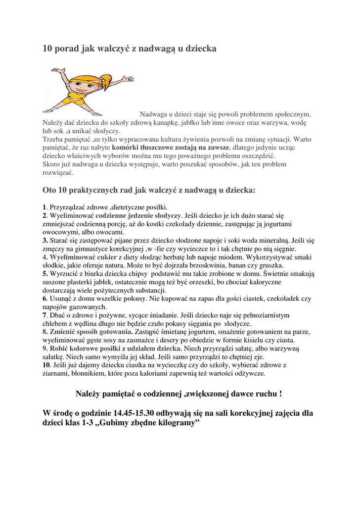 10 porad jak walczyć z nadwagą u dziecka Nadwaga u dzieci staje się powoli problemem społecznym. Należy dać dziecku do szkoły zdrową kanapkę, jabłko lub inne owoce oraz warzywa, wodę lub sok ,a unikać słodyczy. Trzeba pamiętać ,ze tylko wypracowana kultura żywienia pozwoli na zmianę sytuacji. Warto pamiętać, że raz nabyte komórki tłuszczowe zostają na zawsze, dlatego jedynie ucząc dziecko właściwych wyborów można mu tego poważnego problemu oszczędzić. Skoro już nadwaga u dziecka występuje, warto poszukać sposobów, jak ten problem rozwiązać. Oto 10 praktycznych rad jak walczyć z nadwagą u dziecka: 1. Przyrządzać zdrowe ,dietetyczne posiłki. 2. Wyeliminować codzienne jedzenie słodyczy. Jeśli dziecko je ich dużo starać się zmniejszać codzienną porcję, aż do kostki czekolady dziennie, zastępując ją jogurtami owocowymi, albo owocami. 3. Starać się zastępować pijane przez dziecko słodzone napoje i soki woda mineralną. Jeśli się zmęczy na gimnastyce korekcyjnej ,w -fie czy wycieczce to i tak chętnie po nią sięgnie. 4. Wyeliminować cukier z diety słodząc herbatę lub napoje miodem. Wykorzystywać smaki słodkie, jakie oferuje natura. Może to być dojrzała brzoskwinia, banan czy gruszka. 5. Wyrzucić z biurka dziecka chipsy podstawić mu takie zrobione w domu. Świetnie smakują suszone plasterki jabłek, ostatecznie mogą też być orzeszki, bo chociaż kaloryczne dostarczają wiele pożytecznych substancji. 6. Usunąć z domu wszelkie pokusy. Nie kupować na zapas dla gości ciastek, czekoladek czy napojów gazowanych. 7. Dbać o zdrowe i pożywne, sycące śniadanie. Jeśli dziecko naje się pełnoziarnistym chlebem z wędlina długo nie będzie czuło pokusy sięgania po słodycze. 8. Zmienić sposób gotowania. Zastąpić śmietanę jogurtem, smażenie gotowaniem na parze, wyeliminować gęste sosy na zasmażce i desery po obiedzie w formie kisielu czy ciasta. 9. Robić kolorowe posiłki z udziałem dziecka. Niech przyrządzi sałatę, albo warzywną sałatkę. Niech samo wymyśla jej skład. Jeśli samo przyrządzi to chętniej zje. 10. Jeśli już dajemy dziecku ciastka na wycieczkę czy do szkoły, wybierać zdrowe z ziarnami, błonnikiem, które poza kaloriami zapewnią też wartości odżywcze. Należy pamiętać o codziennej ,zwiększonej dawce ruchu ! W środę o godzinie 14.45-15.30 odbywają się na sali korekcyjnej zajęcia dla dzieci klas 1-3 „Gubimy zbędne kilogramy” Informacja dla rodziców dzieci z nadwaga ,bądź zagrożonych innymi chorobami cywilizacyjnymi, min, cukrzycą, które nie uczestniczą ,lub zakończyły już udział w Programie 6-10-14 dla zdrowia. Można napisać prośbę o kwalifikacje Państwa dziecka do Programu 6 –10-14 dla zdrowia w celu przebadania dziecka i uzyskania dodatkowej porady lekarzy specjalistów z Uniwersyteckiego Centrum Klinicznego w Gdańsku, ul. Dębinki 7. Należy podać imię, nazwisko, datę urodzenia, szkolę ,wzrost i wagę dziecka oraz Państwa dane kontaktowe (imię , nazwisko, nr. telefonu) na adres [email protected] nr. tel. 58 340 88 59 strona internetowa www.dla zdrowia.uck.gda.pl