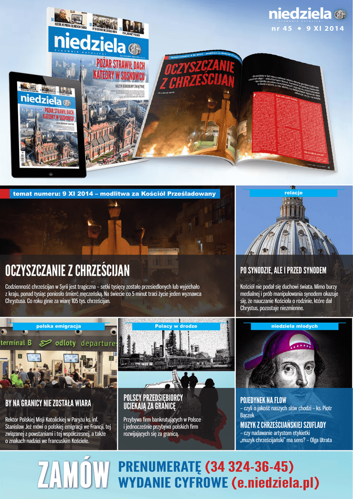 niedziela T Y G O D nr 45 temat numeru: 9 XI 2014 – modlitwa za Kościół Prześladowany OCZYSZCZANIE Z CHRZEŚCIJAN BY NA GRANICY NIE ZOSTAŁA WIARA Rektor Polskiej Misji Katolickiej w Paryżu ks. inf. Stanisław Jeż mówi o polskiej emigracji we Francji, tej związanej z powstaniami i tej współczesnej, a także o znakach nadziei we francuskim Kościele. ZAMÓW I K K A T O L I C K I 9 XI 2014 relacje PO SYNODZIE, ALE I PRZED SYNODEM Codzienność chrześcijan w Syrii jest tragiczna – setki tysięcy zostało przesiedlonych lub wyjechało z kraju, ponad tysiąc poniosło śmierć męczeńską. Na świecie co 5 minut traci życie jeden wyznawca Chrystusa. Co roku ginie za wiarę 105 tys. chrześcijan. polska emigracja N Polacy w drodze Kościół nie podał się duchowi świata. Mimo burzy medialnej i prób manipulowania synodem okazuje się, że nauczanie Kościoła o rodzinie, które dał Chrystus, pozostaje niezmienne. niedziela mlodych POLSCY PRZEDSIĘBIORCY UCIEKAJĄ ZA GRANICĘ POJEDYNEK NA FLOW Przybywa firm bankrutujących w Polsce i jednocześnie przybywa polskich firm rozwijających się za granicą. MUZYK Z CHRZEŚCIJAŃSKIEJ SZUFLADY – czyli o jakość naszych słów chodzi – ks. Piotr Bączek – czy nadawanie artystom etykietki „muzyk chrześcijański” ma sens? – Olga Utrata PRENUMERATĘ (34 324-36-45) WYDANIE CYFROWE (e.niedziela.pl) Zapraszamy do lektury „Niedzieli” nr 45 na 9 listopada 2014 r. Proponujemy m.in. artykuły: Temat numeru: Modlitwa za Kościół Prześladowany Oczyszczanie z chrześcijan Codzienność chrześcijan w Syrii jest tragiczna – setki tysięcy zostało przesiedlonych lub wyjechało z kraju, ponad tysiąc poniosło śmierć męczeńską. Na świecie co 5 minut traci życie jeden wyznawca Chrystusa. Co roku ginie za wiarę 105 tys. chrześcijan. Po synodzie, ale i przed synodem Kościół nie podał się duchowi świata. Mimo burzy medialnej i prób manipulowania synodem okazuje się, że nauczanie Kościoła o rodzinie, które dał Chrystus, pozostaje niezmienne. By na granicy nie została wiara Rektor Polskiej Misji Katolickiej w Paryżu ks. inf. Stanisław Jeż mówi o polskiej emigracji we Francji, tej związanej z powstaniami i tej współczesnej, a także o znakach nadziei we francuskim Kościele. Polscy przedsiębiorcy uciekają za granicę Przybywa firm bankrutujących w Polsce i jednocześnie przybywa polskich firm rozwijających się za granicą. Post scriptum do filmu „Bogowie” Film „Bogowie” przypomina trudną drogę do pierwszego przeszczepu serca w Polsce. Siła z siłą Funkcjonariusze obcego wywiadu pracują w dyplomacji, przedstawicielstwach handlowych, firmach i spółkach. O szpiegach i agentach mówi autor książki „Rosyjski sztylet”. W „Niedzieli Młodych”: * POJEDYNEK NA FLOW – czyli o jakość naszych słów chodzi – ks. Piotr Bączek. * MUZYK Z CHRZEŚCIJAŃSKIEJ SZUFLADY – czy nadawanie artystom etykietki „muzyk chrześcijański” ma sens? – Olga Utrata.