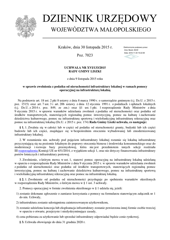 DZIENNIK URZĘDOWY WOJEWÓDZTWA MAŁOPOLSKIEGO Kraków, dnia 30 listopada 2015 r. Elektronicznie podpisany przez: Artur Słowik; MUW Poz. 7023 Data: 2015-11-30 15:22:58 UCHWAŁA NR XVI/133/2015 RADY GMINY LISZKI z dnia 9 listopada 2015 roku w sprawie zwolnienia z podatku od nieruchomości infrastruktury lokalnej w ramach pomocy operacyjnej na infrastrukturę lokalną Na podstawie art. 18 ust. 2 pkt 8 ustawy z dnia 8 marca 1990 r. o samorządzie gminnym (t.j. Dz.U. z 2015 r. poz. 1515) oraz art. 7 ust. 3 i art. 20b ustawy z dnia 12 stycznia 1991 r. o podatkach i opłatach lokalnych (t.j. Dz.U. z 2014 r. poz. 849, ze zm.) oraz §1 ust. 1 pkt. 1 rozporządzenie Rady Ministrów z dnia 9 stycznia 2015 r. w sprawie warunków udzielania zwolnień z podatku od nieruchomości oraz podatku od środków transportowych, stanowiących regionalną pomoc inwestycyjną, pomoc na kulturę i zachowanie dziedzictwa kulturowego, pomoc na infrastrukturę sportową i wielofunkcyjną infrastrukturę rekreacyjną oraz pomoc na infrastrukturę lokalną (Dz.U. z 2015 r. poz. 174) Rada Gminy Liszki uchwala, co następuje: § 1. 1. Zwalnia się w całości lub w części od podatku od nieruchomości grunty, budynki lub ich części budowle lub ich części, znajdujące się w bezpośrednim otoczeniu wybudowanej lub zmodernizowanej infrastruktury lokalnej. 2. W rozumieniu nin. uchwały pod pojęciem infrastruktury lokalnej rozumie się lokalną infrastrukturę przyczyniającą się na poziomie lokalnym do poprawy otoczenia biznesu i środowiska konsumenckiego oraz do modernizacji i rozwoju bazy przemysłowej, która nie jest przedmiotem innych sekcji rozdziału III rozporządzenia Komisji UE nr 651/2014, z wyjątkiem sekcji 1, oraz nie dotyczy finansowania infrastruktury portów lotniczych i infrastruktury portowej. 3. Zwolnienie, o którym mowa w ust. 1, stanowi pomoc operacyjną na infrastrukturę lokalną udzielaną w oparciu o rozporządzenie Rady Ministrów z dnia 9 stycznia 2015 r. w sprawie warunków udzielania zwolnień z podatku od nieruchomości oraz podatku od środków transportowych, stanowiących regionalną pomoc inwestycyjną, pomoc na kulturę i zachowanie dziedzictwa kulturowego, pomoc na infrastrukturę sportową i wielofunkcyjną infrastrukturę rekreacyjną oraz pomoc na infrastrukturę lokalną. § 2. 1. Zwolnienie od podatku od nieruchomości przysługuje po spełnieniu warunków określonych w rozporządzeniu Rady Ministrów, o którym mowa w § 1 ust. 3 uchwały. 2. Pomocy operacyjnej w formie zwolnienia określonego w § 1 udziela się, jeżeli: 1) zostanie dokonane zgłoszenie o zamiarze korzystania z pomocy na formularzu stanowiącym załącznik nr 1 do nin. Uchwały, 2) infrastruktura zostanie udostępniona zainteresowanym użytkownikom, 3) zostanie udzielona koncesja lub eksploatacja infrastruktury zostanie powierzona innej formie osobie trzeciej w oparciu o otwarte, przejrzyste i niedyskryminujące zasady, 4) cena pobierana za użytkowanie lub sprzedaż infrastruktury odpowiadać będzie cenie rynkowej. § 3. Uchwała obowiązuje do dnia 31 grudnia 2020 r. Dziennik Urzędowy Województwa Małopolskiego –2– Poz. 7023 § 4. Wykonanie uchwały powierza się Wójtowi Gminy. § 5. Uchwałę podaje się do wiadomości przez rozplakatowanie i przez umieszczenie na stronie internetowej. § 6. Uchwała wchodzi w życie po upływie 14 dni od dnia ogłoszenia w Dzienniku Urzędowym Województwa Małopolskiego z mocą obowiązującą od 1 stycznia 2016 r. Przewodniczący Rady Gminy Liszki mgr inż. Zbigniew Kaczor Dziennik Urzędowy Województwa Małopolskiego –3– Poz. 7023 Załącznik do Uchwały Nr XVI/133/2015 Rady Gminy Liszki z dnia 9 listopada 2015 r. Przewodniczący Rady Gminy Liszki mgr inż. Zbigniew Kaczor