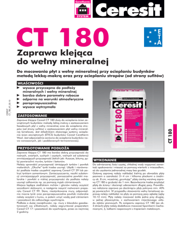 CT 180 Zaprawa klejąca do wełny mineralnej WŁAŚCIWOŚCI wysoce przyczepna do podłoży mineralnych i wełny mineralnej bardzo dobre parametry robocze odporna na warunki atmosferyczne paroprzepuszczalna wysoce wytrzymała ZASTOSOWANIE Zaprawa klejąca Ceresit CT 180 służy do ocieplania ścian zewnętrznych budynków metodą lekką-mokrą z zastosowaniem fasadowych płyt z wełny mineralnej oraz do ocieplania stropów (od strony sufitów) z zastosowaniem płyt wełny mineralnej lamelowej. Jest składnikiem złożonego systemu ocieplania ścian zewnętrznych (ETICS) budynków Ceresit Ceretherm Wool. Jest odpowiednia zarówno do ocieplania budynków nowo wznoszonych, jak i poddawanych termorenowacji. CT 180 CERESIT CT_180_KT_03.10 Do mocowania płyt z wełny mineralnej przy ocieplaniu budynków metodą lekką-mokrą oraz przy ocieplaniu stropów (od strony sufitów) PRZYGOTOWANIE PODŁOŻA Zaprawa klejąca CT 180 ma bardzo dobrą przyczepność do nośnych, zwartych, suchych i czystych, wolnych od substancji zmniejszających przyczepność (takich jak: tłuszcze, bitumy, pyły) powierzchni murów, tynków i betonów. Należy sprawdzić przyczepność istniejących tynków i powłok malarskich. „Głuche” tynki trzeba usunąć. Ubytki i nierówności podłoża trzeba uzupełnić zaprawą Ceresit CT 29 lub pokryć tynkiem cementowym. Zanieczyszczenia, resztki substancji zmniejszających przyczepność, paroszczelne powłoki malarskie i powłoki o niskiej przyczepności do podłoża należy usunąć całkowicie np. za pomocą myjek ciśnieniowych. Miejsca będące siedliskiem mchów i glonów należy oczyścić szczotkami stalowymi, a następnie nasycić roztworem preparatu Ceresit CT 99. Stare, nieotynkowane mury, odpowiednio mocne tynki oraz paroprzepuszczalne powłoki malarskie należy oczyścić z kurzu, a potem umyć wodą pod ciśnieniem i pozostawić do całkowitego wyschnięcia. Podłoża o dużej nasiąkliwości, np. mury z bloczków gazobetonowych czy silikatowych, należy zagruntować preparatem Ceresit CT 17 i pozostawić do wyschnięcia, przez co najmniej 2 godziny. WYKONANIE Do odmierzonej ilości czystej, chłodnej wody wsypywać zawartość opakowania i mieszać za pomocą wiertarki z mieszadłem, aż do uzyskania jednorodnej masy bez grudek. Gotową zaprawę należy nakładać kielnią po obwodzie płyty pasmem o szerokości 3÷4 cm i kilkoma plackami o średnicy ok. 8 cm, wcześniej „gruntując” płytę cienką warstwą zaprawy CT 180 o grubości do 1 mm. Bezzwłocznie trzeba przyłożyć płytę do ściany i docisnąć uderzeniami długiej pacy. Prawidłowo nałożona zaprawa po dociśnięciu płyty pokrywa min. 40% jej powierzchni. W przypadku stosowania wełny lamelowej zaprawę należy nakładać na płyty za pomocą pacy zębatej (zęby 10-12 mm). Płyty należy mocować ściśle jedna przy drugiej, w jednej płaszczyźnie, z zachowaniem mijankowego układu styków pionowych. Po związaniu zaprawy CT 180 (po ok. 3 dniach) płyty należy dodatkowo mocować łącznikami mechanicznymi, tj. kołkami rozporowymi z trzpieniem metalowym. DANE TECHNICZNE Prace należy wykonywać w suchych warunkach, przy temperaturze powietrza i podłoża od +5°C do +25°C. Wszelkie dane odnoszą się do temperatury +20°C oraz wilgotności względnej powietrza 60%. W innych warunkach należy uwzględnić szybsze lub wolniejsze wiązanie materiału. Sypka zaprawa CT 180 ma właściwości drażniące, a zawartość cementu powoduje, że wyrób zmieszany z wodą ma odczyn alkaliczny. W związku z tym należy chronić naskórek i oczy. W przypadku kontaktu materiału z oczami płukać je obficie wodą i zasięgnąć porady lekarza. Zawartość chromu VI – poniżej 2 ppm w okresie ważności wyrobu. ZALECENIA Należy stosować płyty z wełny mineralnej, które nadają się do ocieplania budynków metodą lekką-mokrą. Szczegóły dotyczące prac ociepleniowych opisane są w Instrukcji ITB nr 418/2007 oraz 447/2009. Niniejsza karta techniczna określa zakres stosowania materiału i zalecany sposób prowadzenia robót, ale nie może zastąpić zawodowego przygotowania wykonawcy. Oprócz podanych zaleceń prace należy wykonywać zgodnie ze sztuką budowlaną i zasadami BHP. Producent gwarantuje jakość wyrobu, natomiast nie ma wpływu na warunki i sposób jego użycia. W przypadku wątpliwości należy wykonać własne próby stosowania. Wraz z ukazaniem się tej karty technicznej tracą ważność karty wcześniejsze. Baza: mieszanka cementów z wypełniaczami mineralnymi i modyfikatorami Gęstość nasypowa: ok. 1,6 kg/dm3 Proporcje mieszania: 4,75-5,25 l wody na 25 kg Temperatura stosowania: od +5°C do +25°C Czas zużycia: do 1,5 godz. Przyczepność: do betonu do wełny Orientacyjne zużycie: Do 12 miesięcy od daty produkcji, przy składowaniu na paletach, w suchych warunkach i w oryginalnych, nieuszkodzonych opakowaniach. Wyrób posiada następujące dokumenty odniesienia: - Europejską Aprobatę Techniczną ETA w systemach: System Ceresit Ceretherm ETA CT 180 Classic Classic (R) 09/0026 09/0360 Certyfikat 1488-CPD-0127/W 1488-CPD-0128/W D.Z.: Ceresit Ceretherm Classic /1/10/WE wydana 04.01.2010 Classic (R) EC 3 wydana 25.01.2010 System Ceresit Ceretherm AT Certyfikat Worki 25 kg. ok. 4,5 kg/m2 - Aprobatę Techniczną w systemach: SKŁADOWANIE OPAKOWANIA > 0,3 MPa > 0,05 (rozerwanie w warstwie wełny) D.Z.: Ceresit Ceretherm Wool Classic Wool Garage 15-3717/2008 15-7956/2009 ITB-0110/Z ITB-0320/Z Wool Classic /1/09/ wydana 02.02.2009 Wool Garage /1/09 wydana 26.03.2009 Henkel Polska Sp. z o.o. ul. Domaniewska 41, 02-672 Warszawa Centralny Dział Obsługi Klienta: Tel. (+48) 41 371 01 00 • Fax (+48) 41 374 22 22 www.ceresit.pl • infolinia: 800 120 241 Buduj korzystając z profesjonalnych rozwiązań. CERESIT CT_180_KT_03.10 UWAGA