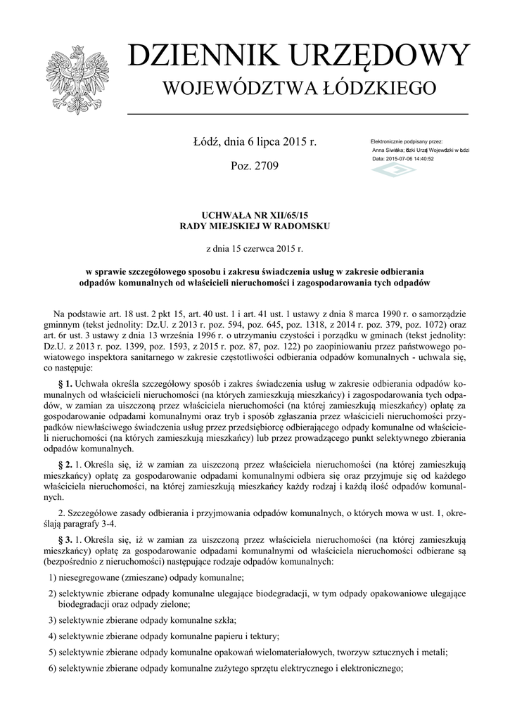 DZIENNIK URZĘDOWY WOJEWÓDZTWA ŁÓDZKIEGO Łódź, dnia 6 lipca 2015 r. Elektronicznie podpisany przez: Anna Siwińska; Łódzki Urząd Wojewódzki w Łodzi Poz. 2709 Data: 2015-07-06 14:40:52 UCHWAŁA NR XII/65/15 RADY MIEJSKIEJ W RADOMSKU z dnia 15 czerwca 2015 r. w sprawie szczegółowego sposobu i zakresu świadczenia usług w zakresie odbierania odpadów komunalnych od właścicieli nieruchomości i zagospodarowania tych odpadów Na podstawie art. 18 ust. 2 pkt 15, art. 40 ust. 1 i art. 41 ust. 1 ustawy z dnia 8 marca 1990 r. o samorządzie gminnym (tekst jednolity: Dz.U. z 2013 r. poz. 594, poz. 645, poz. 1318, z 2014 r. poz. 379, poz. 1072) oraz art. 6r ust. 3 ustawy z dnia 13 września 1996 r. o utrzymaniu czystości i porządku w gminach (tekst jednolity: Dz.U. z 2013 r. poz. 1399, poz. 1593, z 2015 r. poz. 87, poz. 122) po zaopiniowaniu przez państwowego powiatowego inspektora sanitarnego w zakresie częstotliwości odbierania odpadów komunalnych - uchwala się, co następuje: § 1. Uchwała określa szczegółowy sposób i zakres świadczenia usług w zakresie odbierania odpadów komunalnych od właścicieli nieruchomości (na których zamieszkują mieszkańcy) i zagospodarowania tych odpadów, w zamian za uiszczoną przez właściciela nieruchomości (na której zamieszkują mieszkańcy) opłatę za gospodarowanie odpadami komunalnymi oraz tryb i sposób zgłaszania przez właścicieli nieruchomości przypadków niewłaściwego świadczenia usług przez przedsiębiorcę odbierającego odpady komunalne od właścicieli nieruchomości (na których zamieszkują mieszkańcy) lub przez prowadzącego punkt selektywnego zbierania odpadów komunalnych. § 2. 1. Określa się, iż w zamian za uiszczoną przez właściciela nieruchomości (na której zamieszkują mieszkańcy) opłatę za gospodarowanie odpadami komunalnymi odbiera się oraz przyjmuje się od każdego właściciela nieruchomości, na której zamieszkują mieszkańcy każdy rodzaj i każdą ilość odpadów komunalnych. 2. Szczegółowe zasady odbierania i przyjmowania odpadów komunalnych, o których mowa w ust. 1, określają paragrafy 3-4. § 3. 1. Określa się, iż w zamian za uiszczoną przez właściciela nieruchomości (na której zamieszkują mieszkańcy) opłatę za gospodarowanie odpadami komunalnymi od właściciela nieruchomości odbierane są (bezpośrednio z nieruchomości) następujące rodzaje odpadów komunalnych: 1) niesegregowane (zmieszane) odpady komunalne; 2) selektywnie zbierane odpady komunalne ulegające biodegradacji, w tym odpady opakowaniowe ulegające biodegradacji oraz odpady zielone; 3) selektywnie zbierane odpady komunalne szkła; 4) selektywnie zbierane odpady komunalne papieru i tektury; 5) selektywnie zbierane odpady komunalne opakowań wielomateriałowych, tworzyw sztucznych i metali; 6) selektywnie zbierane odpady komunalne zużytego sprzętu elektrycznego i elektronicznego; Dziennik Urzędowy Województwa Łódzkiego –2– Poz. 2709 7) selektywnie zbierane odpady komunalne mebli i innych odpadów wielkogabarytowych; 8) selektywnie zbierane odpady komunalne zużytych opon. 2. Określa się, iż w zamian za uiszczoną przez właściciela nieruchomości (na której zamieszkują mieszkańcy) opłatę za gospodarowanie odpadami komunalnymi od właścicieli nieruchomości, na których zamieszkują mieszkańcy odbierane są z następującą częstotliwością następujące rodzaje odpadów komunalnych: 1) niesegregowane (zmieszane) odpady komunalne: a) w zabudowie jednorodzinnej - 1 raz na dwa tygodnie, b) w zabudowie wielolokalowej - 4 razy w tygodniu, z zastrzeżeniem lit. „c”, c) w szczególnych przypadkach - w zabudowie wielolokalowej - w zależności od potrzeb od 1 do 6 razy w tygodniu; 2) selektywnie zbierane odpady komunalne ulegające biodegradacji, w tym odpady opakowaniowe ulegające biodegradacji oraz odpady zielone: a) w zabudowie jednorodzinnej: - w okresie od 1 kwietnia do 31 października – 1 raz na dwa tygodnie, - w okresie od 1 listopada do 31 marca - 1 raz na miesiąc, b) w zabudowie wielolokalowej: - w okresie od 1 kwietnia do 31 października - 1 raz na tydzień, - w okresie od 1 listopada do 31 marca - 1 raz na dwa tygodnie; 3) selektywnie zbierane odpady komunalne: a) szkła - 1 raz na miesiąc, b) papieru i tektury - 1 raz na miesiąc, c) opakowań wielomateriałowych, tworzyw sztucznych i metali - 1 raz na miesiąc, d) zużytego sprzętu elektrycznego i elektronicznego - 2 razy na kwartał, e) mebli i innych odpadów wielkogabarytowych - 2 razy na kwartał, f) zużyte opony - 2 razy na kwartał. § 4. Określa się, iż w zamian za uiszczoną przez właściciela nieruchomości (na której zamieszkują mieszkańcy) opłatę za gospodarowanie odpadami komunalnymi od właściciela nieruchomości, gmina wyposaża każdego właściciela nieruchomości (na której zamieszkują mieszkańcy) w pojemniki (w tym worki) służące do zbierania odpadów komunalnych o pojemności minimalnej określonej w regulaminie oraz utrzymuje te pojemniki w odpowiednim stanie sanitarnym, porządkowym i technicznym. § 5. 1. Określa się, iż w zamian za uiszczoną przez właściciela nieruchomości (na której zamieszkują mieszkańcy) opłatę za gospodarowanie odpadami komunalnymi od właścicieli nieruchomości, na których zamieszkują mieszkańcy oraz od mieszkańców przyjmowane są według poniższych zasad: 1) odpady komunalne ulegające biodegradacji, w tym odpady opakowaniowe ulegające biodegradacji, odpady zielone, odpady budowlane i rozbiórkowe, meble oraz odpady wielkogabarytowe i zużyty sprzęt elektryczny i elektroniczny przyjmowane są w punktach selektywnej zbiórki odpadów komunalnych; 2) przeterminowane leki przyjmowane są w punktach selektywnej zbiórki odpadów komunalnych oraz w publicznie usytuowanych pojemnikach do selektywnej zbiórki odpadów; adresy punktów zostaną wskazane na stronie internetowej gminy; 3) zużyte baterie i akumulatory przyjm