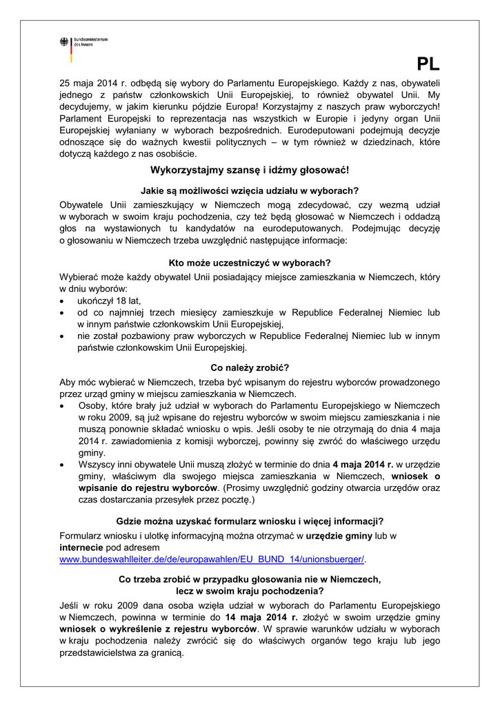 PL 25 maja 2014 r. odbędą się wybory do Parlamentu Europejskiego. Każdy z nas, obywateli jednego z państw członkowskich Unii Europejskiej, to również obywatel Unii. My decydujemy, w jakim kierunku pójdzie Europa! Korzystajmy z naszych praw wyborczych! Parlament Europejski to reprezentacja nas wszystkich w Europie i jedyny organ Unii Europejskiej wyłaniany w wyborach bezpośrednich. Eurodeputowani podejmują decyzje odnoszące się do ważnych kwestii politycznych – w tym również w dziedzinach, które dotyczą każdego z nas osobiście. Wykorzystajmy szansę i idźmy głosować! Jakie są możliwości wzięcia udziału w wyborach? Obywatele Unii zamieszkujący w Niemczech mogą zdecydować, czy wezmą udział w wyborach w swoim kraju pochodzenia, czy też będą głosować w Niemczech i oddadzą głos na wystawionych tu kandydatów na eurodeputowanych. Podejmując decyzję o głosowaniu w Niemczech trzeba uwzględnić następujące informacje: Kto może uczestniczyć w wyborach? Wybierać może każdy obywatel Unii posiadający miejsce zamieszkania w Niemczech, który w dniu wyborów: • ukończył 18 lat, • od co najmniej trzech miesięcy zamieszkuje w Republice Federalnej Niemiec lub w innym państwie członkowskim Unii Europejskiej, • nie został pozbawiony praw wyborczych w Republice Federalnej Niemiec lub w innym państwie członkowskim Unii Europejskiej. Co należy zrobić? Aby móc wybierać w Niemczech, trzeba być wpisanym do rejestru wyborców prowadzonego przez urząd gminy w miejscu zamieszkania w Niemczech. • Osoby, które brały już udział w wyborach do Parlamentu Europejskiego w Niemczech w roku 2009, są już wpisane do rejestru wyborców w swoim miejscu zamieszkania i nie muszą ponownie składać wniosku o wpis. Jeśli osoby te nie otrzymają do dnia 4 maja 2014 r. zawiadomienia z komisji wyborczej, powinny się zwróć do właściwego urzędu gminy. • Wszyscy inni obywatele Unii muszą złożyć w terminie do dnia 4 maja 2014 r. w urzędzie gminy, właściwym dla swojego miejsca zamieszkania w Niemczech, wniosek o wpisanie do rejestru wyborców. (Prosimy uwzględnić godziny otwarcia urzędów oraz czas dostarczania przesyłek przez pocztę.) Gdzie można uzyskać formularz wniosku i więcej informacji? Formularz wniosku i ulotkę informacyjną można otrzymać w urzędzie gminy lub w internecie pod adresem www.bundeswahlleiter.de/de/europawahlen/EU_BUND_14/unionsbuerger/. Co trzeba zrobić w przypadku głosowania nie w Niemczech, lecz w swoim kraju pochodzenia? Jeśli w roku 2009 dana osoba wzięła udział w wyborach do Parlamentu Europejskiego w Niemczech, powinna w terminie do 14 maja 2014 r. złożyć w swoim urzędzie gminy wniosek o wykreślenie z rejestru wyborców. W sprawie warunków udziału w wyborach w kraju pochodzenia należy zwrócić się do właściwych organów tego kraju lub jego przedstawicielstwa za granicą.