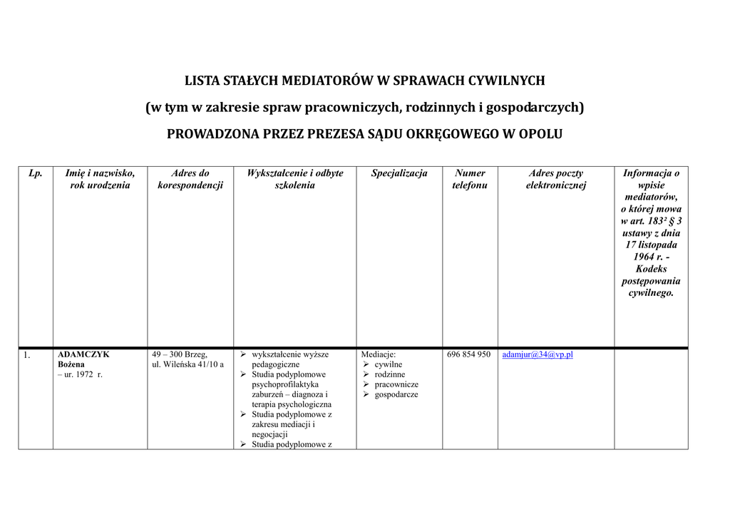 LISTA STAŁYCH MEDIATORÓW W SPRAWACH CYWILNYCH (w tym w zakresie spraw pracowniczych, rodzinnych i gospodarczych) PROWADZONA PRZEZ PREZESA SĄDU OKRĘGOWEGO W OPOLU Lp. 1. Imię i nazwisko, rok urodzenia ADAMCZYK Bożena – ur. 1972 r. Adres do korespondencji 49 – 300 Brzeg, ul. Wileńska 41/10 a Wykształcenie i odbyte szkolenia wykształcenie wyższe pedagogiczne Studia podyplomowe psychoprofilaktyka zaburzeń – diagnoza i terapia psychologiczna Studia podyplomowe z zakresu mediacji i negocjacji Studia podyplomowe z Specjalizacja Mediacje: cywilne rodzinne pracownicze gospodarcze Numer telefonu 696 854 950 Adres poczty elektronicznej adamjur@[email protected] Informacja o wpisie mediatorów, o której mowa w art. 183² § 3 ustawy z dnia 17 listopada 1964 r. Kodeks postępowania cywilnego. zakresu oligofrenopedagogiki z pedagogiką wspierającą. 2. ADASZYŃSKA Marta – ur. 1954 r. 45 – 265 Opole, ul. Grota Roweckiego 13/1103 wykształcenie średnie techniczne szkolenia w zakresie mediacji rozwiązywanie sporów zbiorowych Mediacje: cywilne rodzinne pracownicze gospodarcze 609 846 596 [email protected] 3. adw. GIBEK – WIŚNIEWSKA Aneta – ur. 1976 r. Kancelaria Mediacyjna Mediator Aneta Gibek – Wiśniewska, ul. Kościuszki 22/5, 45 – 062 Opole Uniwersytet Wrocławski, Wydział Prawa i Administracji Centrum Mediacyjne przy Naczelnej Radzie Adwokackiej w Warszawie, Zawodowe Szkolenie Mediacyjne Adwokatów; specjalizacja mediacje rodzinne Centrum Mediacyjne przy Naczelnej Radzie Adwokackiej w Warszawie, Zawodowe Szkolenie Mediacyjne Adwokatów; specjalizacja mediacje cywilne i gospodarcze Mediacje: cywilne rodzinne gospodarcze 512 113 565 [email protected] BEDNARSKA KOLBIARZ Edyta – ur. 1971 r. 48 – 300 Nysa, ul. Zjednoczenia 5/2, 48 – 300 Nysa studia wyższe na Uniwersytecie Opolskim – kierunek Politologia i nauki społeczne, specjalizacja pedagogiczna studia doktoranckie na Mediacje: cywilne rodzinne pracownicze gospodarcze 693 611 931 4. 77 436 80 24 [email protected] Mediator wpisany na listę prowadzoną przez Ministerstwo Rodziny, Pracy i Polityki Społecznej Uniwersytecie Opolskim z zakresu Historii Najnowszej Podyplomowe studia z Wydziale Prawa Uniwersytetu Opolskiego z kierunku Administracja publiczna i zarządzanie studia podyplomowe: mediacje i negocjacje: biznesowe, sądowe i pozasądowe, Szkoła Wyższa im. Bogdana Jańskiego w Opolu Podyplomowe studia na Uniwersytecie Ekonomicznym we Wrocławiu na kierunku Audyt i kontrola zarządcza w sektorze publicznym 5. CECUGA Przemysława – ur. 1971 r. 45 – 442 Opole, ul. Leśna 3 Miejsce prowadzenia Mediacji: Kancelaria Mediacyjna „Ars Vivendi” 45 – 221 Opole, ul. Chabrów 60 6. CETERA Magdalena - ur. 1976 r. Kancelaria Mediacyjna Magdalena Cetera, Al. Kasztanowa 3 A, 53 – 125 Wrocław wyższe prawnicze studia II stopnia z zakresu pedagogiki resocjalizacyjnej szkolenia z zakresu mediacji realizowane przez Krajowe Centrum Mediacji w Warszawie oraz Dolnośląskie Centrum Psychoterapii we Wrocławiu Mediacje: cywilne rodzinne gospodarcze pracownicze 601 848 408 absolwentka Uniwersytetu Wrocławskiego na Wydziale Nauk Społecznych - Politologia, specjalizacja: Europeistyka i Niemcoznawstwo, Mediacje: cywilne: o podział majątku, o dział spadku o zniesienie 606 479 867 [email protected] 882 388 222 [email protected] Polskie Stowarzyszenie Mediacji Gospodarczych Fundacja stypendium na Universität – Gesamnthochschule Siegen, Niemcy, specjalizacja: Mediacja Podyplomowe Studium Prawa Handlowego i Gospodarczego na Wydziale Prawa, Administracji i Ekonomii Uniwersytetu Wrocławskiego Wirtschaftsmediator – Akademie für Wirtschaftsmediation und Verhandlungsmanagement, mediator Time Limited Mediation (Devon & Exeter Law Society) „Mediacje Między Ofiarą i Sprawcą” – Centrum Negocjacji w Warszawie, „Mediation bei deutsch-polnischen Kindschaftskonflikten”, „Budowanie wzajemnego zrozumienia między stronami a osiąganie porozumień w mediacji” „Kurz-Zeit-Mediation”, Propagowanie alternatywnych metod rozwiązywania sporów”. współwłasności o ustanowienie drogi koniecznej o ustalenie sposobu korzystania z rzeczy wspólnej i in. gospodarcze: o zapłatę, o prawo do znaku towarowego o odszkodowanie za niewłaściwe wykonanie usługi o naruszenie warunków umowy, nie wykonanie umowy i in., prawa pracy: o przywrócenie do pracy o zapłatę o odszkodowanie tytułem umowy o pracę o zmianę relacji pracowniczych o odwołanie od wypowiedzenia umowy o pracę o wynagrodzenie i in., rodzinne: o pojednanie „EDUCO” o prawa opiekuńcze o alimenty o formę rozstania o podział majątku o formę sprawowania opieki nad dzieckiem i in.. 7. CETNAR Agnieszka – ur. 1974 r. 8. DANKOWSKA Antonina – ur. 1948 r. Miejski Ośrodek Pomocy Społecznej ul. Reja 2 A, 47 – 224 K – Koźle 45 – 056 Opole ul. Kośnego 31 b/5 studia wyższe na Uniwersytecie Opolskim – Wydział Historyczno – Pedagogiczny szkolenia z zakresu mediacji rodzinnych warsztaty w zakresie konstruowania ugód w sprawach rodzinnych, cywilnych i karnych Mediacje: cywilne rodzinne 533 161 233 [email protected] Mediacje: cywilne gospodarcze pracownicze 600 855 553 [email protected] mgr prawa aplikacja radcowska radca prawny szkolenie „Szkoła Mediacji” organizowane przez Krajowe Stowarzyszenie Mediacji i Dolnośląskie Centrum Rozwoju Lokalnego warsztaty dot. konstruowania dokumentów mediacyjnych Stowarzyszenie Dialogu i Mediacji „Bliżej 9. GÓRSKA Grażyna – ur. 1978 r. Kancelaria Mediacyjno – Prawna, Pl. Zamkowy 24 A/14, 55 – 200 Oława studia podyplomowe „Akademia mediatora” szkolenia z zakresu mediacji rodzinnych, cywilnych Mediacje: cywilne rodzinne gospodarcze pracownicze 884 989 384 [email protected] 10. GWIAZDA Katarzyna - ur. 1989 r. 45 – 267 Opole, ul. Hubala 18 A/102 Uniwersytet Opolski, Wydział Prawa i Administracji – studia magisterskie studia podyplomowe: mediacje i negocjacje: biznesowe, sądowe