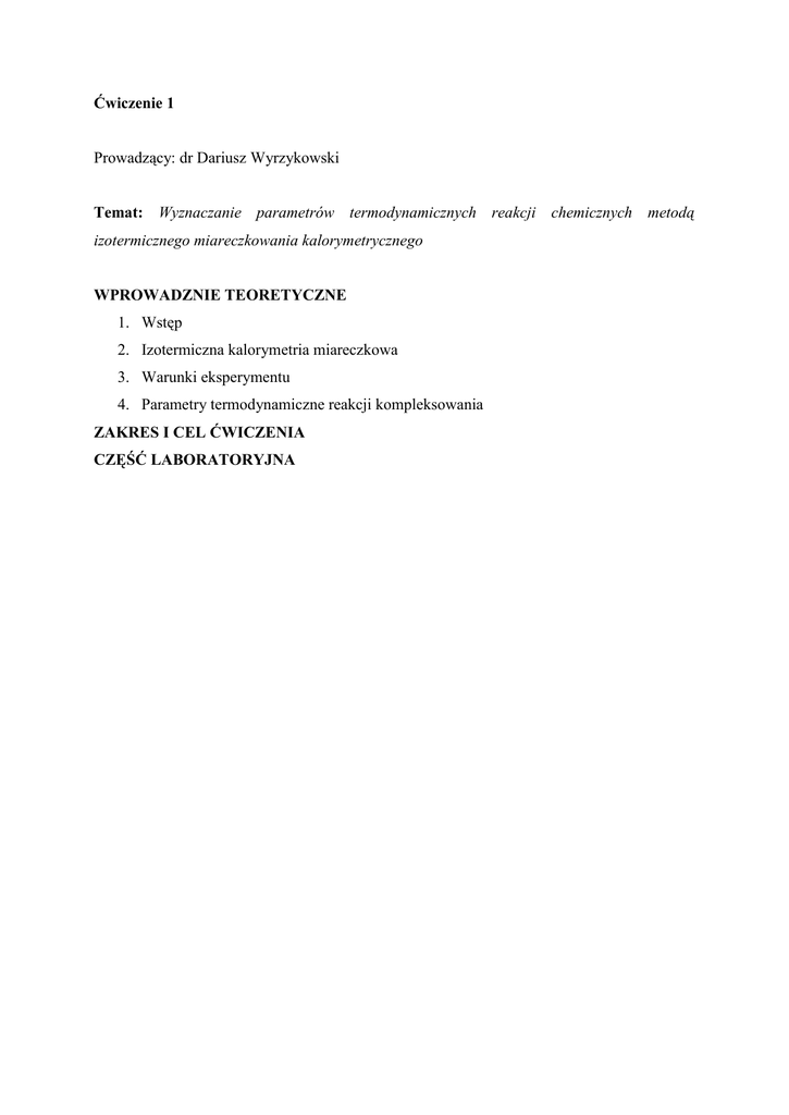 Ćwiczenie 1 Prowadzący: dr Dariusz Wyrzykowski Temat: Wyznaczanie parametrów termodynamicznych reakcji chemicznych metodą izotermicznego miareczkowania kalorymetrycznego WPROWADZNIE TEORETYCZNE 1. Wstęp 2. Izotermiczna kalorymetria miareczkowa 3. Warunki eksperymentu 4. Parametry termodynamiczne reakcji kompleksowania ZAKRES I CEL ĆWICZENIA CZĘŚĆ LABORATORYJNA Isothermal Titration Calorimetry WPROWADZNIE TEORETYCZNE 1. Wstęp Procesom fizycznym i chemicznym towarzyszą w większości przypadków efekty energetyczne, dlatego ciepło stanowi uniwersalny wskaźnik przemian. Dział, zajmujący się metodami pomiaru ilości ciepła wydzielanego lub pochłanianego podczas procesów fizycznych lub chemicznych nazywamy kalorymetrią. W kalorymetrii, wskaźnikiem zmian własności badanego układu jest ciepło, q, którego jednostką w układzie SI jest dżul, J. Wciąż jednak w literaturze chemicznej oraz w oprogramowaniu dołączanym do kalorymetrów przez producentów powszechnie używaną jednostką ciepła jest kaloria, cal.: 1 cal = 4,184 J Pomiary kalorymetryczne wykonywane są w funkcji czasu. Wynikiem pomiaru jest termogram przedstawiający zależność zmian mocy, dq/dt, do czasu, t. Jednostką mocy w układzie SI jest wat, W.: 1 W = 1 J . s-1 W praktyce, pomiary kalorymetryczne, z nielicznymi wyjątkami, prowadzone są w warunkach stałego ciśnienia (atmosferycznego), p, stąd też globalny efekt energetyczny towarzyszący badanemu procesowi jest równy różnicy entalpii ΔH układu w stanie końcowym i początkowym: ΔH = H2 – H1= qp (p = const.) W przypadku procesów zachodzących w stałej temperaturze i przy stałym ciśnieniu (kalorymetria izotermiczna), możliwość zajścia procesu samorzutnego określa wartość entalpii swobodnej Gibbsa, ΔG, zdefiniowanej równaniem: ΔG = ΔH – TΔS, gdzie ΔS oznacza zmianę entropii układu. Z równania wynika, że w warunkach izotermicznych o samorzutności danego procesu decyduje czynnik entalpowy, ΔH oraz entropowy, ΔS. ΔG < 0 – proces samorzutny ΔG = 0 – stan równowagi ΔG > 0 – proces wymuszony 2 Isothermal Titration Calorimetry 2. Izotermiczna kalorymetria miareczkowa Izotermiczna kalorymetria miareczkowa (z ang. Isothermal Titration Calorimetry, w skrócie ITC) należy do metod termoanalitycznych, w której mierzy się efekty energetyczne towarzyszące procesom zachodzącym w stałej temperaturze podczas dodawania do roztworu zawierającego substrat roztwór liganda. Kalorymetr miareczkowy składa się z dwóch identycznych celek: celki pomiarowej (ang. sample cell), w której zachodzi reakcja oraz celki odniesienia (ang. reference cell), wypełnionej wodą (rys. 1). Obie celki umieszczone są symetrycznie wewnątrz tego samego płaszcza adiabatycznego. Pomiędzy celkami znajduje się czujnik temperatury (Differential Power Sensor) rejestrujący różnicę temperatur obu celek (rys. 2). Rys. 1. Schemat układu miareczkującego – ITC Roztwór substratu znajduje się w celce pomiarowej, do której dodawany jest za pomocą strzykawki, w ustalonych odstępach czasu, roztwór liganda. Podczas pomiaru, obracająca się z zadaną prędkością igła strzykawki, z odpowiednio wyprofilowaną końcówką, zapewnia ciągłe mieszanie reagentów. Podczas wstrzykiwania roztworu liganda ciepło zostaje uwalniane lub absorbowane, w zależności od rodzaju oddziaływania, w ilości proporcjonalnej do liczby moli związanego liganda. Celka odniesienia utrzymywana jest podczas eksperymentu w stałej temperaturze. W przypadku reakcji endotermicznej temperatura celki pomiarowej jest niższa od temperatury celki odniesienia. Sygnał o powstaniu różnicy temperatur przechodzi do układu sterującego 3 Isothermal Titration Calorimetry dodatkowym elementem grzejnym, który doprowadza do celki pomiarowej tyle energii, ile potrzeba do skompensowania różnicy temperatur (rys. 2). W procesie egzotermicznym, temperatura celki pomiarowej jest wyższa od temperatury celki odniesienia, a dodatkowy element grzejny musi skompensować powstałą różnicę, aby temperatury obu naczyń były w czasie pomiaru jednakowe. Ciepło odprowadzona lub doprowadzona do celki reakcyjnej (w zależności od typu przemiany) odpowiada entalpii przemiany, ΔH. Rys. 2. Pomiar różnicy temperatur pomiędzy celką reakcyjną a odniesienia Dane miareczkowania kalorymetrycznego przedstawiane są na termogramie zależności mocy [μcal s-1] od czasu [min], t = f(dH/dt). Wykres przedstawia serię pików, które odpowiadają kolejnym krokom miareczkowania (rys. 3). Kalorymetr połączony jest z komputerem, którego oprogramowanie umożliwia obliczanie (metodą całkową) pola piku, a tym samym wyznaczenie entalpii ΔH. Powierzchnia piku jest proporcjonalna do efektu cieplnego przemiany. Wraz z dodatkiem kolejnych porcji titranta wielkość pików maleje z uwagi na malejącą ilość reagentów biorących udział w reakcji. Miareczkowanie prowadzi się do momentu, w którym wszystkie potencjalne miejsca substratu zdolne do wiązania liganda zostaną wysycone, a na termogramie rejestrowane są jedynie efekty cieplne związane z rozcieńczaniem dodawanego roztworu liganda. 4 Isothermal Titration Calorimetry 9,8 9,6 µcal/sec 9,4 9,2 9,0 8,8 endo 8,6 exo 8,4 0,00 16,67 33,33 50,00 66,67 83,33 100,00 Time (min) Rys. 3. Termogram w metodzie ITC Przedstawiając na wykresie wartości entalpii [kcal mol-1 liganda] odpowiadających kolejnym krokom miareczkowania w funkcji stosunku molowego liganda do substratu [ligand]/[substrat] otrzymujemy krzywą miareczkowania kalorymetrycznego w metodzie ITC, tzw. izotermę wiązania (rys. 4). Rys. 4. Krzywa miareczkowania kalorymetrycznego w metodzie ITC – izoterma wiązania 5 Isothermal Titration Calorimetry Cały eksperyment sterowany jest przez komputer. Użytkownik wprowadza parametry eksperymentalne tj.: - temperatura [oC] – zakres: od 2 oC do 70oC - liczba kroków miareczkowania - objętość dodawanego titranta [μl] 