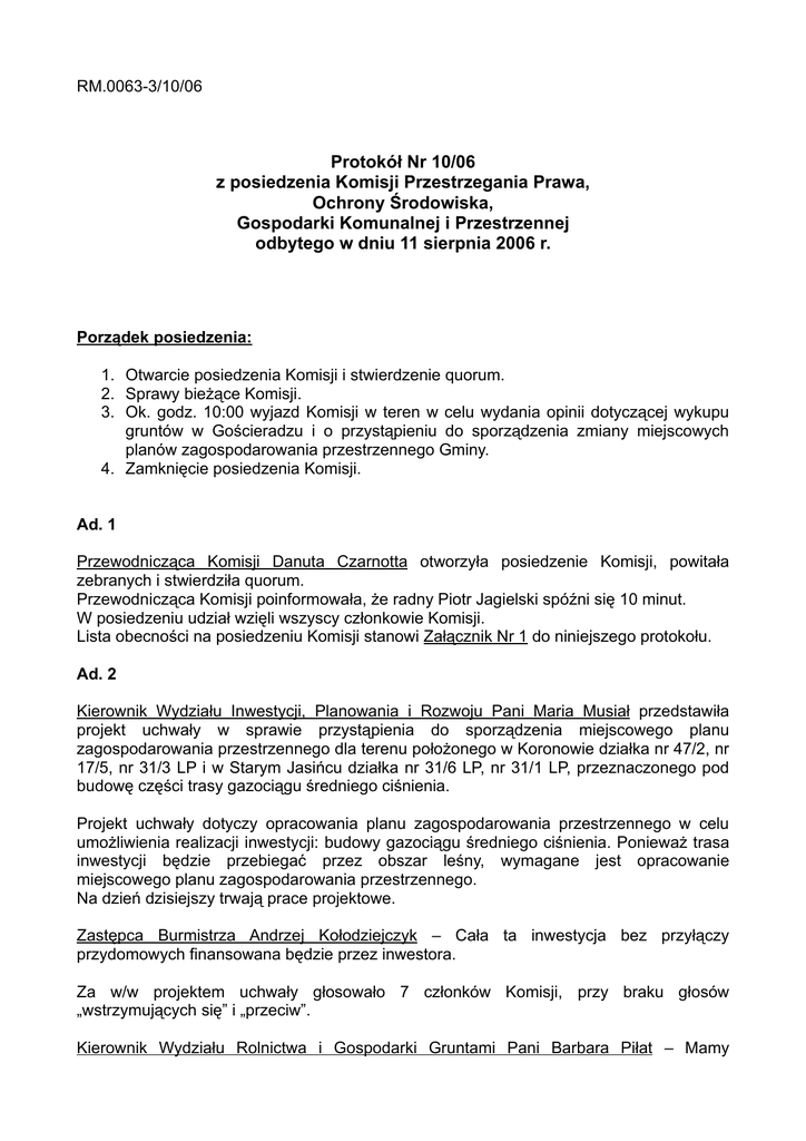 RM.0063-3/10/06 Protokół Nr 10/06 z posiedzenia Komisji Przestrzegania Prawa, Ochrony Środowiska, Gospodarki Komunalnej i Przestrzennej odbytego w dniu 11 sierpnia 2006 r. Porządek posiedzenia: 1. Otwarcie posiedzenia Komisji i stwierdzenie quorum. 2. Sprawy bieżące Komisji. 3. Ok. godz. 10:00 wyjazd Komisji w teren w celu wydania opinii dotyczącej wykupu gruntów w Gościeradzu i o przystąpieniu do sporządzenia zmiany miejscowych planów zagospodarowania przestrzennego Gminy. 4. Zamknięcie posiedzenia Komisji. Ad. 1 Przewodnicząca Komisji Danuta Czarnotta otworzyła posiedzenie Komisji, powitała zebranych i stwierdziła quorum. Przewodnicząca Komisji poinformowała, że radny Piotr Jagielski spóźni się 10 minut. W posiedzeniu udział wzięli wszyscy członkowie Komisji. Lista obecności na posiedzeniu Komisji stanowi Załącznik Nr 1 do niniejszego protokołu. Ad. 2 Kierownik Wydziału Inwestycji, Planowania i Rozwoju Pani Maria Musiał przedstawiła projekt uchwały w sprawie przystąpienia do sporządzenia miejscowego planu zagospodarowania przestrzennego dla terenu położonego w Koronowie działka nr 47/2, nr 17/5, nr 31/3 LP i w Starym Jasińcu działka nr 31/6 LP, nr 31/1 LP, przeznaczonego pod budowę części trasy gazociągu średniego ciśnienia. Projekt uchwały dotyczy opracowania planu zagospodarowania przestrzennego w celu umożliwienia realizacji inwestycji: budowy gazociągu średniego ciśnienia. Ponieważ trasa inwestycji będzie przebiegać przez obszar leśny, wymagane jest opracowanie miejscowego planu zagospodarowania przestrzennego. Na dzień dzisiejszy trwają prace projektowe. Zastępca Burmistrza Andrzej Kołodziejczyk – Cała ta inwestycja bez przyłączy przydomowych finansowana będzie przez inwestora. Za w/w projektem uchwały głosowało 7 członków Komisji, przy braku głosów „wstrzymujących się” i „przeciw”. Kierownik Wydziału Rolnictwa i Gospodarki Gruntami Pani Barbara Piłat – Mamy przygotowany projekt uchwały w sprawie wykupu przez Gminę Koronowo gruntów w Gościeradzu. Projekt tej uchwały został zdjęty z porządku obrad ostatniej sesji. Dzisiaj mamy pojechać w teren, aby zobaczyć na miejscu jak sytuacja się tam przedstawia. Drugi projekt dotyczy przekazania w formie darowizny gruntu na terenie miasta Koronowo na rzecz Domu Pomocy Społecznej. Trzeci projekt dotyczy nieodpłatnego przekazania gruntów na terenie Miasta i Gminy Koronowo w m. Koronowie i Okolu. Burmistrz Koronowa Zygmunt Michalak – Jadąc do Gościeradza, chciałbym aby w tej części wzięła udział Pani radna Maria Kulczyk. Koszty wykupu gruntów od właściciela gruntów to kwota ok. 28.000 zł. Proszę rozważyć, czy nie lepiej byłoby te środki przeznaczyć na utwardzenie drogi gminnej. Proszę o opinię Komisji w tej sprawie. Pani Barbara Piłat – W miesiącu czerwcu tego roku byłam wraz z Komisją w Pieczyskach w Ośrodku Szkoleniowo-Wypoczynkowym Komendy Wojewódzkiej Policji w Bydgoszczy w celu zlustrowania ośrodka i wydania opinii o celowości przejęcia tego ośrodka. 30 czerwca dostaliśmy pismo z Komendy Wojewódzkiej Policji w Bydgoszczy o treści: „Uprzejmie informuję Pana Burmistrza, że Komenda Główna Policji odstąpiła od utworzenia w Pieczyskach bazy szkoleniowej Policji w Ośrodku Szkoleniowo – Wypoczynkowym Komendy Wojewódzkiej Policji w Bydgoszczy. W związku z powyższym wygaszenie trwałego zarządu KWP w stosunku do przedmiotowej nieruchomości jest nadal aktualne. Komenda Wojewódzka Policji w Bydgoszczy podtrzymuje wcześniejsze propozycje przekazania nieruchomości Gminie Miasta Koronowo.” oraz projekt porozumienia przygotowany przez Komendę Wojewódzką Policji w Bydgoszczy. Tu Pani Barbara Piłat odczytała zebranym treść porozumienia przygotowanego przez stronę przekazującą Ośrodek tj. Komendę Wojewódzką Policji w Bydgoszczy Kserokopia pisma Komendy Wojewódzkiej Policji w Bydgoszczy i porozumienie załączono do niniejszego protokołu jako Załącznik Nr 2. Burmistrz Koronowa Zygmunt Michalak – Zagrożenie jest takie: oni nie chcą nawet o tym słyszeć, żeby Gmina coś z tego miała. Mamy zająć się sprzedażą. Do czasu sprzedaży musimy to utrzymać. Ja takiego porozumienia nie podpiszę. Zanim cokolwiek uczynię w tym zakresie, muszę mieć opinię Rady. Przewodnicząca Komisji Danuta Czarnotta – Jak mamy godzić się na taki układ, z którego nie mamy żadnych korzyści? Burmistrz Koronowa Zygmunt Michalak – Rada mogłaby mi postawić zarzut, że podpisując takie porozumienie działam na niekorzyść Gminy. Przewodnicząca Komisji Danuta Czarnotta – Kto jest za przejęciem tego ośrodka na warunkach, które zaproponowane są w treści porozumienia? Przeciwko głosowało 7 członków Komisji, przy braku głosów „za” i „wstrzymujących się”. Na posiedzenie Komisji przybył radny Piotr Jagielski. Przewodnicząca Komisji Danuta Czarnotta – Elewator sprzedał część gruntu w Koronowie przy ul. Przemysłowej 7. Jest tam prowadzona działalność gospodarcza odzysku odpadów. Występują tam pewne nieprawidłowości. Ludzie skarżą się, że jest tam bałagan i że „śmierdzi”. Prawdopodobnie już w tej sprawie odbyło sie spotkanie z właścicielem. Co ustalono? Burmistrz Koronowa Zygmunt Michalak – W spotkaniu tym uczestniczyli moi zastępcy Pan Andrzej Kołodziejczyk i Pan Sławomir Marszelski. Nie dopuścimy do tego, aby ta firma funkcjonowała tam bez odpowiednich zezwoleń. Zastępca Burmistrza Sławomir Marszelski – Zbieranie odpadów z plastiku, tu zezwolenia wydaje Starostwo Powiatowe po uzyskaniu opinii Gminy. Tu na ul. Przemysłowej jest taka sytuacja, że jedna spółka wykupiła grunty i wydzierżawiła je drugiej spółce, która zaczęła gromadzić odpady plastikowe i metalowe. Starostwo zwróciło się do nas po opinię. Gmina wyda opinię negatywną, bo żeby taką działalność prowadzić najpierw musi być wydana decyzja o uwarun