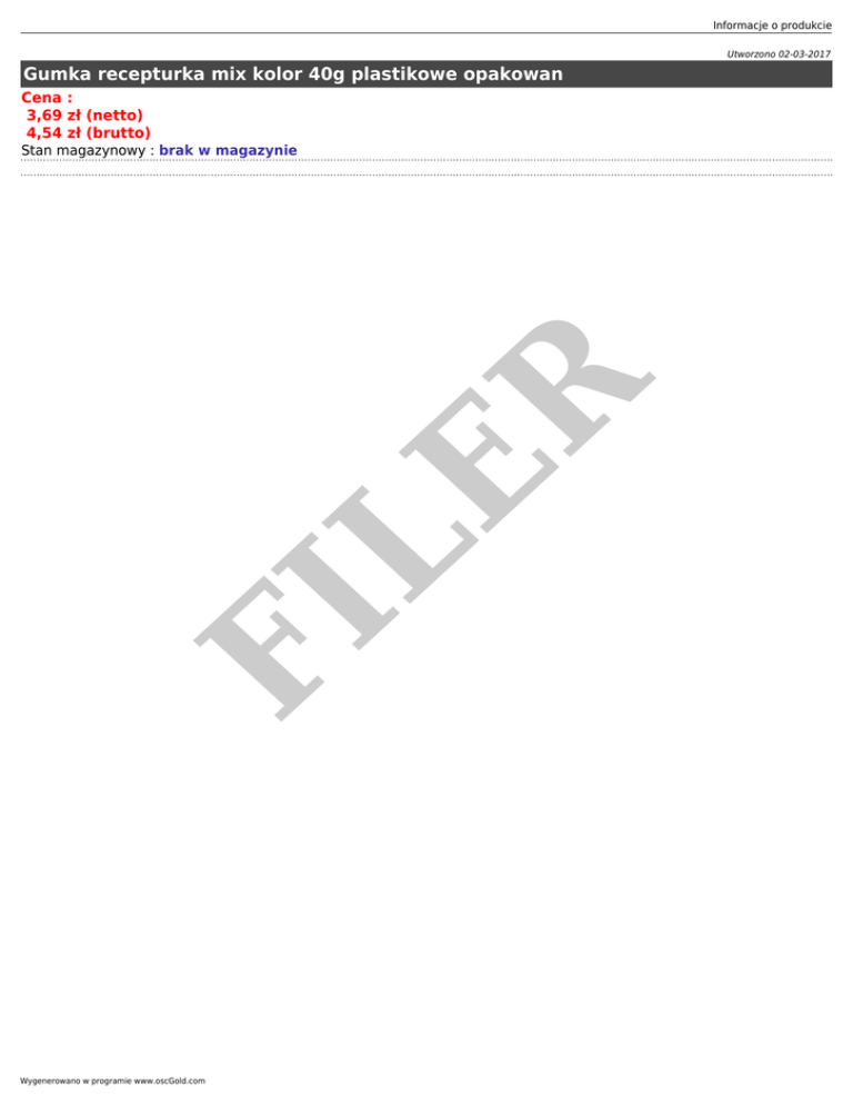 Informacje o produkcie Utworzono 02-03-2017 Gumka recepturka mix kolor 40g plastikowe opakowan Cena : 3,69 zł (netto) 4,54 zł (brutto) FI LE R Stan magazynowy : brak w magazynie Wygenerowano w programie www.oscGold.com
