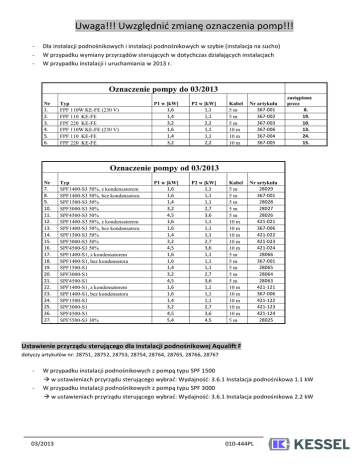 Uwaga!!! Uwzględnić zmianę oznaczenia pomp!!! -‐ -‐ -‐ Dla instalacji podnośnikowych i instalacji p odnośnikowych w szybie ( instalacja na sucho) W przypadku wymiany przyrządów s terujących w dotychczas działających instalacjach W przypadku instalacji i uruchamiania w 2013 r. Oznaczenie pompy do 03/2013 Nr 1. 2. 3. 4. 5. 6. Typ FPF 110W KE-FE (230 V) FPF 110 KE-FE FPF 220 KE-FE FPF 110W KE-FE (230 V) FPF 110 KE-FE FPF 220 KE-FE P1 w [kW] 1,6 1,4 3,2 1,6 1,4 3,2 P2 w [kW] 1,1 1,1 2,2 1,1 1,1 2,2 Kabel Nr artykułu 367-‐001 5 m 367-‐002 5 m 367-‐003 5 m 367-‐006 10 m 367-‐004 10 m 367-‐005 10 m zastąpiona przez 8. 19. 10. 13. 24. 15. Oznaczenie pompy od 03/2013 Nr 7. 8. 9. 10. 11. 12. 13. 14. 15. 16. 17. 18. 19. 20. 21. 22. 23. 24. 25. 26. 27. Typ SPF1400-S3 50%, z kondensatorem SPF1400-S3 50%, bez kondensatora SPF1500-S3 50% SPF3000-S3 50% SPF4500-S3 50% SPF1400-S3 50%, z kondensatorem SPF1400-S3 50%, bez kondensatora SPF1500-S3 50% SPF3000-S3 50% SPF4500-S3 50% SPF1400-S1, z kondensatorem SPF1400-S1, bez kondensatora SPF1500-S1 SPF3000-S1 SPF4500-S1 SPF1400-S1, z kondensatorem SPF1400-S1, bez kondensatora SPF1500-S1 SPF3000-S1 SPF4500-S1 SPF5500-S3 30% P1 w [kW] 1,6 1,6 1,4 3,2 4,5 1,6 1,6 1,4 3,2 4,5 1,6 1,6 1,4 3,2 4,5 1,6 1,6 1,4 3,2 4,5 5,4 P2 w [kW] 1,1 1,1 1,1 2,7 3,6 1,1 1,1 1,1 2,7 3,6 1,1 1,1 1,1 2,7 3,6 1,1 1,1 1,1 2,7 3,6 4,5 Kabel Nr artykułu 28029 5 m 367-‐001 5 m 28028 5 m 28027 5 m 28026 5 m 421-‐021 10 m 367-‐006 10 m 421-‐022 10 m 421-‐023 10 m 421-‐024 10 m 28066 5 m 367-‐001 5 m 28065 5 m 28064 5 m 28063 5 m 421-‐121 10 m 367-‐006 10 m 421-‐122 10 m 421-‐123 10 m 421-‐124 10 m 28025 5 m Ustawienie przyrządu sterującego dla instalacji podnośnikowej Aqualift F dotyczy artykułów nr: 28751, 28752, 28753, 28754, 28764, 28765, 28766, 28767 -‐ -‐ W przypadku instalacji podnośnikowych z pompą typu SPF 1500 w ustawieniach przyrządu sterującego wybrać: Wydajność: 3.6.1 Instalacja podnośnikowa 1.1 kW W przypadku instalacji podnośnikowych z pompą typu SPF 3000 w ustawieniach przyrządu sterującego wybrać: Wydajność: 3.6.1 Instalacja podnośnikowa 2.2 kW 03/2013 010-‐444PL Ustawienia przyrządu sterującego dla instalacji podnośnikowej Aqualift F XL dotyczy artykułów nr: 11000-‐11128 -‐ -‐ 03/2013 W ustawieniach przyrządu s terującego wybrać pasującą instalację: Wydajność 3.6.1 Jeśli nie jest dostępna, w przyrządzie sterującym d la parametru wydajności należy wybrać 3.6.1 Instalację specjalną odpowiednią dla maksymalnego dostępnego prądu maks. prąd < 4,0 A w przypadku p ompy S PF 1500 maks. prąd < 6,3 A w przypadku p ompy S PF 3000 maks. prąd < 10,0 A w przypadku pompy SPF 4500 lub SPF 5500 i ustawić odpowiednie parametry, pobrane z poniższej tabeli. 010-‐444PL