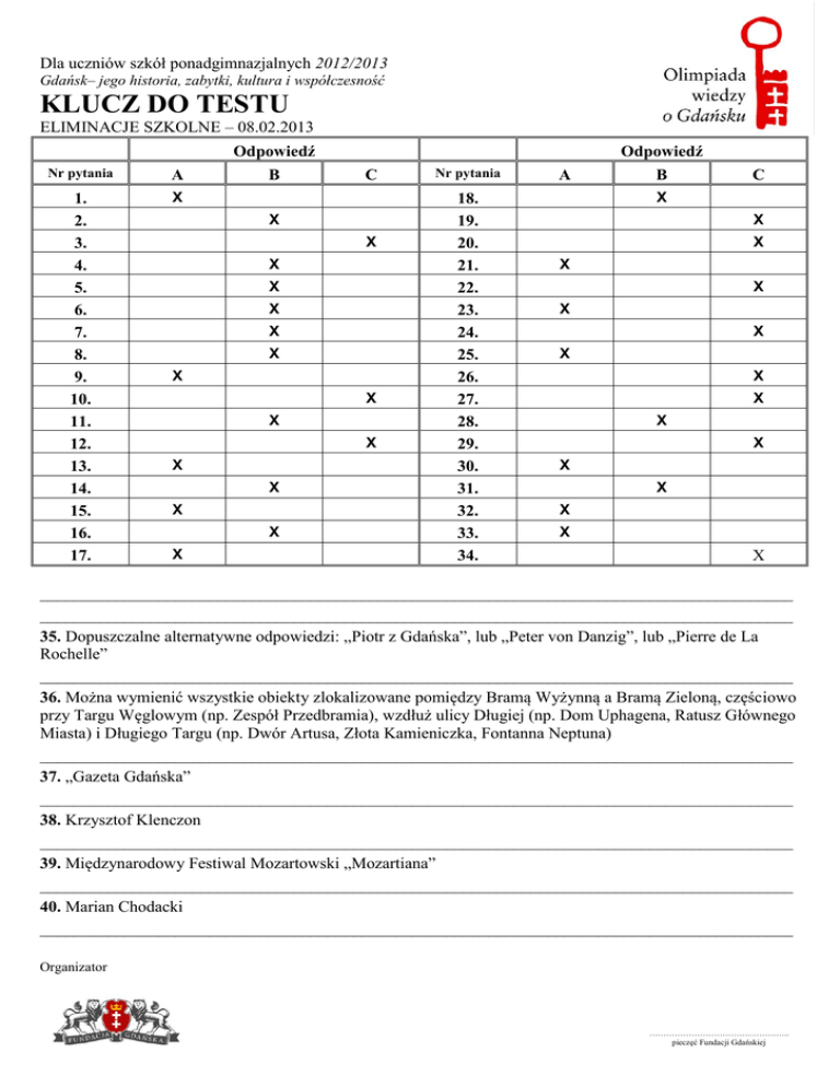 Dla uczniów szkół ponadgimnazjalnych 2012/2013 Gdańsk– jego historia, zabytki, kultura i współczesność KLUCZ DO TESTU ELIMINACJE SZKOLNE – 08.02.2013 Odpowiedź Nr pytania A 1. 2. 3. 4. 5. 6. 7. 8. 9. 10. 11. 12. 13. 14. 15. 16. 17. X B Odpowiedź C X X X X X X X X X X X X X X X X Nr pytania 18. 19. 20. 21. 22. 23. 24. 25. 26. 27. 28. 29. 30. 31. 32. 33. 34. A B C X X X X X X X X X X X X X X X X X _________________________________________________________________________________________ _________________________________________________________________________________________ 35. Dopuszczalne alternatywne odpowiedzi: „Piotr z Gdańska”, lub „Peter von Danzig”, lub „Pierre de La Rochelle” _________________________________________________________________________________________ 36. Można wymienić wszystkie obiekty zlokalizowane pomiędzy Bramą Wyżynną a Bramą Zieloną, częściowo przy Targu Węglowym (np. Zespół Przedbramia), wzdłuż ulicy Długiej (np. Dom Uphagena, Ratusz Głównego Miasta) i Długiego Targu (np. Dwór Artusa, Złota Kamieniczka, Fontanna Neptuna) _________________________________________________________________________________________ 37. „Gazeta Gdańska” _________________________________________________________________________________________ 38. Krzysztof Klenczon _________________________________________________________________________________________ 39. Międzynarodowy Festiwal Mozartowski „Mozartiana” _________________________________________________________________________________________ 40. Marian Chodacki _________________________________________________________________________________________ Organizator ………………………………………….. pieczęć Fundacji Gdańskiej