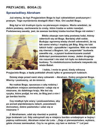 PRZYJACIEL BOGA (3) Sprawiedliwy Abraham Już wiemy, że być Przyjacielem Boga to być człowiekiem posłusznym i prawym. Tego wyróżnienia dostąpili Abel i Noe. Oni zaufali Bogu. Bóg był w ich trudnym życiu na pierwszym miejscu. Warto wiedzieć, że dobre postawy, zachowania to cnoty, które trzeba w sobie rozwijać. Podstawową zasadą jest, że zawsze bardziej trzeba kochać Boga niż siebie ! Biblia ukazuje nam taką postawę ludzi, którzy odwrócili się od Boga. Bardziej ufali sobie. Budując ogromną wieżę chcieli udowodnić, że są tak samo wielcy i mądrzy jak Bóg. Bóg nie lubi takich ludzi - pyszałków i egoistów. Nikt nie może się równać z Bogiem. Ich „wspaniała” budowla zawaliła się , a pyszni budowniczowie zostali dotknięci pomieszaniem mowy. Jeden drugiego nie rozumiał i nie stać ich było na dokończenie budowy. Ta niedokończona budowla nazywała się wieża Babel. I tobie, i mnie to grozi, kiedy odrzucę Przyjaciela Boga, a będę pokładał ufność tylko w grzesznych ludziach. Dzisiaj staje przed nami stary człowiek – Abraham. Dobry przyjaciel Boga. Wierny i posłuszny, aż do śmierci. Na rozkaz Boga, opuszcza z całą rodziną i dobytkiem miejsce zamieszkania i udaje się w nieznane, do dalekiego kraju. Nie boi się ryzyka, które podjął, bo wie, że Bóg jest z nim i go bardzo kocha. Czy miałbyś tyle wiary i posłuszeństwa, aby po ponad pięćdziesięciu latach, pozostawić domostwo, dobre pastwiska i udać się w nieznane ? Z Abrahamem, udał się również w podróż jego bratanek Lot. Gdy zatrzymali się w miejscu bardzo urodzajnym w bujną i piękną roślinność, Abraham mówi do Lota : „Daję ci pierwszeństwo, wybierz, gdzie chcesz zamieszkać. Czy tu na górze, czy tam w dolinie ?” Lot jest bardzo rozsądny, ale i łakomy. Chce dla siebie to, co najlepsze. Wybiera dolinę, gdzie trawy są lepsze i jest ich więcej. Abraham pozostał na górze, gdzie trawa jest marna i jest jej mało. Chociaż był starszy, to wybrał miejsce gorsze. Bóg widział szczodrość i sprawiedliwość Abrahama, i dlatego sprawił, że góra stała się rajem o dużej i pięknej trawie. Dlaczego Abrahama możemy wpisać w poczet Przyjaciół Boga ? On nie tylko kochał Boga, ufał Mu, był Mu posłuszny, ale był też człowiekiem sprawiedliwym. Co to znaczy, być sprawiedliwym ? Przyjaciel Boga to ten, kto stara się być dobrym, lepszym, doskonalszym. Dobrym, lepszym, doskonalszym czynią nas cnoty (sprawności), gdy je rozwijamy np. roztropność, męstwo, posłuszeństwo. Po czym poznajemy, że ktoś jest sprawiedliwy ? Gdy słowem i czynem szanuje prawa innych ludzi. Ma na uwadze ich potrzeby, np. dostrzega, że ktoś ma prawo do szacunku, a jest przez innych wyśmiewany czy poniżany. Tam, gdzie jest miłość, tam jest i sprawiedliwość. Zauważyłeś, że w codziennym życiu człowiek musi kierować się prawem np. przykazania Boże, prawo Kościelne, kodeks ucznia ... Po co jest to prawo ? Zakazy, nakazy, przywileje, obowiązki, nagrody są po to, aby człowiek mógł cieszyć się należnym mu dobrem np. mam prawo do wypoczynku, mam prawo do zaspokojenia głodu, mam prawo do sprawiedliwej oceny ... Abraham miał prawo do lepszych warunków życia, ale zrezygnował na rzecz Lota – kierował się bezinteresowną miłością ! Dobry Bóg, w sercu każdego człowieka pozostawił podstawową zasadę : czyń dobro, a zła unikaj !