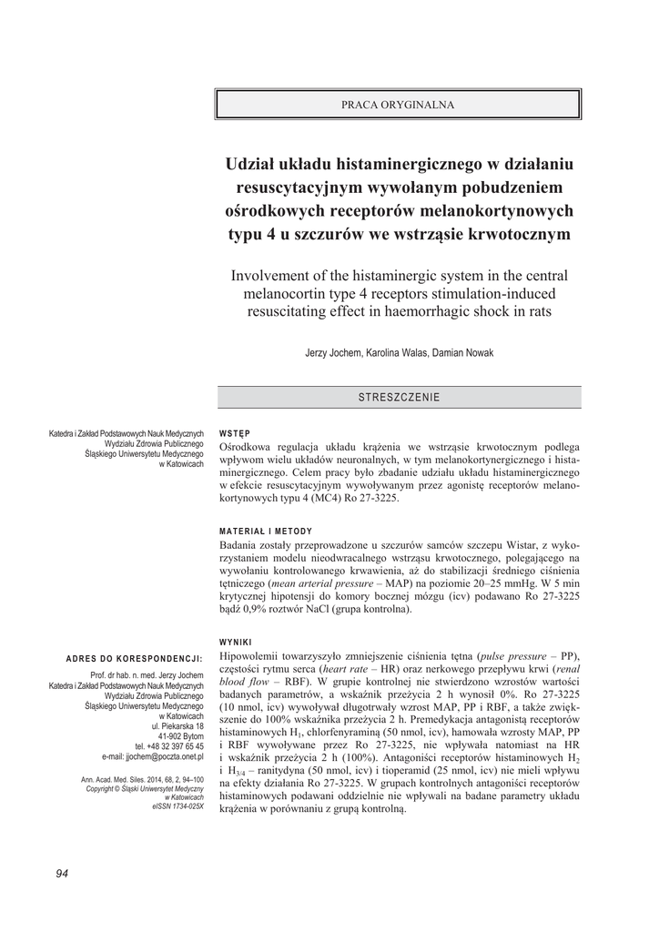 PRACA ORYGINALNA Udział układu histaminergicznego w działaniu resuscytacyjnym wywołanym pobudzeniem ośrodkowych receptorów melanokortynowych typu 4 u szczurów we wstrząsie krwotocznym Involvement of the histaminergic system in the central melanocortin type 4 receptors stimulation-induced resuscitating effect in haemorrhagic shock in rats Jerzy Jochem, Karolina Walas, Damian Nowak ST R ES Z C Z E NI E Katedra i Zakład Podstawowych Nauk Medycznych Wydziału Zdrowia Publicznego Śląskiego Uniwersytetu Medycznego w Katowicach WSTĘP Ośrodkowa regulacja układu krążenia we wstrząsie krwotocznym podlega wpływom wielu układów neuronalnych, w tym melanokortynergicznego i histaminergicznego. Celem pracy było zbadanie udziału układu histaminergicznego w efekcie resuscytacyjnym wywoływanym przez agonistę receptorów melanokortynowych typu 4 (MC4) Ro 27-3225. MATERIAŁ I METODY Badania zostały przeprowadzone u szczurów samców szczepu Wistar, z wykorzystaniem modelu nieodwracalnego wstrząsu krwotocznego, polegającego na wywołaniu kontrolowanego krwawienia, aż do stabilizacji średniego ciśnienia tętniczego (mean arterial pressure – MAP) na poziomie 20–25 mmHg. W 5 min krytycznej hipotensji do komory bocznej mózgu (icv) podawano Ro 27-3225 bądź 0,9% roztwór NaCl (grupa kontrolna). WYNIKI ADRES DO KORESPONDENCJI: Prof. dr hab. n. med. Jerzy Jochem Katedra i Zakład Podstawowych Nauk Medycznych Wydziału Zdrowia Publicznego Śląskiego Uniwersytetu Medycznego w Katowicach ul. Piekarska 18 41-902 Bytom tel. +48 32 397 65 45 e-mail: [email protected] Ann. Acad. Med. Siles. 2014, 68, 2, 94–100 Copyright © Śląski Uniwersytet Medyczny w Katowicach eISSN 1734-025X 94 Hipowolemii towarzyszyło zmniejszenie ciśnienia tętna (pulse pressure – PP), częstości rytmu serca (heart rate – HR) oraz nerkowego przepływu krwi (renal blood flow – RBF). W grupie kontrolnej nie stwierdzono wzrostów wartości badanych parametrów, a wskaźnik przeżycia 2 h wynosił 0%. Ro 27-3225 (10 nmol, icv) wywoływał długotrwały wzrost MAP, PP i RBF, a także zwiększenie do 100% wskaźnika przeżycia 2 h. Premedykacja antagonistą receptorów histaminowych H1, chlorfenyraminą (50 nmol, icv), hamowała wzrosty MAP, PP i RBF wywoływane przez Ro 27-3225, nie wpływała natomiast na HR i wskaźnik przeżycia 2 h (100%). Antagoniści receptorów histaminowych H 2 i H3/4 – ranitydyna (50 nmol, icv) i tioperamid (25 nmol, icv) nie mieli wpływu na efekty działania Ro 27-3225. W grupach kontrolnych antagoniści receptorów histaminowych podawani oddzielnie nie wpływali na badane parametry układu krążenia w porównaniu z grupą kontrolną. HISTAMINA I PEPTYDY MELANOKORTYNOWE WE WSTRZĄSIE WNIOSKI Układ histaminergiczny uczestniczy w działaniu resuscytacyjnym wynikającym z pobudzenia ośrodkowych receptorów MC4 u szczurów we wstrząsie krwotocznym, co związane jest z aktywacją receptorów histaminowych H1. SŁOWA KLUC ZOWE histamina, receptor MC4, szczury, krwotok A B ST R A CT INTRODUCTION Central cardiovascular regulation in haemorrhagic shock is influenced by many neuronal systems, including the melanocortinergic and histaminergic systems. The aim of the study was to examine the involvement of the histaminergic system in the resuscitating effect of melanocortin type 4 (MC4) receptor agonist Ro 27-3225. MATERIALS AND METHODS Studies were carried out on male Wistar rats subjected to irreversible haemorrhagic shock with a mean arterial pressure (MAP) of 20–25 mmHg. In the 5th minute of critical hypotension, the animals were injected intracerebroventricularly (icv) with Ro 27-3225 or a 0.9% NaCl solution (control group). RESULTS Hypovolaemia was accompanied by a decrease in pulse pressure (PP), heart rate (HR) and renal blood flow (RBF). In the control group, there were no increases in the measured parameters, and a survival rate of 2 h was 0%. Ro 27-3225 (10 nmol, icv) evoked long-lasting rises in MAP, PP and RBF as well as 100% survival at 2 h. Pre-treatment with histamine H1 receptor antagonist chlorpheniramine (50 nmol, icv) inhibited Ro 27-3225-induced increases in MAP, PP and RBF, with no influence on HR and survival at 2 h (100%). In contrast, the antagonists of H2 and H3/4 receptors – ranitidine (50 nmol, icv) and thioperamide (25 nmol, icv), respectively, had no influence on the Ro 27-3225 action. In the control groups, histamine receptor antagonists given alone did not affect the measured parameters in comparison to the saline-treated group. CONCLUSIONS The histaminergic system participates in the resuscitating effect induced by the activation of central MC4 receptors in haemorrhagic shock in rats, and histamine H1 receptors are involved. KEY WORDS histamine, MC4 receptor, rats, haemorrhage W ST Ę P Wraz z utratą krwi dochodzi do uruchomienia nerwowych i humoralnych mechanizmów kompensacyjnych układu krążenia, na podstawie czego wyróżniono dwie fazy regulacji we wstrząsie krwotocznym, tj. fazę pobudzenia, a następnie hamowania aktywności układu współczulnego [1]. Pierwszą zapoczątkowuje odbarczenie baroreceptorów tętniczych, prowadzące do odruchowego zwiększenia aktywności w układzie współczulnym. W drugiej – na skutek uwypuklenia się ścian lewej komory serca w kierunku jej światła, przy zbyt małym wypełnieniu komory krwią – dochodzi do paradoksalnego pobudzenia zlokalizowanych tam mechanoreceptorów, a także odbarczenia receptorów w niskociśnieniowej części układu krążenia, co łącznie wywołuje odruchowy wzrost aktywności w układzie przywspółczulnym i hamowanie układu współczulnego, z wyjątkiem części unerwiającej rdzeń nadnerczy [1]. Ośrodkowa regulacja układu krążenia we wstrząsie krwotocznym podlega wpływom wielu układów neuronalnych, które pod względem czynnościowym można podzielić na dwie grupy – opioidowe i nieopioidowe [2,3]. Neuromodulatory pierwszej grupy hamują 95 ANNALES ACAD