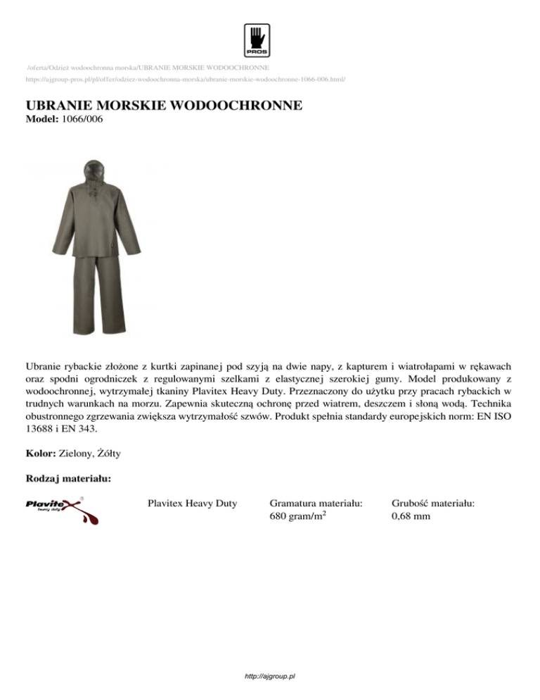 /oferta/Odzież wodoochronna morska/UBRANIE MORSKIE WODOOCHRONNE https://ajgroup-pros.pl/pl/offer/odziez-wodoochronna-morska/ubranie-morskie-wodoochronne-1066-006.html/ UBRANIE MORSKIE WODOOCHRONNE Model: 1066/006 Ubranie rybackie złożone z kurtki zapinanej pod szyją na dwie napy, z kapturem i wiatrołapami w rękawach oraz spodni ogrodniczek z regulowanymi szelkami z elastycznej szerokiej gumy. Model produkowany z wodoochronnej, wytrzymałej tkaniny Plavitex Heavy Duty. Przeznaczony do użytku przy pracach rybackich w trudnych warunkach na morzu. Zapewnia skuteczną ochronę przed wiatrem, deszczem i słoną wodą. Technika obustronnego zgrzewania zwiększa wytrzymałość szwów. Produkt spełnia standardy europejskich norm: EN ISO 13688 i EN 343. Kolor: Zielony, Żółty Rodzaj materiału: Plavitex Heavy Duty Gramatura materiału: 680 gram/m² http://ajgroup.pl Grubość materiału: 0,68 mm Rozmiar: 48, 50, 52, 54, 56, 58, 60, 62 Tabela rozmiarów: S Rozmiar 48 Wzrost 164 Obwód 96-100 klat. piersiowej Obwód w 80-84 pasie M 50 170 100-104 L 52 176 104-108 L 54 176 108-112 XL 56 182 112-116 XXL 58 188 116-120 XXXL 60 194 120-124 XXXXL 62 198 124-128 80-84 84-88 84-88 88-92 92-96 96-100 96-100 Normy: Cechy specyficzne: EN ISO 13688 Odzież ochronna wymagania ogólne. EN 343 Odzież ochronna. Ochrona przed deszczem. -50ºC Produkt odporny na zginanie przy dużych ujemnych temperaturach. Obustronne zgrzewanie Kaptur Kieszeń wewnętrzna Kieszeń wewnętrzna zapinana na zamek Napy Wiatrołapy w rękawach Elastyczne szelki wymienne http://ajgroup.pl Powered by TCPDF (www.tcpdf.org)