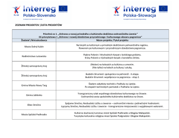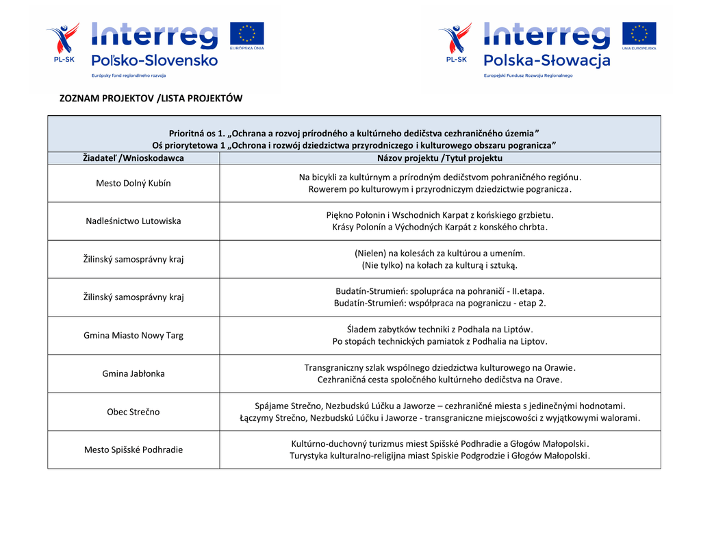 ZOZNAM PROJEKTOV /LISTA PROJEKTÓW Prioritná os 1. „Ochrana a rozvoj prírodného a kultúrneho dedičstva cezhraničného územia ” Oś priorytetowa 1 „Ochrona i rozwój dziedzictwa przyrodniczego i kulturowego obszaru pogranicza” Žiadateľ /Wnioskodawca Názov projektu /Tytuł projektu Mesto Dolný Kubín Na bicykli za kultúrnym a prírodným dedičstvom pohraničného regiónu. Rowerem po kulturowym i przyrodniczym dziedzictwie pogranicza. Nadleśnictwo Lutowiska Piękno Połonin i Wschodnich Karpat z końskiego grzbietu. Krásy Polonín a Východných Karpát z konského chrbta. Žilinský samosprávny kraj (Nielen) na kolesách za kultúrou a umením. (Nie tylko) na kołach za kulturą i sztuką. Žilinský samosprávny kraj Budatín-Strumień: spolupráca na pohraničí - II.etapa. Budatín-Strumień: współpraca na pograniczu - etap 2. Gmina Miasto Nowy Targ Śladem zabytków techniki z Podhala na Liptów. Po stopách technických pamiatok z Podhalia na Liptov. Gmina Jabłonka Transgraniczny szlak wspólnego dziedzictwa kulturowego na Orawie. Cezhraničná cesta spoločného kultúrneho dedičstva na Orave. Obec Strečno Spájame Strečno, Nezbudskú Lúčku a Jaworze – cezhraničné miesta s jedinečnými hodnotami. Łączymy Strečno, Nezbudskú Lúčku i Jaworze - transgraniczne miejscowości z wyjątkowymi walorami. Mesto Spišské Podhradie Kultúrno-duchovný turizmus miest Spišské Podhradie a Głogów Małopolski. Turystyka kulturalno-religijna miast Spiskie Podgrodzie i Głogów Małopolski. Gmina Zagórz Polsko-słowackie wędrówki kulturowe. Poľsko-slovenské potulky za kultúrou. Gmina Kościelisko Turystyka bez granic - Szlakiem Przemytników. Turistika bez hraníc – Chodníkom pašerákov. Europejskie Ugrupowanie Współpracy Terytorialnej TRITIA z ograniszoną odpowiedzilnością Wspólna digitalizacja 3D obiektów historycznych obszaru transgranicznego SK-PL. Spoločná 3D digitalizácia historických objektov cezhraničného územia SK-PL. Mesto Svit Svit - Szaflary - cezhraničná spolupráca propagujúca regionálne dedičstvo. Svit - Szaflary - transgraniczna współpraca promująca regionalne dziedzictwo. Gmina Miasto Rzeszów – Urząd Miasta Rzeszowa Rzeszów i Stropkov - współpraca na rzecz kultury pogranicza. Rzeszów a Stropkov - spolupráca v oblasti kultúry pohraničia. Gmina Miasta Sanoka Artystyczna Kuźnia – renowacja przestrzeni twórczej dla sztuk wizualnych w Sanoku i Humennem. Umelecká vyhňa – obnovenie tvorivého priestoru pre vizuálne umenia v Sanoku a Humennom. Cirkevný zbor Evanjelickej cirkvi augsburského vyznania na Slovensku Dolný Kubín Spoločne putujeme už 500 rokov. Razem wędrujemy już 500 lat. Mesto Spišská Nová Ves Spiš a Malopoľsko - objavujeme zabudnutú spoločnú históriu. Spisz i Małopolska - odkrywamy zapomnianą wspolną historie. Gmina Kapušany Tajomstvá podhradí kráľovskej cesty. Tajemnice podgrodzi na drodze królewskiej. Stowarzyszenie Euroregion Karpacki Polska Wędrowanie bez plecaka – wykorzystanie i promocja zasobów dziedzictwa kulturowego i przyrodniczego pogranicza. Vandrovanie bez plecniaka – využitie a propagácia bohatstva kultúrneho a prírodného dedičstva pohraničia. Gmina Jeleśnia Powiat Żywiecki Gmina Lipnica Wielka Turystyka bez granic - rozwój polsko-słowackiego szlaku turystycznego z Jeleśni do Klina. Turistika bez hraníc - rozvoj poľsko-slovenského turistického chodnika z Jeleśne do Klina. Budowa infrastruktury rekreacyjnej i renowacja obiektów dziedzictwa kulturowego na pograniczu polskosłowackim. Výstavba rekreačnej infraštruktúry a renovácia objektov kultúrneho dedičstva v poľsko – slovenskom pohraničí. Stworzenie warunków dla zachowania kulturowego i przyrodniczego dziedzictwa na polskiej i słowackiej Orawie. Vytvorenie podmienok pre zachovanie kultúrneho a prírodného dedičstva na poľskej a slovenskej Orave. Mesto Sabinov Spoznajme spoločnú históriu - spoznajme samých seba Sabinov – Muszyna. Poznajmy wspólną historię – poznajmy samych siebie Sabinov – Muszyna. Obec Nová Bystrica Spoločná ochrana kultúrneho a prírodného dedičstva obcí Nová Bystrica a Rajcza. Wspólna ochrona dziedzictwa kulturowego i przyrodniczego Gmin Nová Bystrica i Rajcza. Gmina Łękawica Rozwój infrastruktury turystyczno-rekreacyjnej w gminach Łękawica i Vavrecka. Rozvoj infraštruktúry turisticko - rekreačnej v obciach Łękawica a Vavrečka. Miasto i Gmina Uzdrowiskowa Muszyna Nowy produkt turystyczny – odcinek transeuropejskiej trasy rowerowej EuroVelo 11 – Preszów-MuszynaMniszek nad Popradem. Nový turistický produkt - časť transeurópskej cyklotrasy EuroVelo11 Prešov-Muszyna-Mníšek nad Popradom. Gmina Czarny Dunajec Torfowiska wysokie - europejski unikat polsko-słowackiego pogranicza. Rašeliniská vrchoviskové - európsky unikát poľsko-slovenského pohraničia. Mesto Krásno nad Kysucou Výstavba cezhraničnej slovensko-poľskej turistickej trasy. Budowa transgranicznej słowacko-polskiej trasy turystycznej. Gmina Rytro Uroki przeszłości w teraźniejszości. Krásy minulosti v prítomnosti. Miasto Jasło Kiedy historia łączy .... Szlakiem dziedzictwa kulturowego Jasła i Vranova nad Topl'ou. Keď história spája – Po trase kultúrneho dedičstva Jasla a Vranova nad Topľou. Gmina Miasto Krosno Śladami dziedzictwa kulturowego miast pogranicza: Preszów, Przemyśl, Krosno. Po stopách kultúrneho dedičstva miest pohraničia: Prešov, Przemysl, Krosno. Gmina Miejska Jarosław Via Reginae Gmina Miejska Jarosław Eskapady na książęcym szlaku. Eskapady na kniežacej ceste. Obec Babín "Cesta za vôňou dreva". "Za woniom drzewa". Wyższa Szkoła Informatyki i Zarządzania z siedzibą w Rzeszowie Śladami architektury i ginących tradycji kultur pogranicza polsko-słowackiego. Po stopách architektúry a strácajúcich sa tradícií kultúr poľsko-slovenského pohraničia. Miasto i Gmina U