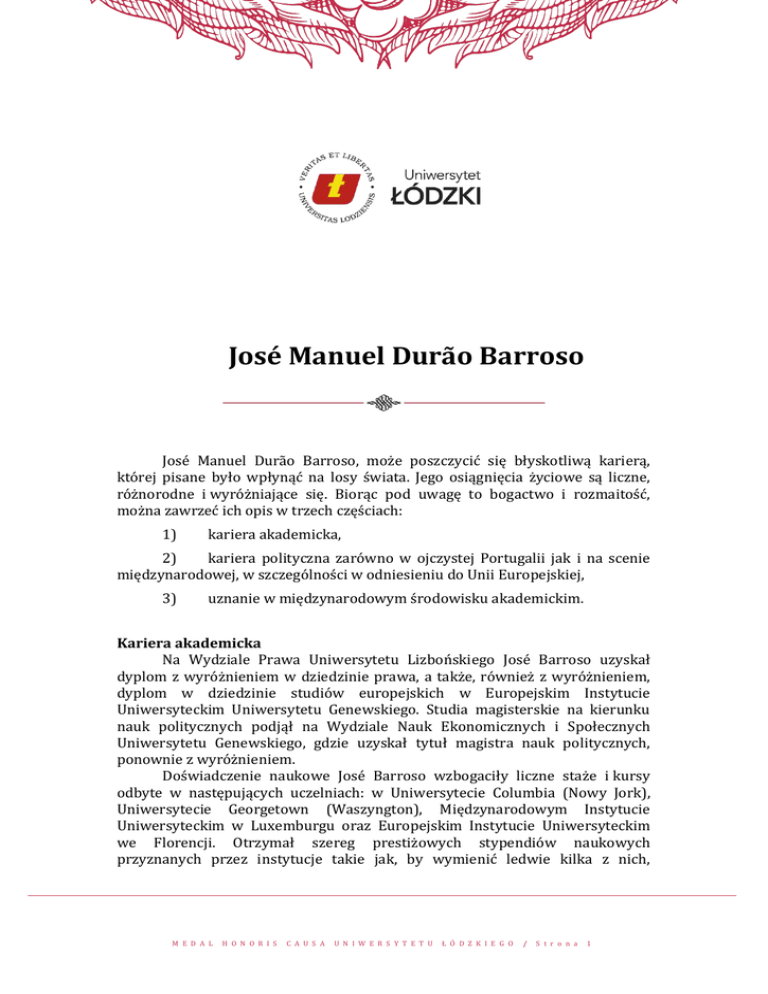 José Manuel Durão Barroso José Manuel Durão Barroso, może poszczycić się błyskotliwą karierą, której pisane było wpłynąć na losy świata. Jego osiągnięcia życiowe są liczne, różnorodne i wyróżniające się. Biorąc pod uwagę to bogactwo i rozmaitość, można zawrzeć ich opis w trzech częściach: 1) kariera akademicka, 2) kariera polityczna zarówno w ojczystej Portugalii jak i na scenie międzynarodowej, w szczególności w odniesieniu do Unii Europejskiej, 3) uznanie w międzynarodowym środowisku akademickim. Kariera akademicka Na Wydziale Prawa Uniwersytetu Lizbońskiego José Barroso uzyskał dyplom z wyróżnieniem w dziedzinie prawa, a także, również z wyróżnieniem, dyplom w dziedzinie studiów europejskich w Europejskim Instytucie Uniwersyteckim Uniwersytetu Genewskiego. Studia magisterskie na kierunku nauk politycznych podjął na Wydziale Nauk Ekonomicznych i Społecznych Uniwersytetu Genewskiego, gdzie uzyskał tytuł magistra nauk politycznych, ponownie z wyróżnieniem. Doświadczenie naukowe José Barroso wzbogaciły liczne staże i kursy odbyte w następujących uczelniach: w Uniwersytecie Columbia (Nowy Jork), Uniwersytecie Georgetown (Waszyngton), Międzynarodowym Instytucie Uniwersyteckim w Luxemburgu oraz Europejskim Instytucie Uniwersyteckim we Florencji. Otrzymał szereg prestiżowych stypendiów naukowych przyznanych przez instytucje takie jak, by wymienić ledwie kilka z nich, M E D A L H O N O R I S C A U S A U N I W E R S Y T E T U Ł Ó D Z K I E G O / S t r o n a 1 M E D A L H O N O R I S C A U S A U N I W E R S Y T E T U Ł Ó D Z K I E G O Konfederacja Szwajcarska, Komisja Wspólnot Europejskich, Fundacja Volkswagena, a także NATO i Szwajcarska Narodowa Fundacja Naukowa. Prof. Barroso gościnnie wykładał w Centrum Studiów Niemieckichi Europejskich w Uniwersytecie Georgetown. Przez cztery lata (od r. 1995 do r. 1999). Piastował stanowisko Dyrektora Wydziału Stosunków Międzynarodowych w Uniwersytecie Lusiada w Lizbonie. José Barroso jest autorem kilku książek z dziedziny nauk politycznych, stosunków międzynarodowych oraz kwestii dotyczących Unii Europejskiej, w tym: Sistema de Governo e Sistema Partidario, Le système politique portugais face à l’intégration européenne, Política de Cooperação, A Política Externa Portuguesa, Uma Certa Ideia de Europa, Uma Ideia para Portugal, Mudar de Modelo oraz Reformar: Dois Anos de Governo. Ponadto Profesor Barroso opublikował wiele artykułów na tematy związane z naukami politycznymi oraz prawem konstytucyjnym w rozmaitych portugalskich i międzynarodowych pracach zbiorowych, encyklopediach i czasopismach naukowych, m.in. w Análise Social, Il Politico, Pólis, a także Dictionnaire International du Fédéralisme. Był także założycielem i pierwszym dyrektorem periodyku Revista de Ciência Política. Chociaż jako naukowiec prof. José Barroso był postacią wpływową i inspirującą oraz pionierem w swojej dziedzinie, istotą jego zasług dla świata jest przekuwanie teorii w praktykę. Kariera polityczna W roku 1980, José Manuel Durão Barroso został członkiem portugalskiej Partii Socjaldemokratycznej (PSD), w której pełnił szereg ważnych funkcji: był m.in. członkiem Komitetu ds. Polityki Narodowej, Zastępcą Dyrektora Krajowego Biura Analiz, Przewodniczącym Komitetu ds. Stosunków Międzynarodowych. W 1999 roku został wybrany na stanowisko Przewodniczącego partii, a później był na to ważne polityczne stanowisko ponownie wybierany aż trzykrotnie. W tym okresie José Barroso pełnił funkcje: Przewodniczącego Parlamentarnej Komisji Spraw Zagranicznych, Sekretarza Stanu ds. Wewnętrznych, Sekretarza Stanu ds. Zagranicznych i Współpracy oraz Ministra Spraw Zagranicznych w XI i XII Rządzie Konstytucyjnym Portugalii. José Barroso występował jako przywódca lub uczestnik wielu misji międzynarodowych, w szczególności procesu samostanowienia Timoru Wschodniego i procesu pokojowego w Angoli w latach 1990-91. Był Przewodniczącym delegacji Międzynarodowego Instytutu na rzecz Demokracji i Pomocy Wyborczej w Bośni i Hercegowinie we wrześniu 1996 r. oraz Doradcą Organizacji Narodów Zjednoczonych w sprawie projektu procesu pokojowego w Afryce. Prof. Barroso należał też do różnych nieformalnych grup doradczych przy Sekretarzu Generalnym Organizacji Narodów Zjednoczonych, M E D A L H O N O R I S C A U S A U N I W E R S Y T E T U Ł Ó D Z K I E G O / S t r o n a 2 M E D A L H O N O R I S C A U S A U N I W E R S Y T E T U Ł Ó D Z K I E G O w szczególności grupy doradczej przy Sekretarzu Generalnym w kwestii Demokratycznej Republiki Konga. José Barroso był Wiceprzewodniczącym Europejskiej Partii Ludowej w latach 1999-2002 i Wiceprzewodniczącym Stowarzyszenia Partii Prawicowych Centrist Democrats International od 2001 do 2005 r. W kwietniu 2002 roku José Manuel Durão Barroso został Premierem Rządu Portugalii, którą to funkcję pełnił przez dwa lata. Wówczas został przywołany na scenę polityki międzynarodowej wyborem na stanowisko Przewodniczącego Komisji Europejskiej. We wrześniu 2009 Pan José Barroso ponownie został wybrany na stanowisko Przewodniczącego Komisji Europejskiej na kadencję 2010-2014. W uznaniu służby społeczeństwom Unii Europejskiej oraz znakomitych osiągnięć naukowych Przewodniczący José Manuel Durão Barroso otrzymał ponad 50 odznaczeń, nagród i wyróżnień. Spośród ich długiej listy należy wymienić następujące uczelnie, które przyznały Mu tytuły doktora honoris causa: Uniwersytet Rogera Williamsa w Rhode Island, USA, 2005 r. Uniwersytet Georgetown w Waszyngtonie, USA, 2005 r. Uniwersytet w Genui, Włochy, 2006 r. Uniwersytetu Kobo, Japonia, 2006 r. Uniwersytet Candido Mendel w Rio de Janeiro, 2006 r. Uniwersytet w Edynburgu, 2006 r. Uniwersytet „La Sapienza” w Rzymie, 2007 r. Szkoła Główna Handlowa w Warszawie, 2007 r. Pontificia Universidade Catolica de Sao Paulo, Br