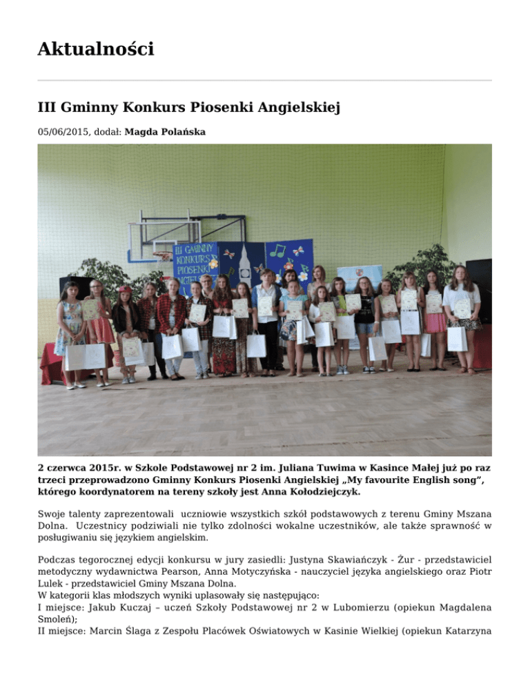 Aktualności III Gminny Konkurs Piosenki Angielskiej 05/06/2015, dodał: Magda Polańska 2 czerwca 2015r. w Szkole Podstawowej nr 2 im. Juliana Tuwima w Kasince Małej już po raz trzeci przeprowadzono Gminny Konkurs Piosenki Angielskiej „My favourite English song”, którego koordynatorem na tereny szkoły jest Anna Kołodziejczyk. Swoje talenty zaprezentowali uczniowie wszystkich szkół podstawowych z terenu Gminy Mszana Dolna. Uczestnicy podziwiali nie tylko zdolności wokalne uczestników, ale także sprawność w posługiwaniu się językiem angielskim. Podczas tegorocznej edycji konkursu w jury zasiedli: Justyna Skawiańczyk - Żur - przedstawiciel metodyczny wydawnictwa Pearson, Anna Motyczyńska - nauczyciel języka angielskiego oraz Piotr Lulek - przedstawiciel Gminy Mszana Dolna. W kategorii klas młodszych wyniki uplasowały się następująco: I miejsce: Jakub Kuczaj – uczeń Szkoły Podstawowej nr 2 w Lubomierzu (opiekun Magdalena Smoleń); II miejsce: Marcin Ślaga z Zespołu Placówek Oświatowych w Kasinie Wielkiej (opiekun Katarzyna Pałgan); III miejsce: Natasza Strug – uczennica Szkoły Podstawowej nr 2 im. Juliana Tuwima w Kasince Małej (opiekun Anna Kołodziejczyk i Małgorzata Jędrysek). Wyróżnienie otrzymała Oliwia Kościelniak z Zespołu Szkoły i Przedszkola w Olszówce. W kategorii klas starszych wygrali: I miejsce: Justyna Giemnik z Zespołu Placówek Oświatowych w Kasinie Wielkiej (opiekun Katarzyna Pałgan); II miejsce: Dorota Potaczek i Patrycja Dudzik z Zespołu Szkoły i Przedszkola w Łostówce (opiekun Bożena Dudzik); III miejsce: Aleksandra Wąchała i Alicja Kowalczyk ze Szkoły Podstawowej nr 1 w Lubomierzu (Natalia Kuziel). W tej kategorii wyróżnione zostały Zuzanna Piwowar oraz Gabriela Masłowiec – uczennice Szkoły Podstawowej nr 2 w Kasince Małej. Po obejrzeniu wszystkich występów, gdy jury udało się na obrady, gospodarze imprezy oraz dzieci naszej szkoły zaprosili gości do obejrzenia występów artystycznych – o przebiegu konkursu opowiadają organizatorzy. Jako pierwsi wystąpili uczniowie z klasy V, którzy zachwycili publiczność swoim pokazem mody. Następnie mieliśmy okazję obejrzeć balet „Bajoro łabędzie” w wykonaniu trzecioklasistów. Oczekiwanie na wyniki umiliło nam także podziwianie występów tanecznych dzieci z oddziału przedszkolnego. Gdy już wszystko było jasne, a nagrody rozdane, przyszedł też czas na poczęstunek. Pani Dyrektor Czesława Łabuz, gospodarz i organizator imprezy, z zadowoleniem podkreśliła fakt, iż nasz konkurs na stałe wpisał się w kalendarz uroczystości gminnych. Zaś zainteresowanie jakim cieszy się ta forma rozwijania talentów uczniów jest dla nas dowodem na to, że warto kontynuować wysiłki czynione w tym kierunku. Gorąco podziękowała wszystkim uczestnikom oraz nauczycielom za przygotowanie uczniów, szczególne zaś Wójtowi Gminy Mszana Dolna Bolesławowi Żabie, który objął nasz konkurs Honorowym Patronatem. Wszystkim uczestnikom życzymy dalszych sukcesów! Agnieszka Świerk