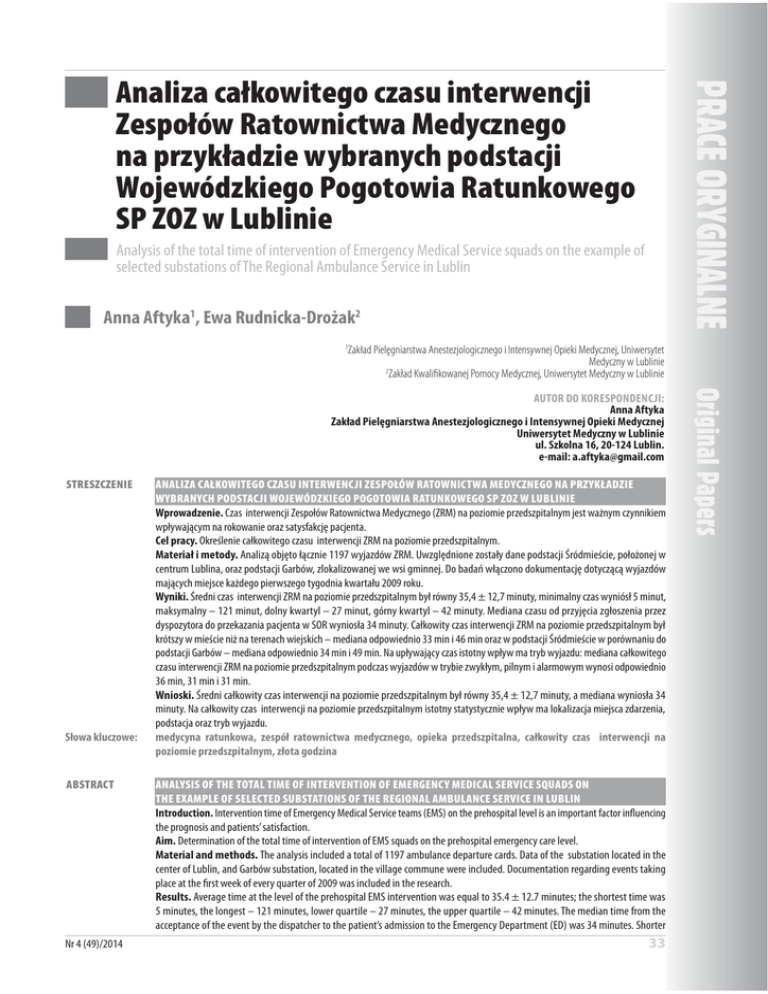 Analiza całkowitego czasu interwencji Zespołów Ratownictwa Medycznego na przykładzie wybranych podstacji Wojewódzkiego Pogotowia Ratunkowego SP ZOZ w Lublinie Analysis of the total time of intervention of Emergency Medical Service squads on the example of selected substations of The Regional Ambulance Service in Lublin Anna Aftyka1, Ewa Rudnicka-Drożak2 1 Zakład Pielęgniarstwa Anestezjologicznego i Intensywnej Opieki Medycznej, Uniwersytet Medyczny w Lublinie 2 Zakład Kwalifikowanej Pomocy Medycznej, Uniwersytet Medyczny w Lublinie AUTOR DO KORESPONDENCJI: Anna Aftyka Zakład Pielęgniarstwa Anestezjologicznego i Intensywnej Opieki Medycznej Uniwersytet Medyczny w Lublinie ul. Szkolna 16, 20-124 Lublin. e-mail: [email protected] STRESZCZENIE Słowa kluczowe: ABSTRACT Nr 4 (49)/2014 ANALIZA CAŁKOWITEGO CZASU INTERWENCJI ZESPOŁÓW RATOWNICTWA MEDYCZNEGO NA PRZYKŁADZIE WYBRANYCH PODSTACJI WOJEWÓDZKIEGO POGOTOWIA RATUNKOWEGO SP ZOZ W LUBLINIE Wprowadzenie. Czas interwencji Zespołów Ratownictwa Medycznego (ZRM) na poziomie przedszpitalnym jest ważnym czynnikiem wpływającym na rokowanie oraz satysfakcję pacjenta. Cel pracy. Określenie całkowitego czasu interwencji ZRM na poziomie przedszpitalnym. Materiał i metody. Analizą objęto łącznie 1197 wyjazdów ZRM. Uwzględnione zostały dane podstacji Śródmieście, położonej w centrum Lublina, oraz podstacji Garbów, zlokalizowanej we wsi gminnej. Do badań włączono dokumentację dotyczącą wyjazdów mających miejsce każdego pierwszego tygodnia kwartału 2009 roku. Wyniki. Średni czas interwencji ZRM na poziomie przedszpitalnym był równy 35,4 ± 12,7 minuty, minimalny czas wyniósł 5 minut, maksymalny – 121 minut, dolny kwartyl – 27 minut, górny kwartyl – 42 minuty. Mediana czasu od przyjęcia zgłoszenia przez dyspozytora do przekazania pacjenta w SOR wyniosła 34 minuty. Całkowity czas interwencji ZRM na poziomie przedszpitalnym był krótszy w mieście niż na terenach wiejskich – mediana odpowiednio 33 min i 46 min oraz w podstacji Śródmieście w porównaniu do podstacji Garbów – mediana odpowiednio 34 min i 49 min. Na upływający czas istotny wpływ ma tryb wyjazdu: mediana całkowitego czasu interwencji ZRM na poziomie przedszpitalnym podczas wyjazdów w trybie zwykłym, pilnym i alarmowym wynosi odpowiednio 36 min, 31 min i 31 min. Wnioski. Średni całkowity czas interwencji na poziomie przedszpitalnym był równy 35,4 ± 12,7 minuty, a mediana wyniosła 34 minuty. Na całkowity czas interwencji na poziomie przedszpitalnym istotny statystycznie wpływ ma lokalizacja miejsca zdarzenia, podstacja oraz tryb wyjazdu. medycyna ratunkowa, zespół ratownictwa medycznego, opieka przedszpitalna, całkowity czas interwencji na poziomie przedszpitalnym, złota godzina ANALYSIS OF THE TOTAL TIME OF INTERVENTION OF EMERGENCY MEDICAL SERVICE SQUADS ON THE EXAMPLE OF SELECTED SUBSTATIONS OF THE REGIONAL AMBULANCE SERVICE IN LUBLIN Introduction. Intervention time of Emergency Medical Service teams (EMS) on the prehospital level is an important factor influencing the prognosis and patients’ satisfaction. Aim. Determination of the total time of intervention of EMS squads on the prehospital emergency care level. Material and methods. The analysis included a total of 1197 ambulance departure cards. Data of the substation located in the center of Lublin, and Garbów substation, located in the village commune were included. Documentation regarding events taking place at the first week of every quarter of 2009 was included in the research. Results. Average time at the level of the prehospital EMS intervention was equal to 35.4 ± 12.7 minutes; the shortest time was 5 minutes, the longest – 121 minutes, lower quartile – 27 minutes, the upper quartile – 42 minutes. The median time from the acceptance of the event by the dispatcher to the patient’s admission to the Emergency Department (ED) was 34 minutes. Shorter 33 Analiza całkowitego czasu interwencji Zespołów Ratownictwa Medycznego na przykładzie wybranych podstacji ... Keywords: total time of the intervention at the level of prehospital EMS was observed rather in the town than in rural areas – the median was 33 minutes and 46 minutes respectively and in downtown substation compared to Garbów substation – median 34 min. and 49 min. respectively. The type of event significantly affects the elapsed time: median overall level of the prehospital emergency care of EMS during departure on a normal, urgent or emergency mode is 36, 31 and 31 minutes respectively. Conclusions. The mean total time of the prehospital emergency care was equal to 35.4 ± 12.7 minutes, and the median was 34 minutes. The location of the event, substation and the mode of departure statistically significantly affect the total time of the prehospital emergency care. emergency medicine, medical emergency service squad, prehospital emergency care, prehospital time, total prehospital interval, golden hour WPROWADZENIE Na znaczenie czynnika czasu w działaniach ratunkowych zwrócono uwagę podczas analizy doświadczeń amerykańskich wojskowych służb medycznych, zebranych i przedstawionych przez Komisję Traumatologii Amerykańskiego Kolegium Chirurgów. Dane te wskazywały między innymi na wagę czasu, jaki upływa od chwili zaistnienia urazu do momentu podjęcia kwalifikowanej pomocy lekarskiej. Podczas I wojny światowej czas ten wynosił od 12 do 18 godzin, natomiast podczas II wojny światowej – 6 do 12 godzin. W tym okresie śmiertelność okołourazowa była bardzo wysoka. W wojnie koreańskiej Korpus Medyczny USA zdecydował o pominięciu batalionowych stacji ratunkowych i transporcie rannych żołnierzy bezpośrednio z pola walki do tworzonych ruchomych szpitali chirurgicznych. Pozwoliło to na skrócenie czasu „uraz – zabieg chirurgiczny” i zmniejszyło śmiertelność do 2,4%. Taktykę tę udoskonalono podczas wojny wietnamskiej, podczas której transportow