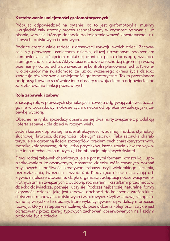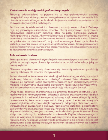 Kształtowanie umiejętności grafomotorycznych Próbując odpowiedzieć na pytanie: co to jest grafomotoryka, musimy uwzględnić cały złożony proces zaangażowany w czynność rysowania lub pisania, w czasie którego dochodzi do kojarzenia wrażeń kinestetyczno - ruchowych, dotykowych i ruchowych. Rodzice czerpią wiele radości z obserwacji rozwoju swoich dzieci. Zachwycają się pierwszym uśmiechem dziecka, dłużej utrzymanym spojrzeniem niemowlęcia, zaciśnięciem malutkiej dłoni na palcu dorosłego, wyrzucaniem grzechotki z wózka. Aktywności ruchowe przechodzą ogromną i ważną przemianę - od odruchu do świadomej kontroli i planowania ruchu. Niewielu opiekunów ma świadomość, że już od wczesnego okresu życia dziecko kształtuje również swoje umiejętności grafomotoryczne. Takim przemianom podporządkowane są również inne obszary rozwoju dziecka odpowiedzialne za kształtowanie funkcji poznawczych. Rola zabawek i zabaw Znaczącą rolę w pierwszych stymulacjach rozwoju odgrywają zabawki. Szczególnie w początkowym okresie życia dziecka od opiekunów zależy, jaką zabawkę wybiorą. Obecnie na rynku sprzedaży obserwuje się dwa nurty związane z produkcją i ofertą zabawek dla dzieci w różnym wieku. Jeden kierunek opiera się na idei atrakcyjności wizualnej, modzie, stymulacji słuchowej, łatwości, dostępności „obsługi” zabawki. Taka zabawka charakteryzuje się ogromną ilością szczegółów, brakiem cech charakterystycznych, mozaiką kolorystyczną, dużą liczbą przycisków, każde użycie klawisza wywołuje inną mechaniczną muzyczkę i kombinację migających świateł. Drugi rodzaj zabawek charakteryzuje się prostymi formami konstrukcji, uporządkowaniem kolorystycznym, dostarcza dziecku zróżnicowanych doznań zmysłowych i możliwości kreatywnej zabawy, czyli wielorakiego łączenia, przekształcania, tworzenia z wyobraźni. Kiedy ręce dziecka zaczynają odkrywać najbliższe otoczenie, dzięki organizacji, adaptacji i obserwacji wielokrotnych zmian związanych z budową, rozmiarami i kształtami przedmiotów, dziecko doświadcza, poznaje i uczy się. Podczas najbardziej naturalnej formy aktywności dziecka, jaką jest zabawa, dochodzi do kojarzenia wrażeń kinestetyczno - ruchowych, dotykowych i wzrokowych. Czyli w zabawę zaangażowane są wszystkie te obszary, które wykorzystywane są w dalszym procesie rozwoju, który następuje w możliwej do przewidzenia kolejności i zwykle jest obrazowany przez szereg typowych zachowań obserwowanych na każdym poziomie życia dziecka. 1 Rodzaj zabaw zmienia się wraz z wiekiem dziecka, ale zawsze taka aktywność powinna zawierać: • Ruch angażujący tzw. dużą motorykę - umożliwienie dziecku przemieszczanie się, pokonywanie dystansów, wspinanie, przechodzenie przez przeszkody, kopanie piłki. • Ruch angażujący tzw. małą motorykę - popychanie, ciągnięcie, wyjmowanie, wkładanie, turlanie, rzucanie piłki. • Stymulację rozwoju koordynacji wzrokowo - ruchowej - dopasowywanie, konstruowanie, nakładanie na patyk, jazda na hulajnodze, na rowerze. • Zabawy manipulacyjne - angażowanie napięcia drobnych mięśni dłoni i palców oraz zakresu ruchu nadgarstków. Propozycje aktywności wpływających na kształtowanie umiejętności grafomotorycznych Zabawy manualne: • • • • • • • • • • • • • Nawlekanie korali, przewlekanie tasiemek. Konstruowanie z klocków. Wydzieranie z papieru. Malowanie palcami. „Stemple” z dłoni. Lepienie z gliny, plasteliny, modeliny. Wykorzystywanie zróżnicowanych faktur do zabaw (rozróżnianie przez dotyk). Wycinanie. Rysowanie na dużych powierzchniach oburącz - koła na zewnątrz i do wewnątrz. Malowanie znaku nieskończoności, labiryntów. Wyszukiwanie drobnych przedmiotów w miskach wypełnionych grochem/ ryżem/ fasolą. Rozpoznawanie poprzez dotyk (przedmioty w woreczku). Konstrukcje z klocków drewnianych i „Lego”. 2 Zabawy ruchowe - duża motoryka: • • • • • • • • • „Taczki”. Przeciąganie liny lub rozciąganie gumy. Skakanie na dużej piłce z uchwytami. Przeskakiwanie obunóż przez linkę ułożoną na podłodze. Chodzenie na krzyż. Chodzenie stopkami do tyłu i do przodu. Naśladowanie biegania (w miejscu), skakania różnych zwierząt. Balansowanie ciałem na dużej piłce w pozycji siedzącej. Chodzenie po krawężnikach, wąskich deskach. Zabawy ruchowe - mała motoryka: • • • • • • • • • • • Krążenia prostymi ramionami do przodu i do tyłu. Krążenia ramionami złożonymi w skrzydełka do przodu, do tyłu. Pływanie na sucho, ramiona jak do żabki, kraula lub motylka. Swobodne machanie ramionami - ciężar ciała. Naprzemienne „wchodzenie” dłońmi po kijku ustawionym pionowo na stole. Krążenia ramionami do przodu z kijkiem w obu dłoniach. Uciskanie, masowanie ramion na całej długości zróżnicowanymi fakturami. Uciskanie, masowanie poszczególnych palców. Ściskanie piłeczek antystresowych. Naprzemienne zaciskanie dłoni. Potrząsanie kolejno kończynami. Źródło: Wydawnictwo Raabe 3