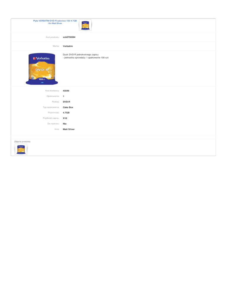 Płyta VERBATIM DVD-R cake box 100 4.7GB 16x Matt Silver Kod produktu: Marka: xck0750284 Verbatim Dysk DVD-R jednokrotnego zapisu - jednostka sprzedaży 1 opakowanie 100 szt Kod dostawcy: Opakowanie: Rodzaj: Typ opakowania: Pojemność: 1 DVD-R Cake Box 4.7GB Prędkość zapisu: X16 Do nadruku: Nie Inne: Pojemność (GB): Zdjęcia produktu 43549 Matt Silver