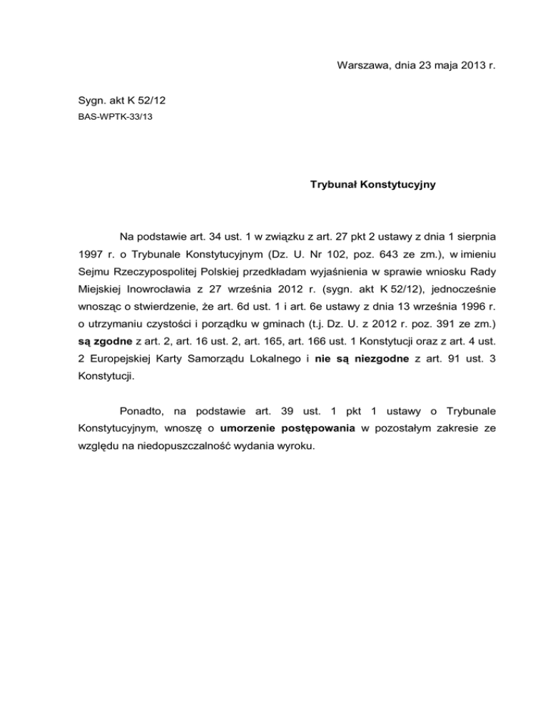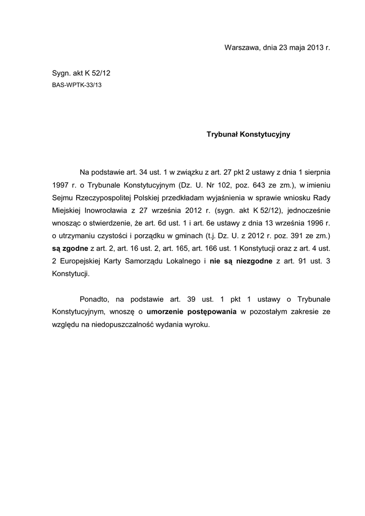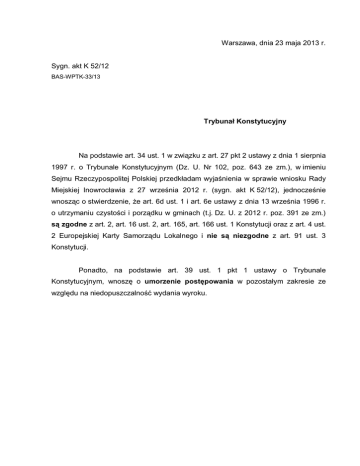 Warszawa, dnia 23 maja 2013 r. Sygn. akt K 52/12 BAS-WPTK-33/13 Trybunał Konstytucyjny Na podstawie art. 34 ust. 1 w związku z art. 27 pkt 2 ustawy z dnia 1 sierpnia 1997 r. o Trybunale Konstytucyjnym (Dz. U. Nr 102, poz. 643 ze zm.), w imieniu Sejmu Rzeczypospolitej Polskiej przedkładam wyjaśnienia w sprawie wniosku Rady Miejskiej Inowrocławia z 27 września 2012 r. (sygn. akt K 52/12), jednocześnie wnosząc o stwierdzenie, że art. 6d ust. 1 i art. 6e ustawy z dnia 13 września 1996 r. o utrzymaniu czystości i porządku w gminach (t.j. Dz. U. z 2012 r. poz. 391 ze zm.) są zgodne z art. 2, art. 16 ust. 2, art. 165, art. 166 ust. 1 Konstytucji oraz z art. 4 ust. 2 Europejskiej Karty Samorządu Lokalnego i nie są niezgodne z art. 91 ust. 3 Konstytucji. Ponadto, na podstawie art. 39 ust. 1 pkt 1 ustawy o Trybunale Konstytucyjnym, wnoszę o umorzenie postępowania w pozostałym zakresie ze względu na niedopuszczalność wydania wyroku. Uzasadnienie I. Przedmiot kontroli 1. Jako przedmiot kontroli Rada Miejska Inowrocławia (dalej także: Rada Miejska, wnioskodawczyni) wskazała art. 6d oraz art. 6e ustawy z dnia 13 września 1996 r. o utrzymaniu czystości i porządku w gminach (t.j. Dz. U. z 2012 r. poz. 391 ze zm.; dalej: u.c.p.g.). Przepisy te zostały wprowadzone do u.c.p.g. w drodze nowelizacji dokonanej ustawą z dnia 11 lipca 2011 r. o zmianie ustawy o utrzymaniu czystości i porządku w gminach oraz niektórych innych ustaw (Dz. U. Nr 152, poz. 897 ze zm.; dalej: nowelizacja). Pierwszy z przywołanych przepisów został zakwestionowany w zakresie, w jakim nakłada na wójta, burmistrza lub prezydenta miasta obowiązek zorganizowania przetargu na odbieranie odpadów komunalnych od właścicieli nieruchomości albo przetargu na odbieranie i zagospodarowanie tych odpadów. Z uwagi na to, że: a) zakresowi zaskarżenia wskazanemu w petitum wniosku Rady Miejskiej odpowiada wyłącznie zawartość normatywna art. 6d ust. 1 u.c.p.g. oraz b) z uzasadnienia wniosku Rady Miejskiej wynika, iż w rzeczywistości zarzut niezgodności z Konstytucją dotyczy jedynie ust. 1 art. 6d u.c.p.g., a nie treści całego art. 6d u.c.p.g. (zob. np. wniosek, s. 2, 9, 15 czy 17), Sejm, odwołując się do zasady falsa demonstratio non nocet, która nakazuje odczytywać zakres zaskarżenia zgodnie z intencjami podmiotu uruchamiającego postępowanie przed sądem konstytucyjnym, skłania się do zmiany sposobu oznaczenia przedmiotu kontroli i wskazania jako taki art. 6d ust. 1 u.c.p.g., zgodnie z którym: „Wójt, burmistrz lub prezydent miasta jest obowiązany zorganizować przetarg na odbieranie odpadów komunalnych od właścicieli nieruchomości, o których mowa w art. 6c, albo przetarg na odbieranie i zagospodarowanie tych odpadów”. 2. Drugi z zaskarżonych przepisów – art. 6e u.c.p.g. obowiązuje w brzmieniu: „Spółki z udziałem gminy mogą odbierać odpady komunalne od właścicieli -2- nieruchomości, na zlecenie gminy, w przypadku, gdy zostały wybrane w drodze przetargu, o którym mowa w art. 6d ust. 1”. 3. Proponowana przez Sejm modyfikacja sposobu oznaczenia przedmiotu zaskarżenia znalazła odzwierciedlenie w petitum niniejszego pisma i została uwzględniona w jego dalszej części. II. Analiza formalnoprawna 1. Kontrola konstytucyjności w niniejszej sprawie została zainicjowana wnioskiem Rady Miejskiej Inowrocławia. Zgodnie z art. 191 ust. 1 pkt 3 w związku z art. 188 Konstytucji, organy stanowiące jednostek samorządu terytorialnego mogą wystąpić do Trybunału Konstytucyjnego z wnioskiem w sprawie zbadania zgodności ustaw z Konstytucją oraz z ratyfikowanymi umowami międzynarodowymi, których ratyfikacja wymagała uprzedniej zgody wyrażonej w ustawie. Ustanowiony w art. 191 ust. 2 Konstytucji warunek dopuszczalności złożenia wniosku do Trybunału Konstytucyjnego przez organ stanowiący jednostki samorządu terytorialnego polega na wymaganiu istnienia związku między zaskarżonym przepisem a sprawami objętymi zakresem działania tego rodzaju jednostek. Odnosząc się do legitymacji procesowej wnioskodawczyni, należy przypomnieć, że zgodnie z utrwalonym stanowiskiem Trybunału Konstytucyjnego, „pojęcie «sprawy objęte zakresem działania» powinno być interpretowane w ścisłym związku z kompetencjami organów stanowiących j.s.t. Znaczy to, że organ stanowiący j.s.t. nie może wystąpić z wnioskiem w każdej sprawie po prostu tylko dotyczącej j.s.t. lub wspólnoty samorządowej (zob. postanowienie z 18 stycznia 2005 r., sygn. Tw 34/03, OTK ZU nr 1/B/2005, poz. 2). Mogą to być wyłącznie sprawy wchodzące w zakres działania wnioskodawcy, rozpatrywane w związku z jego kompetencjami (a więc działania, do których podjęcia wnioskodawca jest zobligowany), oraz takie, o których bycie przesądza istota samorządu terytorialnego (zob. postanowienie z 28 sierpnia 2008 r., sygn. Tw 16/08, OTK ZU nr 2/B/2009, poz. 65). Decydujące znaczenie dla oceny dopuszczalności rozpatrzenia konkretnego wniosku ma zatem ustalenie, czy kwestionowany przepis dotyczy spraw objętych zakresem działania podmiotów wymienionych w art. 191 ust. 1 pkt 3 Konstytucji” (wyrok TK z 9 czerwca 2010 r., sygn. akt K 29/07). -3- O dopuszczalności wszczęcia kontroli konstytucyjności w niniejszej sprawie przesądza fakt, że zakwestionowana regulacja dotyczy jednego z zadań własnych gminy – utrzymania czystości i porządku w gminie (art. 3 ust. 1 u.c.p.g.), które realizowane jest m.in. przez zorganizowanie odbioru i zagospodarowania odpadów komunalnych. W ocenie Sejmu, zaskarżone przepisy należą do sfery objętej zakresem działania wnioskodawczyni, gdyż w zakresie spraw związanych z prowadzeniem przez gminę gospodarki odpadami komunalnymi rada gminy podejmuje stosowne uchwały (zob. m.in. art. 6k czy art. 6l u.c.p.g.). Ponadto potwierdzeniem legitymacji procesowej Rady Miejskiej w niniejszej sprawie jest fakt, że art. 4 ust. 1 ustawy z dnia 20 grudnia 1996 