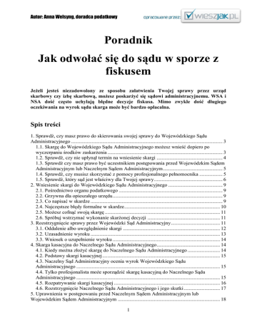Autor: Anna Welsyng, doradca podatkowy Poradnik Jak odwołać się do sądu w sporze z fiskusem Jeżeli jesteś niezadowolony ze sposobu załatwienia Twojej sprawy przez urząd skarbowy czy izbę skarbową, możesz poskarżyć się sądowi administracyjnemu. WSA i NSA dość często uchylają błędne decyzje fiskusa. Mimo zwykle dość długiego oczekiwania na wyrok sądu skarga może być bardzo opłacalna. Spis treści 1. Sprawdź, czy masz prawo do skierowania swojej sprawy do Wojewódzkiego Sądu Administracyjnego ..................................................................................................................... 3 1.1. Skargę do Wojewódzkiego Sądu Administracyjnego możesz wnieść dopiero po wyczerpaniu środków zaskarżenia ......................................................................................... 3 1.2. Sprawdź, czy nie upłynął termin na wniesienie skargi ................................................... 4 1.3. Sprawdź czy masz prawo być uczestnikiem postępowania przed Wojewódzkim Sądem Administracyjnym lub Naczelnym Sądem Administracyjnym .............................................. 5 1.4. Sprawdź, czy musisz skorzystać z pomocy profesjonalnego pełnomocnika .................. 5 1.5. Sprawdź, który sąd jest właściwy dla Twojej sprawy ..................................................... 6 2. Wniesienie skargi do Wojewódzkiego Sądu Administracyjnego .......................................... 9 2.1. Pośrednictwo organu podatkowego ................................................................................ 9 2.2. Grzywna dla opieszałego urzędu ..................................................................................... 9 2.3. Co napisać w skardze ...................................................................................................... 9 2.4. Najczęstsze błędy formalne w skardze .......................................................................... 10 2.5. Możesz cofnąć swoją skargę ......................................................................................... 11 2.6. Spróbuj wstrzymać wykonanie skarżonej decyzji ........................................................ 11 3. Rozstrzygnięcie sprawy przez Wojewódzki Sąd Administracyjny ...................................... 11 3.1. Oddalenie albo uwzględnienie skargi ........................................................................... 12 3.2. Uzasadnienie wyroku .................................................................................................... 13 3.3. Wniosek o uzupełnienie wyroku ................................................................................... 14 4. Skarga kasacyjna do Naczelnego Sądu Administracyjnego................................................. 14 4.1. Kiedy można złożyć skargę do Naczelnego Sądu Administracyjnego ......................... 14 4.2. Podstawy skargi kasacyjnej ........................................................................................... 15 4.3. Naczelny Sąd Administracyjny ocenia wyrok Wojewódzkiego Sądu Administracyjnego ............................................................................................................... 15 4.4. Tylko profesjonalista może sporządzić skargę kasacyjną do Naczelnego Sądu Administracyjnego ............................................................................................................... 15 4.5. Rozpatrywanie skargi kasacyjnej .................................................................................. 16 4.6. Rozstrzygnięcie Naczelnego Sądu Administracyjnego i jego skutki ............................ 17 5. Uprawnienia w postępowaniu przed Naczelnym Sądem Administracyjnym lub Wojewódzkim Sądem Administracyjnym ............................................................................... 18 1 5.1. Masz prawo domagać się, aby sędzia prowadzący Twoją sprawę przed Naczelnym Sądem Administracyjnym lub Wojewódzkim Sądem Administracyjnym był bezstronny .. 18 5.2. Sąd administracyjny musi udzielać stronom występującym w sprawie bez adwokata lub radcy prawnego potrzebnych wskazówek ...................................................................... 19 5.3. Masz prawo żądać szybkiego rozstrzygnięcia sprawy .................................................. 19 5.4. Masz prawo domagać się, aby rozpoznanie sprawy odbywa się jawnie ....................... 20 5.5. Prawa do sądu nie odbierają ograniczenia w zakresie zdolności do czynności prawnych .............................................................................................................................................. 20 5.6. Sprawy przed Naczelnym Sądem Administracyjnym lub Wojewódzkim Sądem Administracyjnym może prowadzić pełnomocnik ............................................................... 20 2 Kontroli poprawności pracy organów podatkowych dokonują Wojewódzkie Sądy Administracyjne (dalej WSA). Procedura rozpatrzenia Twojej skargi wynika z ustawy z dnia 30 sierpnia 2002 r.- Prawo o postępowaniu przed sądami administracyjnymi (dalej p.p.s.a.) (Dz. U. Nr 153 poz. 1270 z późn. zm.). WSA najczęściej kontrolują: 1) czy organ podatkowy wydając decyzję lub niektóre postanowienia poprawnie zastosował przepisy w stosunku do konkretnego stanu faktycznego (mógł powołać niewłaściwy przepis lub właściwy, ale błędnie go zinterpretować), 2) zachowanie przez urzędników wymaganej procedury rozstrzygnięcia sprawy (np. czy miałeś prawo do wypowiedzenia się do zebranych przeciwko Tobie dowodów, czy nie odmówiono ci dostępu do akt sprawy, czy sporna decyzja została doręczona pod właściwy adres), 3) czy zarzuty na bezczynność danego urzędu lub izby są zasadne (bezczynność powstaje, gdy w terminie przewidzianym przez prawo nie zostały podjęte wymagane przez prawo działania). Z kolei poprawność wyroku WSA jest kontrolowana przez Nac