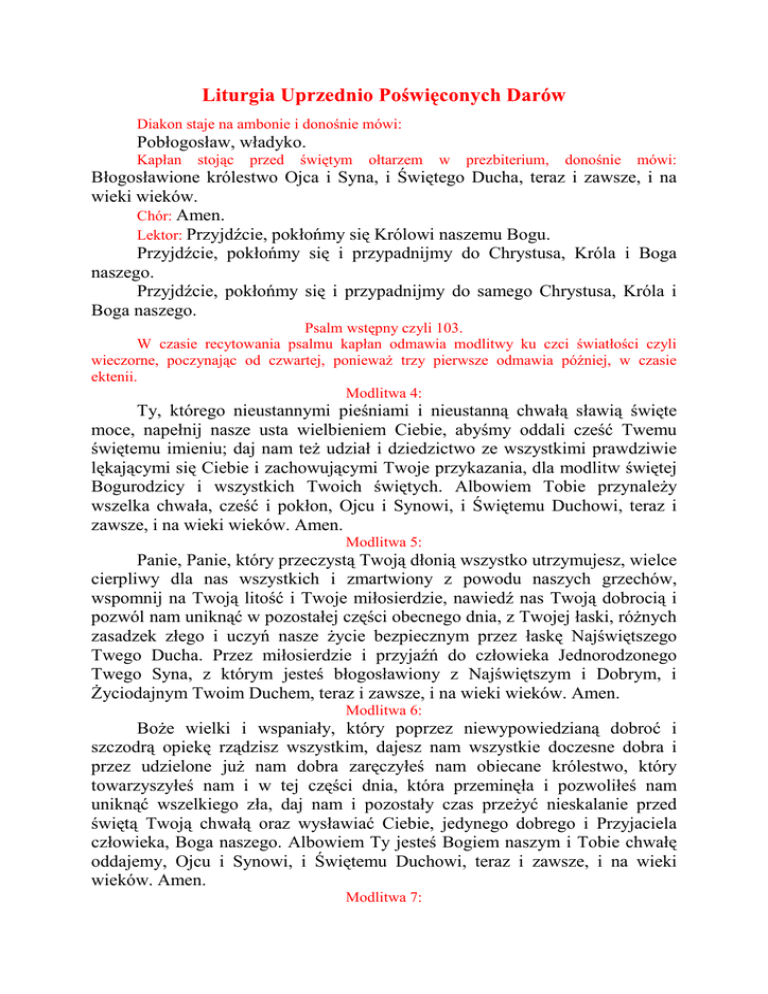 Diakon staje na ambonie i donośnie mówi: Pobłogosław, władyko. Kapłan stojąc przed świętym ołtarzem w prezbiterium, donośnie mówi: Błogosławione królestwo Ojca i Syna, i Świętego Ducha, teraz i zawsze, i na wieki wieków. Chór: Amen. Lektor: Przyjdźcie, pokłońmy się Królowi naszemu Bogu. Przyjdźcie, pokłońmy się i przypadnijmy do Chrystusa, Króla i Boga naszego. Przyjdźcie, pokłońmy się i przypadnijmy do samego Chrystusa, Króla i Boga naszego. Psalm wstępny czyli 103. W czasie recytowania psalmu kapłan odmawia modlitwy ku czci światłości czyli wieczorne, poczynając od czwartej, ponieważ trzy pierwsze odmawia później, w czasie ektenii. Modlitwa 4: Ty, którego nieustannymi pieśniami i nieustanną chwałą sławią święte moce, napełnij nasze usta wielbieniem Ciebie, abyśmy oddali cześć Twemu świętemu imieniu; daj nam też udział i dziedzictwo ze wszystkimi prawdziwie lękającymi się Ciebie i zachowującymi Twoje przykazania, dla modlitw świętej Bogurodzicy i wszystkich Twoich świętych. Albowiem Tobie przynależy wszelka chwała, cześć i pokłon, Ojcu i Synowi, i Świętemu Duchowi, teraz i zawsze, i na wieki wieków. Amen. Modlitwa 5: Panie, Panie, który przeczystą Twoją dłonią wszystko utrzymujesz, wielce cierpliwy dla nas wszystkich i zmartwiony z powodu naszych grzechów, wspomnij na Twoją litość i Twoje miłosierdzie, nawiedź nas Twoją dobrocią i pozwól nam uniknąć w pozostałej części obecnego dnia, z Twojej łaski, różnych zasadzek złego i uczyń nasze życie bezpiecznym przez łaskę Najświętszego Twego Ducha. Przez miłosierdzie i przyjaźń do człowieka Jednorodzonego Twego Syna, z którym jesteś błogosławiony z Najświętszym i Dobrym, i Życiodajnym Twoim Duchem, teraz i zawsze, i na wieki wieków. Amen. Modlitwa 6: Boże wielki i wspaniały, który poprzez niewypowiedzianą dobroć i szczodrą opiekę rządzisz wszystkim, dajesz nam wszystkie doczesne dobra i przez udzielone już nam dobra zaręczyłeś nam obiecane królestwo, który towarzyszyłeś nam i w tej części dnia, która przeminęła i pozwoliłeś nam uniknąć wszelkiego zła, daj nam i pozostały czas przeżyć nieskalanie przed świętą Twoją chwałą oraz wysławiać Ciebie, jedynego dobrego i Przyjaciela człowieka, Boga naszego. Albowiem Ty jesteś Bogiem naszym i Tobie chwałę oddajemy, Ojcu i Synowi, i Świętemu Duchowi, teraz i zawsze, i na wieki wieków. Amen. Modlitwa 7: Boże wielki i najwyższy, który jedyny masz nieśmiertelność, żyjący w niedostępnej światłości, które wszystkie stworzenia w mądrości uczyniłeś, który oddzieliłeś światłość od ciemności, słońce dałeś aby rządziło dniem, a księżyc zaś i gwiazdy, aby rządziły nocą, który nam grzesznym pozwoliłeś i w obecnej godzinie kroczyć przed Twoim obliczem wyznając wiarę i zanosząc Tobie wieczorną pieśń chwały. Ty sam, Przyjacielu człowieka, spraw, aby nasze modlitwy wznosiły się przed Tobą jak dym kadzidlany i zostały przyjęte jako wdzięczna woń. Daj nam, abyśmy obecny wieczór i nadchodzącą noc spędzili w pokoju, przyoblecz nas w oręż światłości, wybaw od strachu nocnego i od wszelkiego utrapienia, które chodzi w ciemności, i daj sen, który dałeś na ukojenie naszej niemocy, wolny od wszelkiej mary szatana. O Władco, dawco łask, obyśmy i na naszych łożach zaznali spokoju, wspominając nocą Twoje imię i oświeceni nauką Twoich przykazań wstali z radością duszy, aby wielbić Twoją łaskawość, zanosząc do Twego miłosierdzia modły i błagania za grzechy swoje i całego ludu, który dla modlitw świętej Bogurodzicy nawiedź łaską. Albowiem jesteś Bogiem Dobrym, Przyjacielem człowieka, i Tobie chwałę oddajemy, Ojcu i Synowi, i Świętemu Duchowi, teraz i zawsze, i na wieki wieków. Amen. Po skończeniu psalmu diakon mówi ektenię: W pokoju do Pana módlmy się. Chór: Panie, zmiłuj się. O pokój z wysokości i zbawienie dusz naszych, do Pana módlmy się. Chór: Panie, zmiłuj się. O pokój całego świata, stałość świętych Bożych Kościołów i zjednoczenie wszystkich, do Pana módlmy się. Chór: Panie, zmiłuj się. Za tę świątynię i za tych, którzy z wiarą, pobożnością i bojaźnią Bożą wchodzą do niego, do Pana módlmy się. Chór: Panie, zmiłuj się. Za metropolitę naszego N. i za biskupa naszego N., za czcigodne kapłaństwo, w Chrystusie diakonię, za całe duchowieństwo i lud, do Pana módlmy się. Chór: Panie, zmiłuj się. O zachowanie w opiece Bożej naszej ojczyzny, za jej władze i wojsko, do Pana módlmy się. Chór: Panie, zmiłuj się. Za to miasto (lub: za tę wieś; lub: za ten monaster), za wszystkie miasta i krainy, i za wszystkich wiernych żyjących w nich, do Pana módlmy się. Chór: Panie, zmiłuj się. O dobrą pogodę, obfitość plonów ziemi i czasy spokojne, do Pana módlmy się. Chór: Panie, zmiłuj się. Za żeglujących, podróżujących, chorych, cierpiących, uwięzionych oraz o ich wybawienie, do Pana módlmy się. Chór: Panie, zmiłuj się. O wybawienie nas z wszelkiego utrapienia, gniewu i niebezpieczeństwa, do Pana módlmy się. Chór: Panie, zmiłuj się. Wspomóż, zbaw, zmiłuj się i ochroń nas, Boże, łaską Twoją. Chór: Panie, zmiłuj się. Najświętszą, przeczystą, błogosławioną, pełną chwały Władczynię naszą Bogurodzicę i zawsze Dziewicę Marię ze wszystkimi świętymi wspomniawszy, sami siebie, wszyscy siebie nawzajem i całe życie nasze Chrystusowi Bogu oddajmy. Chór: Tobie, Panie. Kapłan: Albowiem przynależy Tobie wszelka chwała, cześć i pokłon, Ojcu i Synowi, i Świętemu Duchowi, teraz i zawsze, i na wieki wieków. Chór: Amen. Po doksologii recytuje się pierwszą antyfonę 18 katyzmy, czyli Psalmy 119-123. W tym czasie kapłan odchodzi, bierze naczynie w którym przechowuje się Eucharystię, wyjmuje z niego z uwagą i pobożnością święty chleb, umieszcza na diskos