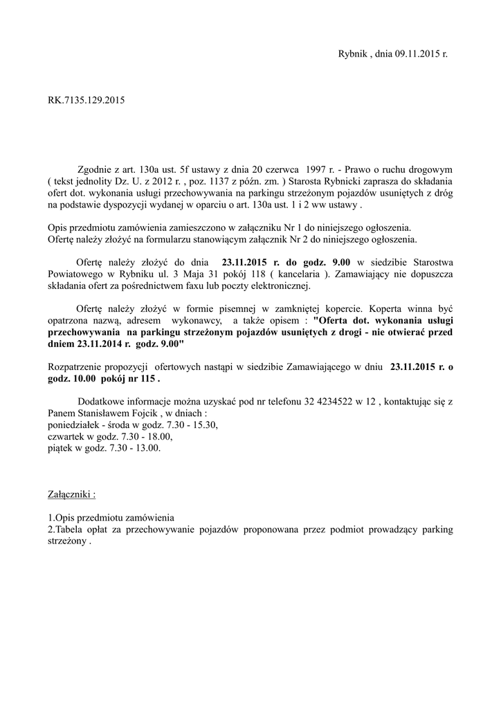 Rybnik , dnia 09.11.2015 r. RK.7135.129.2015 Zgodnie z art. 130a ust. 5f ustawy z dnia 20 czerwca 1997 r. - Prawo o ruchu drogowym ( tekst jednolity Dz. U. z 2012 r. , poz. 1137 z późn. zm. ) Starosta Rybnicki zaprasza do składania ofert dot. wykonania usługi przechowywania na parkingu strzeżonym pojazdów usuniętych z dróg na podstawie dyspozycji wydanej w oparciu o art. 130a ust. 1 i 2 ww ustawy . Opis przedmiotu zamówienia zamieszczono w załączniku Nr 1 do niniejszego ogłoszenia. Ofertę należy złożyć na formularzu stanowiącym załącznik Nr 2 do niniejszego ogłoszenia. Ofertę należy złożyć do dnia 23.11.2015 r. do godz. 9.00 w siedzibie Starostwa Powiatowego w Rybniku ul. 3 Maja 31 pokój 118 ( kancelaria ). Zamawiający nie dopuszcza składania ofert za pośrednictwem faxu lub poczty elektronicznej. Ofertę należy złożyć w formie pisemnej w zamkniętej kopercie. Koperta winna być opatrzona nazwą, adresem wykonawcy, a także opisem : "Oferta dot. wykonania usługi przechowywania na parkingu strzeżonym pojazdów usuniętych z drogi - nie otwierać przed dniem 23.11.2014 r. godz. 9.00" Rozpatrzenie propozycji ofertowych nastąpi w siedzibie Zamawiającego w dniu 23.11.2015 r. o godz. 10.00 pokój nr 115 . Dodatkowe informacje można uzyskać pod nr telefonu 32 4234522 w 12 , kontaktując się z Panem Stanisławem Fojcik , w dniach : poniedziałek - środa w godz. 7.30 - 15.30, czwartek w godz. 7.30 - 18.00, piątek w godz. 7.30 - 13.00. Załączniki : 1.Opis przedmiotu zamówienia 2.Tabela opłat za przechowywanie pojazdów proponowana przez podmiot prowadzący parking strzeżony . Załącznik Nr 1 do ogłoszenia z dnia 09.11.2015 r. dot. wykonania usługi przechowywania pojazdów na parkingu strzeżonym Opis przedmiotu zamówienia 1.Przedmiotem zamówienia jest przechowywanie na parkingu strzeżonym pojazdów usuniętych z dróg na podstawie art. 130a ustawy z dnia 20 czerwca 1997 r. - Prawo o ruchu drogowym w tym pojazdów typu : rower , motorower , motocykl , pojazd o dopuszczalnej masie całkowitej do 3,5 t , pojazd o pojazd o dopuszczalnej masie całkowitej powyżej 3,5 t do 7,5 t , pojazd o dopuszczalnej masie całkowitej powyżej 7,5 t do 16 t , pojazd o dopuszczalnej masie całkowitej powyżej 16 t . 2.Termin realizacji usługi : w okresie od dnia 01.01.2016 r do dnia 31.12.2016 r. , możliwość przechowania całodobowo przez 7 dni w tygodniu . 3.Wykonawca zobowiązany jest dysponować parkingiem spełniającym następujące wymogi : a) powierzchnia umożliwiająca przechowywanie co najmniej 20 samochodów osobowych i 2 pojazdów ciężarowych jednocześnie , b) nawierzchnia parkingu utwardzona , c) całodobowy dozór osobowy ( wymagana obecność osoby dozorującej parking na terenie parkingu 24 godz. na dobę ) , d) oświetlony , ogrodzony , e) zamykany w sposób uniemożliwiający wjazd i wyjazd pojazdu bez zezwolenia osoby dozorującej . 4.Wykonawca zobowiązany będzie : a) do odbioru przez całą dobę , 7 dni w tygodniu pojazdów usuniętych z dróg w trybie art. 130a ust. 1 i 2 ustawy – Prawo o ruchu drogowym , b) do dokonywania pokwitowań odbioru pojazdu wobec podmiotu usuwającego pojazd , c) do przyjęcia i zabezpieczenia przed dostępem osób postronnych dokumentów i kluczyków usuniętego pojazdu , d) do prowadzenia ewidencji przechowywanych pojazdów obejmującej następujące dane: data i godz. przyjęcia pojazdu na parking , nr rejestr. pojazdu ( w razie braku tablic rejestr. - nr VIN ) , marka pojazdu , data i godz. wydania pojazdu z parkingu , e) do przechowywania każdego przekazanego pojazdu w sposób zabezpieczający ten pojazd przed uszkodzeniem lub zniszczeniem , f) do wydawania pojazdu z parkingu wyłącznie za pisemną zgodą oraz na każde żądanie Starosty Rybnickiego , g) do pobierania od właścicieli pojazdów opłat należnych na rzecz Powiatu Rybnickiego za przechowywanie pojazdów . Wykonanie tej czynności dopuszcza się w dniach, kiedy właściciel pojazdu nie może dokonać wpłaty w kasie Starostwa Powiatowego tzn. w dniach powszednich po godzinach urzędowania Starostwa Powiatowego w Rybniku oraz w każdą sobotę i niedzielę oraz w święta. Przyjęcie wpłaty dokumentowane będzie na kwitariuszu przychodowym pobranym przez Wykonawcę w Wydziale Finansowym Starostwa Powiatowego w Rybniku . Oryginał pokwitowania wpłaty otrzymuje wpłacający , jedną kopie otrzymuje Wydział Komunikacji Starostwa Powiatowego w Rybniku , druga kopia pozostaje w kwitariuszu do rozliczenia w Wydziale Finansowym Starostwa Powiatowego w Rybniku. Kwitariusze anulowane bądź błędnie wypełnione należy zwrócić wraz z rozliczeniem . Z pobranych kwitariuszy Wykonawca będzie się rozliczał w Wydziale Finansowym Starostwa Powiatowego w Rybniku na koniec każdego miesiąca , h) do dokonywania wpłat w kasie Starostwa Powiatowego w Rybniku lub na rachunek bankowy w terminie 7 dni po odebraniu przez wpłacającego pobranej opłaty , i) do wydania pojazdu zatrzymanego przez inspektorów ITD po ustaniu przyczyny zatrzymania i po opłaceniu opłaty za holowanie ( pilotowanie ) i za parking oraz po otrzymaniu zezwolenia z ITD by pojazd mógł zostać wydany , j) do wydania pojazdu zatrzymanego przez Policję po ustaniu przyczyny zatrzymania tj. po opłaceniu opłaty za holowanie ( pilotowanie ) i za parking , oraz po otrzymaniu zezwolenia z Policji by pojazd mógł zostać wydany . k) do przekazania niezwłocznie informacji o wydanym pojeździe z parkingu strzeżonego do Starostwa Powiatowego w Rybniku w godzinach pracy urzędu . 5.Ceny zaoferowane w załączniku Nr 2 nie mogą przekroczyć stawek określonych uchwałą Nr XLIV/270/14 Rady Powiatu Rybnickiego z dnia 30 października 2014 r. w sprawie ustalenia wysokości opłat za ustalenia wysokości opłat za usuwanie pojazdów z drogi i ich przechowywanie na parkingu strzeżonym oraz wysokości kosztów w przypadku odstąpienia od wykonania dyspozycji usunięcia pojazdu opublik