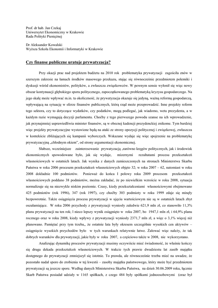 Prof. dr hab. Jan Czekaj Uniwersytet Ekonomiczny w Krakowie Rada Polityki Pieniężnej Dr Aleksander Kowalski Wyższa Szkoła Ekonomii i Informatyki w Krakowie Czy finanse publiczne uratuje prywatyzacja? Przy okazji prac nad projektem budżetu na 2010 rok problematyka prywatyzacji zagościła znów w szerszym zakresie na łamach środków masowego przekazu, stając się równocześnie przedmiotem polemiki i dyskusji wśród ekonomistów, polityków, a zwłaszcza związkowców. W pewnym sensie wyłonił się więc nowy obszar kontynuacji głębokiego sporu politycznego, zapoczątkowanego problematyką kryzysu gospodarczego. Na jego skalę może wpływać m.in. ta okoliczność, że prywatyzacja okazuje się jedyną, ważną reformą gospodarczą, wpływającą na sytuację w sferze finansów publicznych, którą rząd może przeprowadzić. Inne projekty reform tego sektora, czy to dotyczące wydatków, czy podatków, mogą podlegać, jak wiadomo, wetu prezydenta, a w każdym razie wymagają decyzji parlamentu. Choćby z tego pierwszego powodu szanse na ich wprowadzenie, jak przynajmniej usprawiedliwia minister finansów, są w obecnej kadencji prezydenckiej znikome. Tym bardziej więc projekty prywatyzacyjne wystawione będą na ataki ze strony opozycji politycznej i związkowej, zwłaszcza w kontekście zbliżających się kampanii wyborczych. Wskazane wydaje się więc spojrzenie na problematykę prywatyzacyjną „chłodnym okiem”, od strony argumentacji ekonomicznej. Słabsze, wcześniejsze zainteresowanie prywatyzacją ,zarówno kręgów politycznych, jak i środowisk ekonomicznych spowodowane było, jak się wydaje, mizernymi rezultatami procesu przekształceń własnościowych w ostatnich latach. Jak wynika z danych zamieszczonych na stronach Ministerstwa Skarbu Państwa w roku 2006 procesem przekształceń własnościowych objęto 32; w roku 2007 – 62, natomiast w roku 2008 dokładnie 100 podmiotów. Ponieważ do końca I połowy roku 2009 procesom przekształceń własnościowych poddano 38 podmiotów, można zakładać, że po niewielkim wzroście w roku 2008, sytuacja normalizuje się na niezwykle niskim poziomie. Czasy, kiedy przekształceniami własnościowymi obejmowano 425 podmiotów (rok 1996), 347 (rok 1997), czy choćby 303 podmioty w roku 1999 zdaje się minęły bezpowrotnie. Także osiągnięcia procesu prywatyzacji w ujęciu wartościowym nie są w ostatnich latach zbyt oszałamiające. W roku 2006 przychody z prywatyzacji wyniosły zaledwie 621,9 mln zł, co stanowiło 11,3% planu prywatyzacji na ten rok; l nieco lepszy wynik osiągnięto w roku 2007, bo 1947,1 mln zł, i 64,9% planu rocznego oraz w roku 2008, kiedy wpływy z prywatyzacji wyniosły 2371,7 mln zł, a więc o 3,1% więcej niż planowano. Pamiętać przy tym trzeba,, że ostatnie lata były okresem szczególnie wysokich cen aktywów – osiągnięcie wysokich przychodów było w tych warunkach relatywnie łatwe. Żałować więc należy, że tak dobrych warunków dla prywatyzacji, jakie były w roku 2007, a częściowo także w 2008, nie wykorzystano. Analizując dynamikę procesów prywatyzacji musimy oczywiście mieć świadomość, że właśnie kończy się druga dekada przekształceń własnościowych. W trakcie tych prawie dwudziestu lat zasób majątku dostępnego do prywatyzacji zmniejszył się istotnie. To prawda, ale równocześnie trzeba mieć na uwadze, że pozostało nadal sporo do zrobienia w tej kwestii – zasoby majątku państwowego, który może być przedmiotem prywatyzacji są jeszcze spore. Według danych Ministerstwa Skarbu Państwa, na dzień 30.06.2009 roku, łącznie Skarb Państwa posiadał udziały w 1165 spółkach, z czego 484 były spółkami jednoosobowymi (oraz był właścicielem 70 przedsiębiorstw państwowych, które w tym rachunku pomijamy). Liczby te oczywiście nie mogą stanowić same w sobie odpowiedniej wymowy, gdyż wymagają jakiegoś punktu odniesienia. W tym kontekście można zauważyć, że na koniec 2004 roku Skarb Państwa posiadał udziały w 1534 spółkach, z tego 456 było spółkami jednoosobowymi, czyli de facto spółkami, w których proces przekształceń własnościowych jeszcze się nie rozpoczął. Do 30 czerwca 2009 roku liczba jednoosobowych spółek Skarbu Państwa zwiększyła się do 484. Nie wnikając w szczegółową analizę przyczyn tego stanu rzeczy można zauważyć, że przyrost liczby jednoosobowych spółek skarbu państwa od końca 2004 roku wynika stąd, że szereg przedsiębiorstw państwowych zostało w tym okresie skomercjalizowanych (przekształconych w spółki kapitałowe), a jednocześnie nie rozpoczęto w stosunku do nich rzeczywistej prywatyzacji. To skłania nas do postawienia hipotezy, że decydenci prywatyzacji niechętnie podejmują takie projekty, które oznaczałyby poddanie procesom prywatyzacji przedsiębiorstw (spółek), w stosunku do których proces prywatyzacji nie został rozpoczęty. Przychody z prywatyzacji w ostatnich latach były realizowane głównie w wyniku kontynuowania prywatyzacji rozpoczętych w poprzednich latach. To nie musi brzmieć jak zarzut, gdyż trzeba mieć świadomość, że wśród jednoosobowych spółek Skarbu Państwa znajdują się również takie, które są na granicy bankructwa – ich prywatyzacja de facto oznaczałaby likwidację. Sytuacja w zakresie dynamiki prywatyzacji oraz jej medialnego wymiaru uległa zmianie, jak już zauważono wcześniej, dopiero ostatnio w związku z przedstawionym przez rząd projektem budżetu państwa oraz planem prywatyzacji, który ma w znacznej mierze sfinansować deficyt budżetowy w latach 2009-2010. Przewidywane przychody z prywatyzacji w latach 2009 – 2010 mają sięgać kwoty 36,7 mld zł. Ponieważ według stanu na dzień 30 czerwca 2009 roku przychody z prywatyzacji wyniosły niecałe 650 mln zł, dlatego można oczekiwać, że zdecydowana większość tych przychodów zostanie osiągnięta w roku 2010. Nie mając szczegółowy
