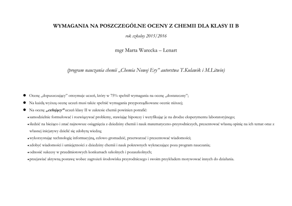 WYMAGANIA NA POSZCZEGÓLNE OCENY Z CHEMII DLA KLASY II B rok szkolny 2015/2016 mgr Marta Warecka – Lenart (program nauczania chemii „Chemia Nowej Ery” autorstwa T.Kulawik i M.Litwin) Ocenę „dopuszczający” otrzymuje uczeń, który w 75% spełnił wymagania na ocenę „dostateczny”; Na każdą wyższą ocenę uczeń musi także spełnić wymagania przyporządkowane ocenie niższej; Na ocenę „celujący” uczeń klasy II w zakresie chemii powinien potrafić: samodzielnie formułować i rozwiązywać problemy, stawiając hipotezy i weryfikując je na drodze eksperymentu laboratoryjnego; śledzić na bieżąco i znać najnowsze osiągnięcia z dziedziny chemii i nauk matematyczno-przyrodniczych, prezentować własną opinię na ich temat oraz z własnej inicjatywy dzielić się zdobytą wiedzą; wykorzystując technologię informacyjną, celowo gromadzić, przetwarzać i prezentować wiadomości; zdobyć wiadomości i umiejętności z dziedziny chemii i nauk pokrewnych wykraczające poza program nauczania; odnosić sukcesy w przedmiotowych konkursach szkolnych i pozaszkolnych; przejawiać aktywną postawę wobec zagrożeń środowiska przyrodniczego i swoim przykładem motywować innych do działania. WYMAGANIA SZCZEGÓŁOWE Z PODSTAWY PROGRAMOWEJ DLA III ETAPU EDUKACYJNEGO: KWASY I WODOROTLENKI. Uczeń: 6.6. Wskazuje na zastosowania wskaźników (fenoloftaleiny, papierka uniwersalnego); rozróżnia doświadczalnie kwasy i zasady za pomocą wskaźników 6.1. zapisuje wzory sumaryczne najprostszych kwasów: HCl, H 2S, H2SO3, H2SO4, HNO3, H2CO3, H3PO4 6.1. definiuje pojęcie kwasu 6.2. opisuje budowę kwasów 6.3. planuje i/lub wykonuje doświadczenia, w wyniku których można otrzymać kwas beztlenowy i tlenowy; zapisuje odpowiednie równania reakcji 6.4. opisuje właściwości i wynikające z nich zastosowania kwasów 6.5. wyjaśnia, na czym polega dysocjacja elektrolityczna kwasów; zapisuje równania dysocjacji elektrolitycznej kwasów; definiuje kwasy (zgodnie z teorią Arrheniusa) 6.1. zapisuje wzory sumaryczne najprostszych wodorotlenków: NaOH, KOH, Ca(OH) 2, Al(OH)3 6.1. definiuje pojęcie wodorotlenku 6.2. opisuje budowę wodorotlenków 6.3. planuje i/lub wykonuje doświadczenia, w wyniku których można otrzymać wodorotlenek (np. NaOH, Ca(OH) 2, Al(OH)3; zapisuje odpowiednie równania reakcji 6.4. opisuje właściwości i wynikające z nich zastosowania wodorotlenków 6.5. wyjaśnia, na czym polega dysocjacja elektrolityczna wodorotlenków; zapisuje równania dysocjacji elektrolitycznej wodorotlenków; definiuje wodorotlenki (zgodnie z teorią Arrheniusa) 6.7. wymienia rodzaje odczynu roztworu i przyczyny odczynu kwasowego, zasadowego i obojętnego 6.8. interpretuje wartość pH w ujęciu jakościowym (odczyn kwasowy, zasadowy, obojętny); wykonuje doświadczenie, które pozwoli zbadać pH produktów występujących w życiu codziennym człowieka (żywność, środki czystości itp.) Dostateczny (2+3) Dobry (2+3+4) Bardzo dobry (2+3+4+5) KWASY I WODOROTLENKI wie, jakie wymagania i sposób oceniania będzie stosował nauczyciel podaje podstawowe zasady bhp i skutki nieprzestrzegania tych zasad określa, co to są wskaźniki, elektrolity i nieelektrolity wie, jak zbudowane są cząsteczki kwasów podaje wzory kwasu siarkowodorowego i chlorowodorowego buduje modele cząsteczek podaje wzory kwasów: siarkowego (IV) i (VI) buduje modele cząsteczek wie, że zanieczyszczenie powietrza tlenkiem siarki (IV) jest przyczyną kwaśnych deszczy zna właściwości i zastosowania kwasów zna wzory kwasów: fosforowego (V), azotowego (V), węglowego (IV), ich właściwości i zastosowania wie, dlaczego roztwory niektórych substancji przewodzą prąd elektryczny wie, jak przebiega dysocjacja kwasów określa i odróżnia kationy i aniony wie, jak zbudowane są cząsteczki wodorotlenków wie, co to są tlenki zasadowe stosuje zasady bhp w pracowni podaje przykłady wskaźników, elektrolitów i nieelektrolitów zna sposoby otrzymywania i zastosowanie tych kwasów pisze wzory sumaryczne i strukturalne umie napisać równania reakcji otrzymywania z odpowiednich tlenków podaje wzory sumaryczne i strukturalne tlenków, z których powstają kwasy umie bezpiecznie rozcieńczyć stężony roztwór kwasu umie napisać równania reakcji otrzymywania z odpowiednich tlenków porównuje właściwości poznanych kwasów podaje wzory sumaryczne i strukturalne tlenków definiuje pojęcie: dysocjacja odczytuje równania reakcji dysocjacji umie napisać i zinterpretować ilościowo równanie otrzymywania wodorotlenku sodu z sodu układa równania reakcji otrzymywania zasad z odpowiednich tlenków umie napisać równania reakcji otrzymywania wodorotlenków z tlenków uzasadnia konieczność zachowania warunków bezpieczeństwa określa rodzaj substancji, używając odpowiednich wskaźników zapisuje równania reakcji otrzymywania układa równania reakcji zachodzących podczas otrzymywania kwasu siarkowego (VI) z siarki uzasadnia sposób rozcieńczania stężonego kwasu planuje badania identyfikujące poznane kwasy wyjaśnia przyczynę odczynu kwasowego pisze i odczytuje równania reakcji dysocjacji kwasów oblicza zawartość procentową sodu (potasu) w podanej masie wodorotlenku wyjaśnia, dlaczego z wodorotlenkiem wapnia należy obchodzić się ostrożnie umie napisać równania reakcji otrzymywania zasad wyjaśnia przyczynę odczynu zasadowego wskazuje zależność między wartością pH, stężeniem jonów wodorowych a odczynem roztworu pisze jonowo reakcje zobojętniania wskazuje tlenki kwasowe i zasadowe spośród tlenków określa, jony typowe dla zasad identyfikuje zasadę za pomocą dowolnego wskaźnika podaje wzory sumaryczne i strukturalne oraz nazwy wodorotlenków buduje modele cząsteczek wie, jak zbudowane są cząsteczki tych wodorotlenków wie, że woda wapienna służy do identyfikacji CO2 buduje modele cząsteczek odróżnia i wskazuje kationy i aniony odczytuje równania reakcj