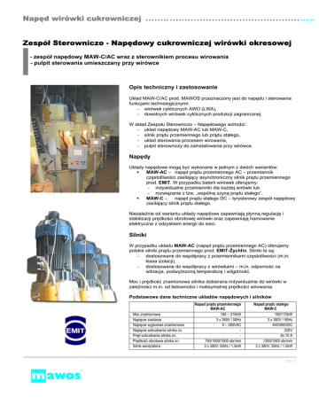 Napęd wirówki cukrowniczej Zespół Sterowniczo - Napędowy cukrowniczej wirówki okresowej - zespół napędowy MAW-C/AC wraz z sterownikiem procesu wirowania - pulpit sterowania umieszczany przy wirówce Opis techniczny i zastosowanie Układ MAW-C/AC prod. MAWOS przeznaczony jest do napędu i sterowania funkcjami technologicznymi: − wirówek cyklicznych AWO (LWA), − dowolnych wirówek cyklicznych produkcji zagranicznej. W skład Zespołu Sterowniczo – Napędowego wchodzi: − układ napędowy MAW-AC lub MAW-C, − silnik prądu przemiennego lub prądu stałego, − układ sterowania procesem wirowania, − pulpit sterowniczy do zainstalowania przy wirówce. Napędy Układy napędowe mogą być wykonane w jednym z dwóch wariantów: MAW-AC – napęd prądu przemiennego AC – przemiennik częstotliwości zasilający asynchroniczny silnik prądu przemiennego prod. EMIT. W przypadku baterii wirówek oferujemy: − indywidualne przemienniki dla każdej wirówki lub − rozwiązanie z tzw. „wspólną szyną prądu stałego”. MAW-C – napęd prądu stałego DC – tyrystorowy zespół napędowy zasilający silnik prądu stałego. Niezależnie od wariantu układy napędowe zapewniają płynną regulację i stabilizacji prędkości obrotowej wirówki oraz zapewniają hamowanie elektryczne z odzyskiem energii do sieci. Silniki W przypadku układu MAW-AC (napęd prądu przemiennego AC) oferujemy polskie silniki prądu przemiennego prod. EMIT-Żychlin. Silniki te są: − dostosowane do współpracy z przemiennikami częstotliwości (m.in. klasa izolacji), − dostosowane do współpracy z wirówkami – m.in. odporność na wibracje, podwyższoną temperaturę i wilgotność. Moc i prędkość znamionowa silnika dobierana indywidualnie do wirówki w zależności m.in. od ładowności i maksymalnej prędkości wirowania. Podstawowe dane techniczne układów napędowych i silników Moc znamionowa Napięcie zasilania Napięcie wyjściowe znamionowe Napięcie wzbudzenia silnika zn. Prąd wzbudzania silnika zn. Prędkość obrotowa silnika zn. Silnik wentylatora Napęd prądu przemiennego MAW-AC 160 – 315kW 3 x 380V / 50Hz 0 – 380VAC 750/1000/1500 obr/min 3 x 380V; 50Hz / 1,5kW Napęd prądu stałego MAW-C 160/170kW 3 x 380V / 50Hz 440/460VDC 220V do 10 A 1300/1500 obr/min 3 x 380V; 50Hz / 1,5kW 0111 Napęd wirówki cukrowniczej Sterowanie Niezależnie od rodzaju układu napędowego (AC/DC) układ sterowania procesem wirowania cukrowniczej wirówki okresowej zrealizowany jest w oparciu o sterownik SIMATIC S7 firmy SIEMENS. Układ sterowania posiada: − Oprogramowanie realizujące funkcje technologiczne. − Bogate oprogramowanie diagnostyczne umożliwiające identyfikację zakłóceń w pracy wirówek. − Możliwość włączenia układu w system blokad np.: od poziomu w rozdzielaczu, od załączenia przenośnika pod wirówkami, od ciśnienia powietrza. − Przystosowanie do współpracy z sekwencerem koordynującym pracę baterii wirówek. − Możliwość włączenie wirówki do nadrzędnego układu sterowania (nadzór z centralnej sterowni). Pulpit sterowniczy Obsługa wirówki prowadzona jest z pulpitu zainstalowanego przy wirówce. Podstawowe cechy pulpitu: Wysoki stopień szczelności. 2 rodzaje wyposażenia pulpitu: Specjalizowany panel foliowy produkcji MAWOS. Panel foliowy składa się z części synoptycznej informującej o stanie pracy wirówki oraz z przycisków, które umożliwiają sterowanie wirówką. Standardowy dotykowy, graficzny panel typu ’’Touch Panel’’ firmy SIEMENS. Niezależnie od wykonania panel umożliwia: Sterowanie wirówką w trybie automatycznym i ręcznym. Informowanie o stanie pracy wirówki (w tym dzięki bogatemu oprogramowaniu diagnostycznemu komunikowane jest miejsce i rodzaj zakłócenia w pracy wirówki). Zmianę wybranych parametrów technologicznych. Oprócz panela na pulpicie zainstalowane są dodatkowe aparaty: przełącznik "NAPĘD" - załączanie i wyłączanie napędu, przełącznik "SEKWENCER" - załączanie i wyłączanie sekwencera oraz sygnalizacja jego stanu, przycisk "HAMULEC" - załączanie hamulca mechanicznego, przycisk "WYŁĄCZNIK AWARYJNY" - wyłączenie awaryjne całego napędu. MAWOS Sp. z o.o. 92-614 Łódź, ul. Rokicińska 299/301 tel. (+48 42) 689 24 00 fax (+48 42) 689 24 01 e-mail: [email protected] Internet: www.mawos.com.pl PARTNER I DYSTRYBUTOR