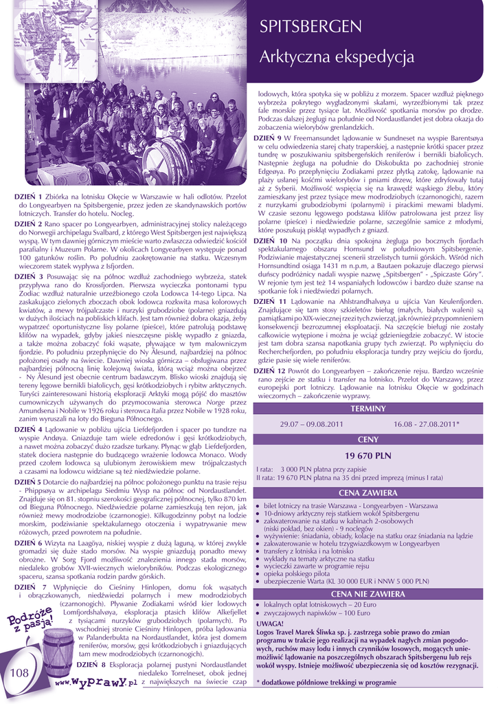 SPITSBERGEN Arktyczna ekspedycja lodowych, która spotyka się w pobliżu z morzem. Spacer wzdłuż pięknego wybrzeża pokrytego wygładzonymi skałami, wyrzeźbionymi tak przez fale morskie przez tysiące lat. Możliwość spotkania morsów po drodze. Podczas dalszej żeglugi na południe od Nordaustlandet jest dobra okazja do zobaczenia wielorybów grenlandzkich. DZIEŃ 1 Zbiórka na lotnisku Okęcie w Warszawie w hali odlotów. Przelot do Longyearbyen na Spitsbergenie, przez jeden ze skandynawskich portów lotniczych. Transfer do hotelu. Nocleg. DZIEŃ 9 W Freemansundet lądowanie w Sundneset na wyspie Barentsøya w celu odwiedzenia starej chaty traperskiej, a następnie krótki spacer przez tundrę w poszukiwaniu spitsbergeńskich reniferów i bernikli białolicych. Następnie żegluga na południe do Diskobukta po zachodniej stronie Edgeøya. Po przepłynięciu Zodiakami przez płytką zatokę, lądowanie na plaży usłanej kośćmi wielorybów i pniami drzew, które zdryfowały tutaj aż z Syberii. Możliwość wspięcia się na krawędź wąskiego źlebu, który zamieszkany jest przez tysiące mew modrodziobych (czarnonogich), razem z nurzykami grubodziobymi (polarnymi) i pirackimi mewami bladymi. W czasie sezonu lęgowego podstawa klifów patrolowana jest przez lisy polarne (pieśce) i niedźwiedzie polarne, szczególnie samice z młodymi, które poszukują piskląt wypadłych z gniazd. DZIEŃ 2 Rano spacer po Longyearbyen, administracyjnej stolicy należącego do Norwegii archipelagu Svalbard, z którego West Spitsbergen jest największą wyspą. W tym dawniej górniczym mieście warto zwłaszcza odwiedzić kościół DZIEŃ 10 Na początku dnia spokojna żegluga po bocznych fjordach spektakularnego obszaru Hornsund w południowym Spitsbergenie. parafialny i Muzeum Polarne. W okolicach Longyearbyen występuje ponad Podziwianie majestatycznej scenerii strzelistych turnii górskich. Wśród nich 100 gatunków roślin. Po południu zaokrętowanie na statku. Wczesnym Hornsundtind osiąga 1431 m n.p.m, a Bautaen pokazuje dlaczego pierwsi wieczorem statek wypływa z Isfjorden. duńscy podróżnicy nadali wyspie nazwę „Spitsbergen” - „Spiczaste Góry”. DZIEŃ 3 Posuwając się na północ wzdłuż zachodniego wybrzeża, statek W rejonie tym jest też 14 wspaniałych lodowców i bardzo duże szanse na przypływa rano do Krossfjorden. Pierwsza wycieczka pontonami typu spotkanie fok i niedźwiedzi polarnych. Zodiac wzdłuż naturalnie urzeźbionego czoła Lodowca 14-tego Lipca. Na zaskakująco zielonych zboczach obok lodowca rozkwita masa kolorowych DZIEŃ 11 Lądowanie na Ahlstrandhalvøya u ujścia Van Keulenfjorden. Znajdujące się tam stosy szkieletów bieług (małych, białych waleni) są kwiatów, a mewy trójpalczaste i nurzyki grubodziobe (polarne) gniazdują pamiątkami po XIX-wiecznej rzezi tych zwierząt, jak również przypomnieniem w dużych ilościach na pobliskich klifach. Jest tam również dobra okazja, żeby konsekwencji bezrozumnej eksploatacji. Na szczęście bieługi nie zostały wypatrzeć oportunistyczne lisy polarne (pieśce), które patrolują podstawę całkowicie wytępione i można je wciąż gdzieniegdzie zobaczyć. W istocie klifów na wypadek, gdyby jakieś nieszczęsne pisklę wypadło z gniazda, jest tam dobra szansa napotkania grupy tych zwierząt. Po wpłynięciu do a także można zobaczyć foki wąsate, pływające w tym malowniczym Recherchefjorden, po południu eksploracja tundry przy wejściu do fjordu, fjordzie. Po południu przepłynięcie do Ny Ålesund, najbardziej na północ gdzie pasie się wiele reniferów. położonej osady na świecie. Dawniej wioska górnicza – obsługiwana przez najbardziej północną linię kolejową świata, którą wciąż można obejrzeć DZIEŃ 12 Powrót do Longyearbyen – zakończenie rejsu. Bardzo wcześnie - Ny Ålesund jest obecnie centrum badawczym. Blisko wioski znajdują się rano zejście ze statku i transfer na lotnisko. Przelot do Warszawy, przez tereny lęgowe bernikli białolicych, gęsi krótkodziobych i rybitw arktycznych. europejski port lotniczy. Lądowanie na lotnisku Okęcie w godzinach Turyści zainteresowani historią eksploracji Arktyki mogą pójść do masztów wieczornych – zakończenie wyprawy. cumowniczych używanych do przymocowania sterowca Norge przez TERMINY Amundsena i Nobile w 1926 roku i sterowca Italia przez Nobile w 1928 roku, zanim wyruszali na loty do Bieguna Północnego. DZIEŃ 4 Lądowanie w pobliżu ujścia Liefdefjorden i spacer po tundrze na wyspie Andøya. Gniazduje tam wiele edredonów i gęsi krótkodziobych, a nawet można zobaczyć dużo rzadsze turkany. Płynąc w głąb Liefdefjorden, statek dociera następnie do budzącego wrażenie lodowca Monaco. Wody przed czołem lodowca są ulubionym żerowiskiem mew trójpalczastych a czasami na lodowcu widziane są też niedźwiedzie polarne. DZIEŃ 5 Dotarcie do najbardziej na północ położonego punktu na trasie rejsu - Phippsøya w archipelagu Siedmiu Wysp na północ od Nordaustlandet. Znajduje się on 81. stopniu szerokości geograficznej północnej, tylko 870 km od Bieguna Północnego. Niedźwiedzie polarne zamieszkują ten rejon, jak również mewy modrodziobe (czarnonogie). Kilkugodzinny pobyt na lodzie morskim, podziwianie spektakularnego otoczenia i wypatrywanie mew różowych, przed powrotem na południe. DZIEŃ 6 Wizyta na Laagöya, niskiej wyspie z dużą laguną, w której zwykle gromadzi się duże stado morsów. Na wyspie gniazdują ponadto mewy obrożne. W Sorg Fjord możliwość znalezienia innego stada morsów, niedaleko grobów XVII-wiecznych wielorybników. Podczas ekologicznego spaceru, szansa spotkania rodzin pardw górskich. DZIEŃ 7 Wpłynięcie do Cieśniny Hinlopen, domu fok wąsatych i obrączkowanych, niedźwiedzi polarnych i mew modrodziobych (czarnonogich). Pływanie Zodiakami wśród kier lodowych Lomfjordshalvøya, eksploracja ptasich klifów Alkefjellet z tysiącami nur