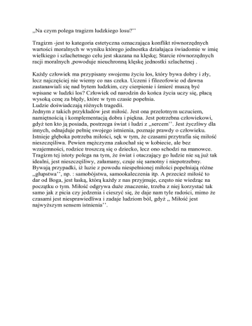 ,,Na czym polega tragizm ludzkiego losu?’’ Tragizm -jest to kategoria estetyczna oznaczająca konflikt równorzędnych wartości moralnych w wyniku którego jednostka działająca świadomie w imię wielkiego i szlachetnego celu jest skazana na klęskę; Starcie równorzędnych racji moralnych ,powoduje nieuchronną klęskę jednostki szlachetnej . Każdy człowiek ma przypisany swojemu życiu los, który bywa dobry i zły, lecz najczęściej nie wiemy co nas czeka. Uczeni i filozofowie od dawna zastanawiali się nad bytem ludzkim, czy cierpienie i śmierć muszą być wpisane w ludzki los? Człowiek od narodzin do końca życia uczy się, płacą wysoką cenę za błędy, które w tym czasie popełnia. Ludzie doświadczają różnych tragedii. Jednym z takich przykładów jest miłość. Jest ona przelotnym uczuciem, namiętnością i komplementacją dobra i piękna. Jest potrzebna człowiekowi, gdyż ten kto ją posiada, postrzega świat i ludzi z ,,sercem’’. Jest życzliwy dla innych, odnajduje pełnię swojego istnienia, poznaje prawdy o człowieku. Istnieje głęboka potrzeba miłości, sęk w tym, że czasami przytrafia się miłość nieszczęśliwa. Pewien mężczyzna zakochał się w kobiecie, ale bez wzajemności, rodzice troszczą się o dziecko, lecz ono schodzi na manowce. Tragizm tej istoty polega na tym, że świat i otaczający go ludzie nie są już tak idealni, jest nieszczęśliwy, załamany, czuje się samotny i niepotrzebny. Bywają przypadki, iż luzie z powodu niespełnionej miłości popełniają różne ,,głupstwa’’, np. : samobójstwa, samookaleczenia itp. A przecież miłość to dar od Boga, jest łaską, którą każdy z nas przyjmuje, często nie wiedząc na początku o tym. Miłość odgrywa duże znaczenie, trzeba z niej korzystać tak samo jak z picia czy jedzenia i cieszyć się, że daje nam tyle radości, mimo że czasami jest niesprawiedliwa i zadaje ludziom ból, gdyż ,, Miłość jest najwyższym sensem istnienia’’. Kolejnym przykładem ludzkich tragedii są choroby, te poważne i mniej. Zwalczaniem chorób u ludzi zajmuje się medycyna, poznawanie przyczyn chorób pozwala na zapobieganie im. Jednak nie zawsze się to udaje. Często mamy do czynienia z bardzo niebezpiecznymi dolegliwościami, które wymagają długotrwałego leczenia, nie do końca gwarantującego wyzdrowienie. Takie choroby jak choroby zakaźne, genetyczne czy psychiczne są trudnymi przypadkami, których leczenie lub nie leczenie może doprowadzić do śmierci człowieka. Ludzie cierpią z powodu chorób nie myśląc o najgorszym. Osoby przebywające z kimś chorym także martwią się o nich, o to, że mogą stracić kogoś bliskiego. Kataklizmy to również tragedie, które dotyczą losu ludzkiego. Powodują one znaczne szkody na terenie objętym tym zjawiskiem, pozostawiają po sobie często zmiany obrazu powierzchni ziemi, powodując też wysokie straty w gospodarce człowieka, a nawet mogąc zagrażać życiu ludzkiemu. Rozszalały żywioł potrafi w jednej chwili zniszczyć dorobek całego życia. Tsunami, pożary, wybuchy wulkanów i inne kataklizmy są nieszczęściem dla ludzi. Przynoszą tragedię, śmierć i zniszczenie, jednak są nieodłącznym elementem życia na naszej Ziemi. Następnym przykładem ludzkiej tragedii są uzależnienia. Są to nabyte, silne potrzeby wykonywania jakiejś czynności bądź zażywania jakiejś substancji. Niektóre osoby uzależnione walczą ze swoimi nałogami, lecz jest to bardzo trudne i często i kończy się niepowodzeniami. Istnieje mnóstwo rodzajów uzależnień. Są to uzależnienia od narkotyków, alkoholu, jedzenia, telewizji, Internetu, hazardu itd. Każde z tych uzależnień jest niebezpieczne i ich zwalczanie jest potrzebne, aby nie doprowadzić do przykrych wydarzeń w życiu człowieka. Walka z tym w dużej mierze zależy głównie od woli osoby uzależnionej. Jest tragedią również dla ją otaczających , podobnie jak u ludzi dotkniętych różnymi chorobami. Człowiek w swoim życiu ma wolny wybór i ponosi za to całkowitą odpowiedzialność. Ludzki los jest niepewny, od przeznaczenia nie uciekniemy, jakimi sposobami byśmy nie próbowali. Mazur Ewelina kl. Id THG.