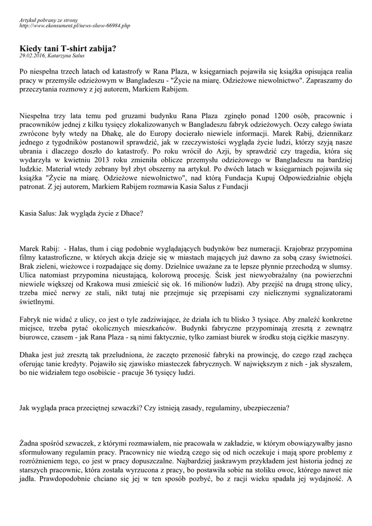 Artykuł pobrany ze strony http://www.ekonsument.pl/news-show-66984.php Kiedy tani T-shirt zabija? 29.02.2016, Katarzyna Salus Po niespełna trzech latach od katastrofy w Rana Plaza, w księgarniach pojawiła się książka opisująca realia pracy w przemyśle odzieżowym w Bangladeszu - "Życie na miarę. Odzieżowe niewolnictwo". Zapraszamy do przeczytania rozmowy z jej autorem, Markiem Rabijem. Niespełna trzy lata temu pod gruzami budynku Rana Plaza zginęło ponad 1200 osób, pracownic i pracowników jednej z kilku tysięcy zlokalizowanych w Bangladeszu fabryk odzieżowych. Oczy całego świata zwrócone były wtedy na Dhakę, ale do Europy docierało niewiele informacji. Marek Rabij, dziennikarz jednego z tygodników postanowił sprawdzić, jak w rzeczywistości wygląda życie ludzi, którzy szyją nasze ubrania i dlaczego doszło do katastrofy. Po roku wrócił do Azji, by sprawdzić czy tragedia, która się wydarzyła w kwietniu 2013 roku zmieniła oblicze przemysłu odzieżowego w Bangladeszu na bardziej ludzkie. Materiał wtedy zebrany był zbyt obszerny na artykuł. Po dwóch latach w księgarniach pojawiła się książka "Życie na miarę. Odzieżowe niewolnictwo", nad którą Fundacja Kupuj Odpowiedzialnie objęła patronat. Z jej autorem, Markiem Rabijem rozmawia Kasia Salus z Fundacji Kasia Salus: Jak wygląda życie z Dhace? Marek Rabij: - Hałas, tłum i ciąg podobnie wyglądających budynków bez numeracji. Krajobraz przypomina filmy katastroficzne, w których akcja dzieje się w miastach mających już dawno za sobą czasy świetności. Brak zieleni, wieżowce i rozpadające się domy. Dzielnice uważane za te lepsze płynnie przechodzą w slumsy. Ulica natomiast przypomina nieustającą, kolorową procesję. Ścisk jest niewyobrażalny (na powierzchni niewiele większej od Krakowa musi zmieścić się ok. 16 milionów ludzi). Aby przejść na drugą stronę ulicy, trzeba mieć nerwy ze stali, nikt tutaj nie przejmuje się przepisami czy nielicznymi sygnalizatorami świetlnymi. Fabryk nie widać z ulicy, co jest o tyle zadziwiające, że działa ich tu blisko 3 tysiące. Aby znaleźć konkretne miejsce, trzeba pytać okolicznych mieszkańców. Budynki fabryczne przypominają zresztą z zewnątrz biurowce, czasem - jak Rana Plaza - są nimi faktycznie, tylko zamiast biurek w środku stoją ciężkie maszyny. Dhaka jest już zresztą tak przeludniona, że zaczęto przenosić fabryki na prowincję, do czego rząd zachęca oferując tanie kredyty. Pojawiło się zjawisko miasteczek fabrycznych. W największym z nich - jak słyszałem, bo nie widziałem tego osobiście - pracuje 36 tysięcy ludzi. Jak wygląda praca przeciętnej szwaczki? Czy istnieją zasady, regulaminy, ubezpieczenia? Żadna spośród szwaczek, z którymi rozmawiałem, nie pracowała w zakładzie, w którym obowiązywałby jasno sformułowany regulamin pracy. Pracownicy nie wiedzą czego się od nich oczekuje i mają spore problemy z rozróżnieniem tego, co jest w pracy dopuszczalne. Najbardziej jaskrawym przykładem jest historia jednej ze starszych pracownic, która została wyrzucona z pracy, bo postawiła sobie na stoliku owoc, którego nawet nie jadła. Prawdopodobnie chciano się jej w ten sposób pozbyć, bo z racji wieku spadała jej wydajność. A wydajność to słowo klucz w Bangladeszu. Każdy pracownik ma do wyrobienia dziennie tzw. "target", czyli np. 960 rękawów doszytych do koszulek. Po katastrofie Rana Plaza właściciele firm boją się zostawiać pracowników po godzinach, dlatego do targetów doliczono w wielu fabrykach to, co szwaczki mogły wcześniej wykonać po godzinach, za dodatkowe pieniądze. Zdarza się, że pracownicy nie mogą ze sobą nawet rozmawiać, a sen przy maszynie kończy się usunięciem z pracy. Niektórzy właściciele fabryk ustalają też własne kuriozalne zasady, jak obowiązek uczestnictwa w jakichś wydarzeniach po godzinach, np. wiecach politycznych. Niewesoło robi się, jeśli pracownik poważniej zachoruje. Bywa, że właściciel fabryki pokryje cześć kosztów leczenia, ale małe są szanse na powrót do pracy, bo miejsce w tym czasie zajmuje ktoś inny. Czy szwaczki mają jakieś życie poza pracą? - Nie mają na nie zbyt wiele czasu. Po kilkunastu godzinach wyrabiania "targetów" n na przyjemności czy na życie rodzinne nie wystarcza po prostu dnia. Warunki mieszkaniowe są trudne lub bardzo trudne, przeciętna rodzina robotnicza złożona ze czterech-pięciu osób tłoczy się na co dzień w czymś, bo według naszych standardów przypomina bardziej blaszany garaż, niż mieszkanie. Nie wszystkich stać na prąd, wiele osiedli czeka nadal na skanalizowanie, coraz częściej brakuje też wody pitnej, bo w Dhace obniża się poziom wód gruntowych. Pomimo takich trudności mieszkańcy Bangladeszu w większości prezentują jednak poziom higieny, śmiem twierdzić, o niebo wyższy od polskiego. W zatłoczonym autobusie możesz zemdleć z braku powietrza, ale nie poczujesz smrodu przepoconych ubrań, jak latem w Krakowie. Czy po katastrofie w Rana Plaza coś się tam zmieniło? Przeprowadzono audyt bezpieczeństwa w ponad jednej czwartej fabryk, głównie tych największych i najnowocześniejszych. Kilkanaście zamknięto, inne mają czas na poprawę warunków. Pytanie czy te 27 proc. uznać za sukces, czy raczej porażkę, bo wydaje się niemal pewne, że do tych najgorszych zakładów kontrolerzy nigdy nie dotrą, bo nikt nie pozwoli im tam wejść. Kontrole narzucili przecież zachodni zleceniodawcy pod presją klientów, fabrykanci w Bangladeszu w większości nadal uważają, że “workers no problem" - jak mówił mi jeden z nich w 2013 r. A przecież do tych najgorszych zakładów czasem trafiają także zamówienia podzlecane przez duże fabryki. Działa też infolinia, gdzie pracownicy mogą anonimowo zgłosić nieprawidłowości. Od znajomych robiących interesy w Bangladeszu usłyszałem ostatnio, że podjęto dzięki niej już 19 